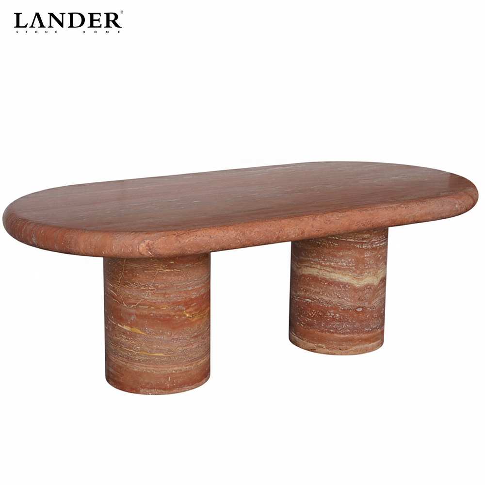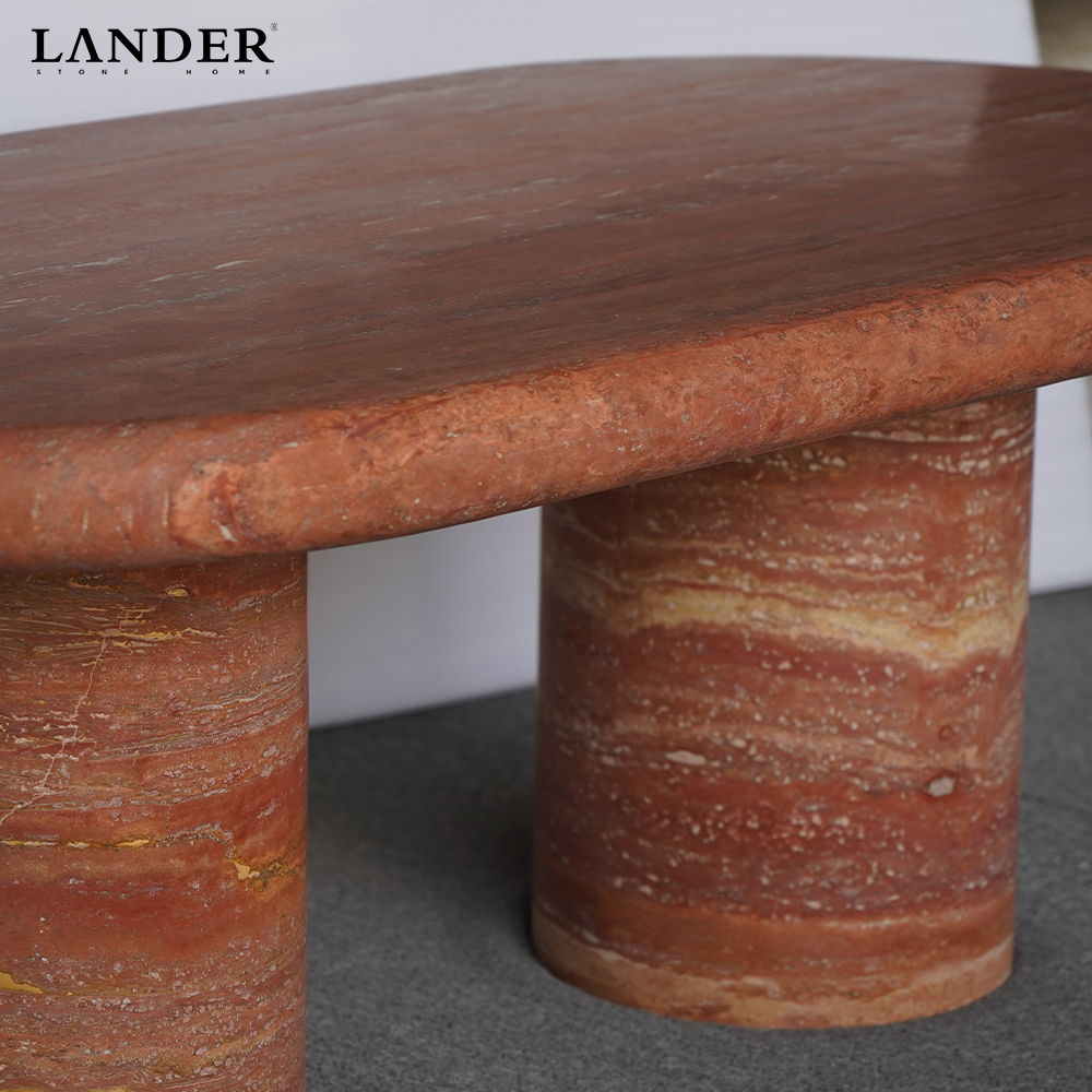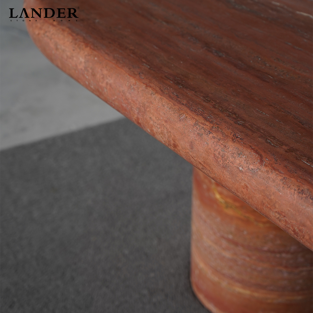 Rare Red Travertine Palette: Crafted from premium Red Travertine, featuring a rare and dramatic tapestry of terracotta and rust tones with rich natural banding, ensuring each table is a unique work of geological art.