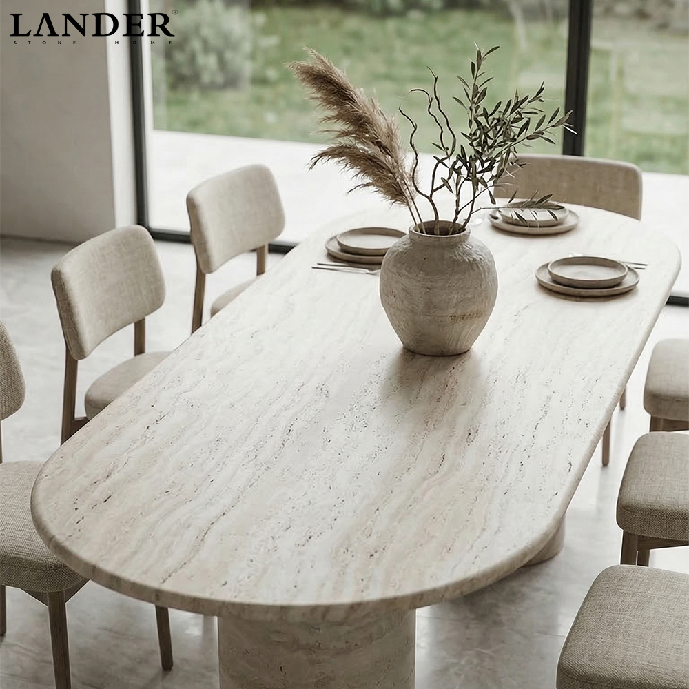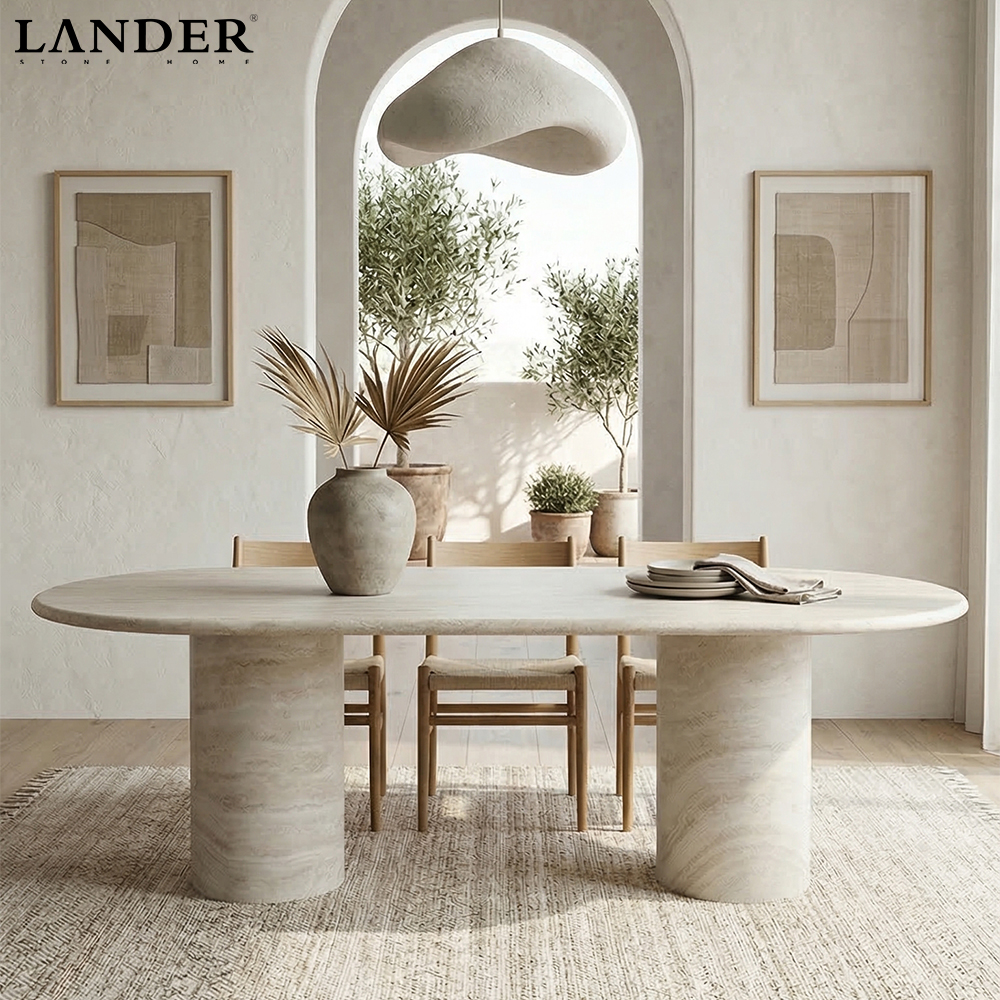 The 2.4m Beige Travertine Oval Marble Dining Table is a masterpiece of timeless architectural design, merging a soft, organic silhouette with the raw beauty of natural stone. Crafted from premium Beige Travertine, the expansive 2.4-meter oval desktop showcases a soothing palette of cream and sandy tones, highlighted by the stone’s characteristic porous texture and subtle horizontal veining. The elegant curves of the tabletop are grounded by two substantial, monolithic cylindrical pedestal legs, creating a balanced and stable form that exudes understated luxury. Perfect as a grand centerpice for high-end residential dining rooms or executive conference spaces, this table offers a sophisticated, earthy aesthetic that seamlessly complements both contemporary and Mediterranean-inspired interiors.