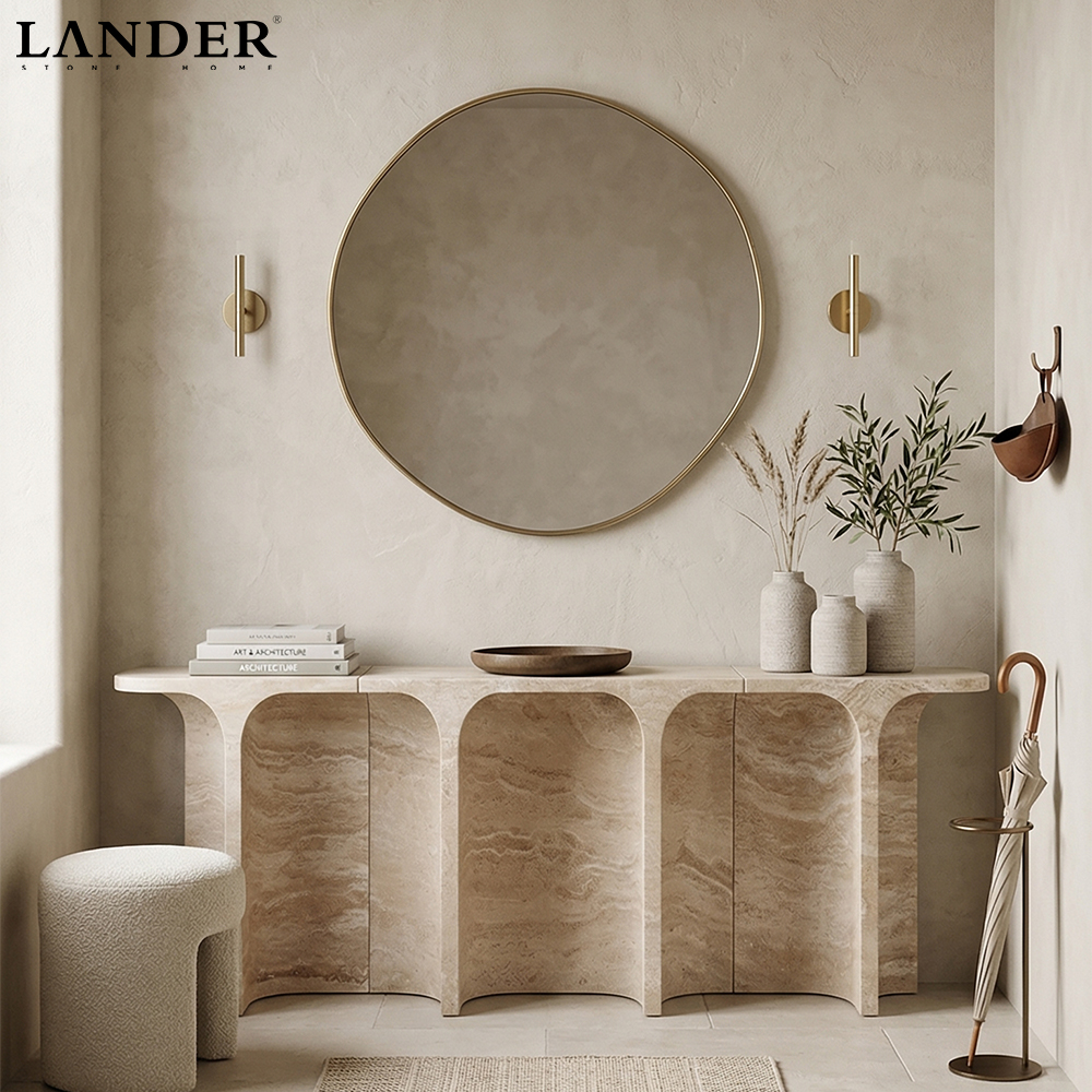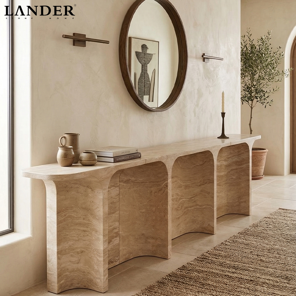 The 3 Meters Beige Travertine Marble Console Table showcases the natural beauty of beige travertine marble with its warm, earthy tones and distinctive texture. Handcrafted to perfection, the smooth, polished stone top offers both an elegant and durable surface, ideal for everyday use. Supported by sleek, minimalist metal legs, this expansive console table exudes modern sophistication while complementing a variety of interior styles. Its timeless design and versatile proportions make it a striking centerpiece, perfect for both contemporary and traditional settings.