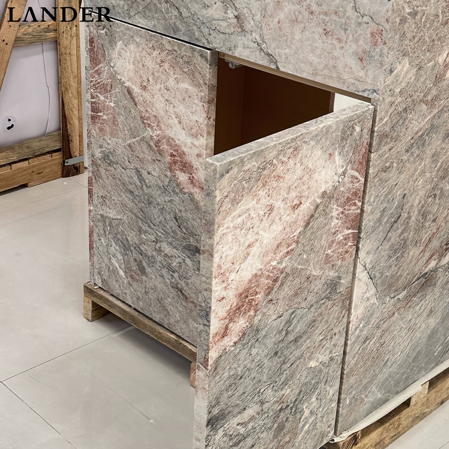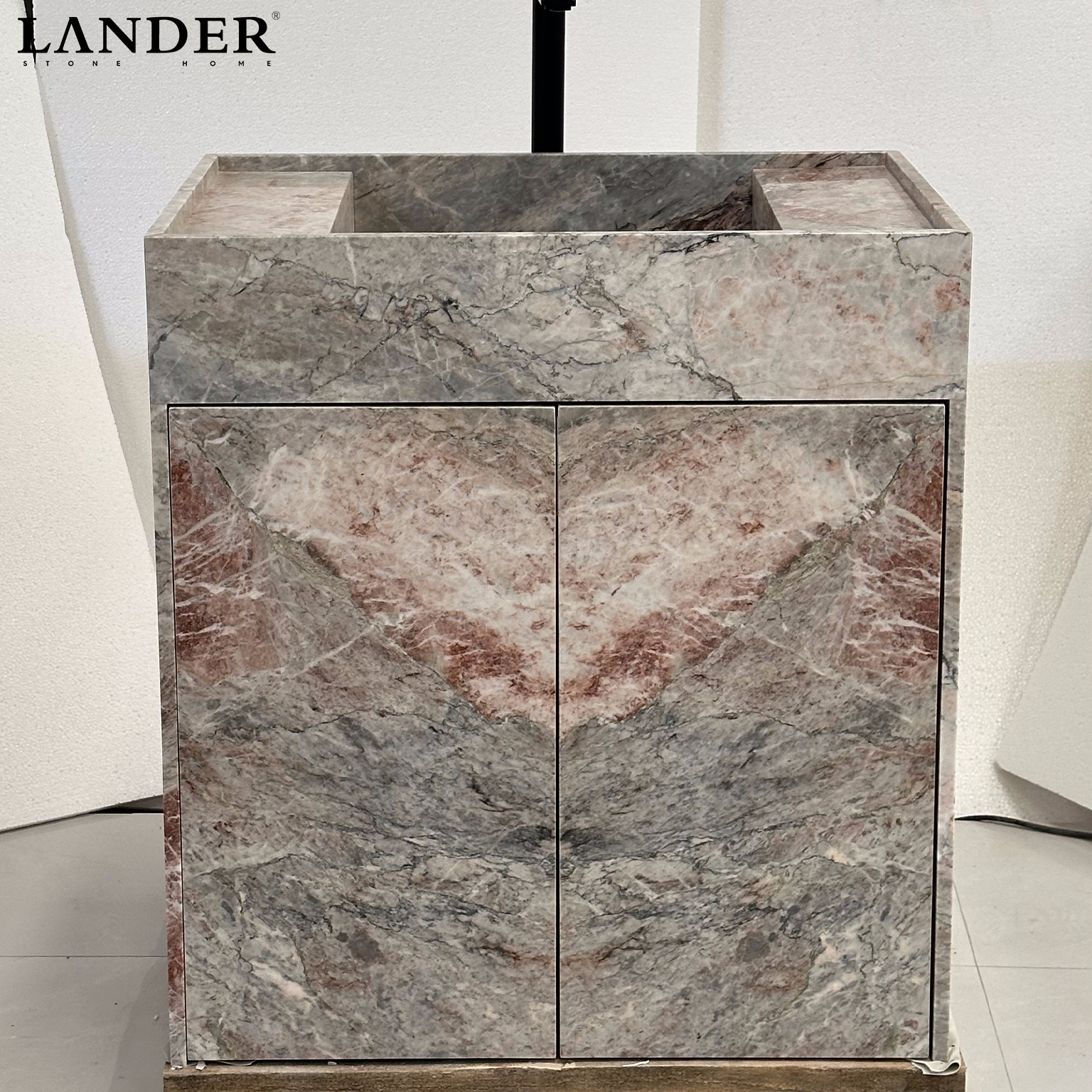 The Afyon Pink Marble Vanity is a sophisticated blend of ethereal color and structural precision. Carved from rare Afyon Pink marble, it features a soft, blush-toned canvas interlaced with delicate grey and crystalline veins. The cabinet faces showcase a masterful book-matched diamond pattern, highlighting the stone’s symmetrical natural beauty. This floor-standing vanity serves as a romantic yet modern focal point, perfect for upscale master baths, boutique powder rooms, and luxury residential suites.