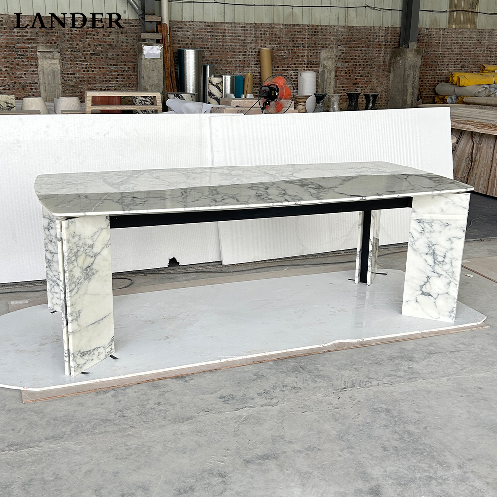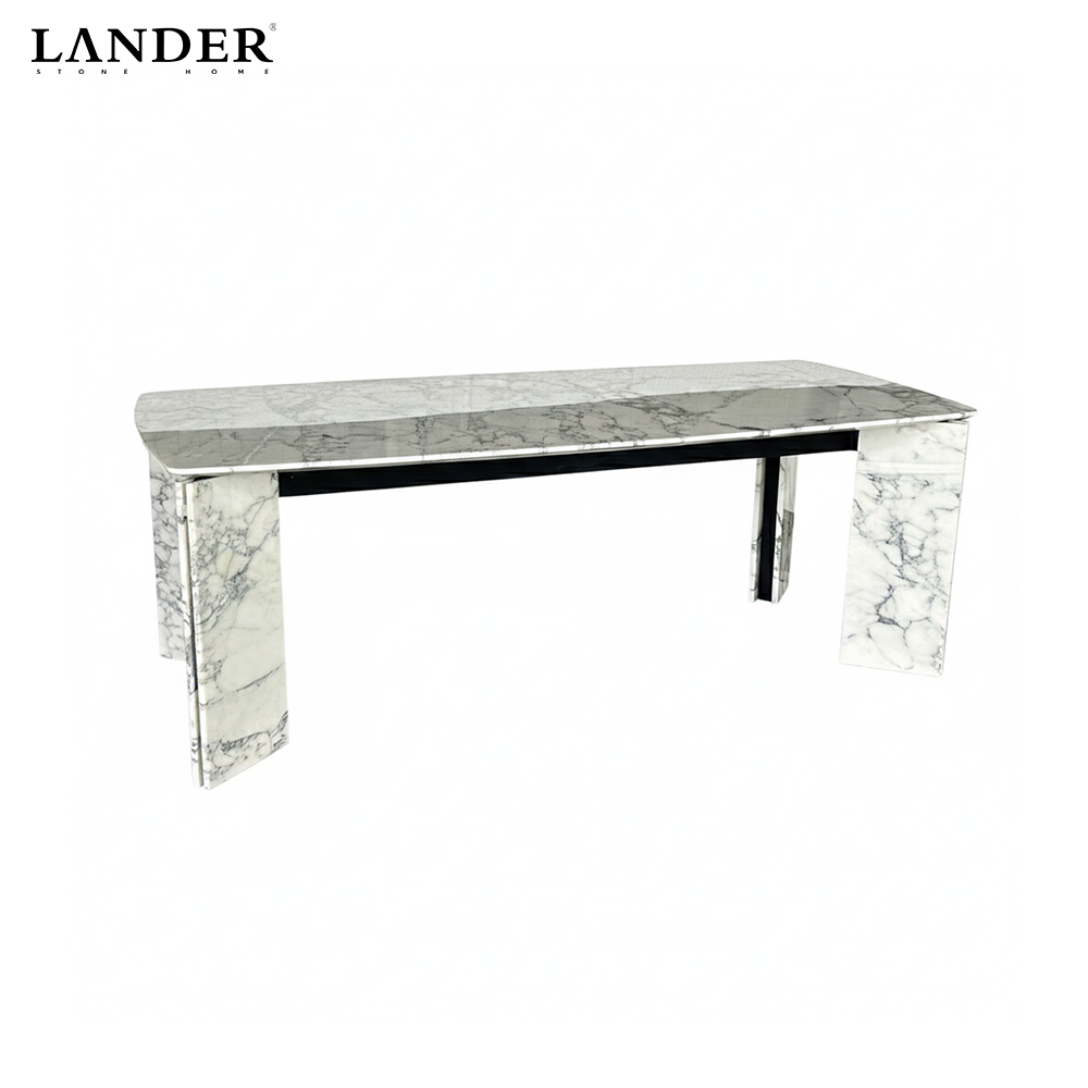 The Arabescato Marble Dining Table is an embodiment of classical Italian luxury reimagined for the modern home. Meticulously crafted from authentic Arabescato Marble, this exquisite table is defined by its signature dusty grey veining that forms large, flowing ovals against a pristine white crystalline background. The expansive, slim-profile tabletop features elegantly tapered ends, supported by architectural, wide-slab marble legs that create a monolithic and high-fashion silhouette. Polished to a high-gloss finish to enhance the stone’s natural translucency, this dining table serves as a breathtaking sculptural centerpiece. It is the ultimate choice for grand dining rooms and sophisticated interiors that demand a balance of organic artistry and timeless, high-end durability.