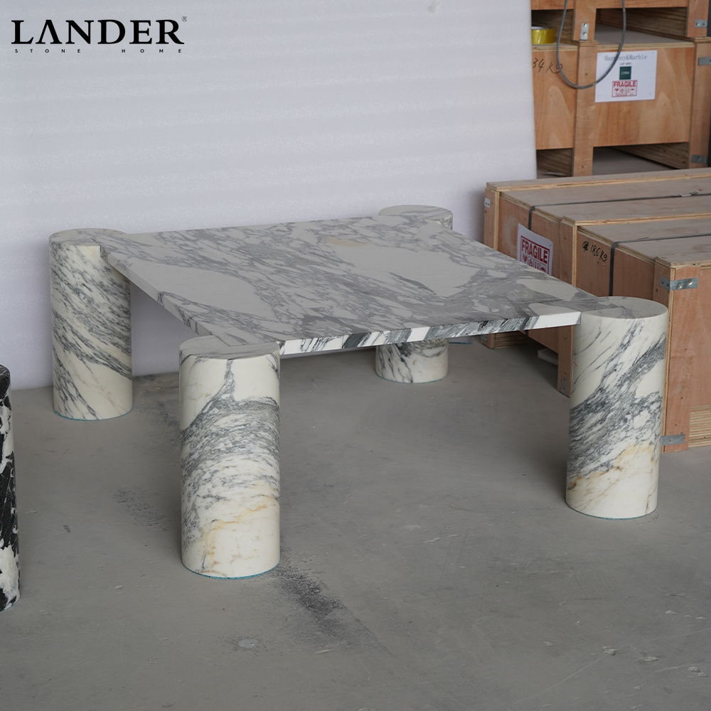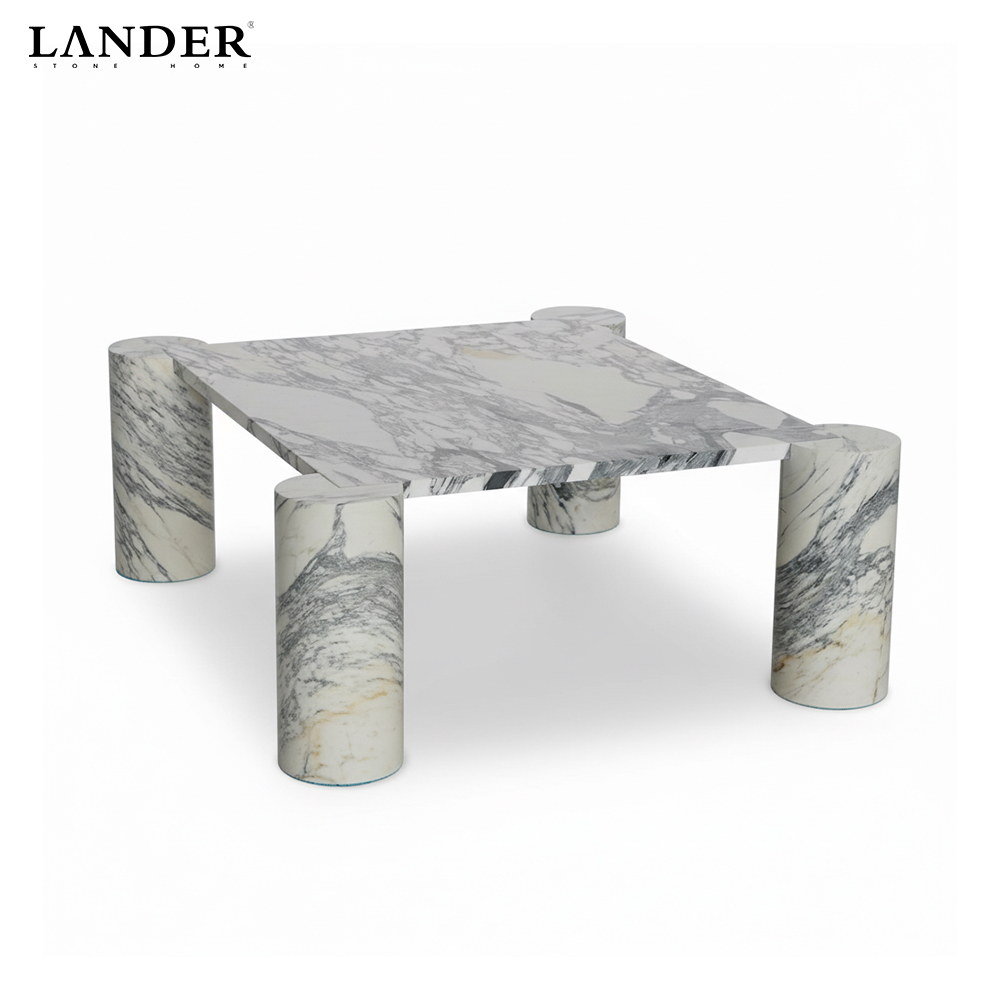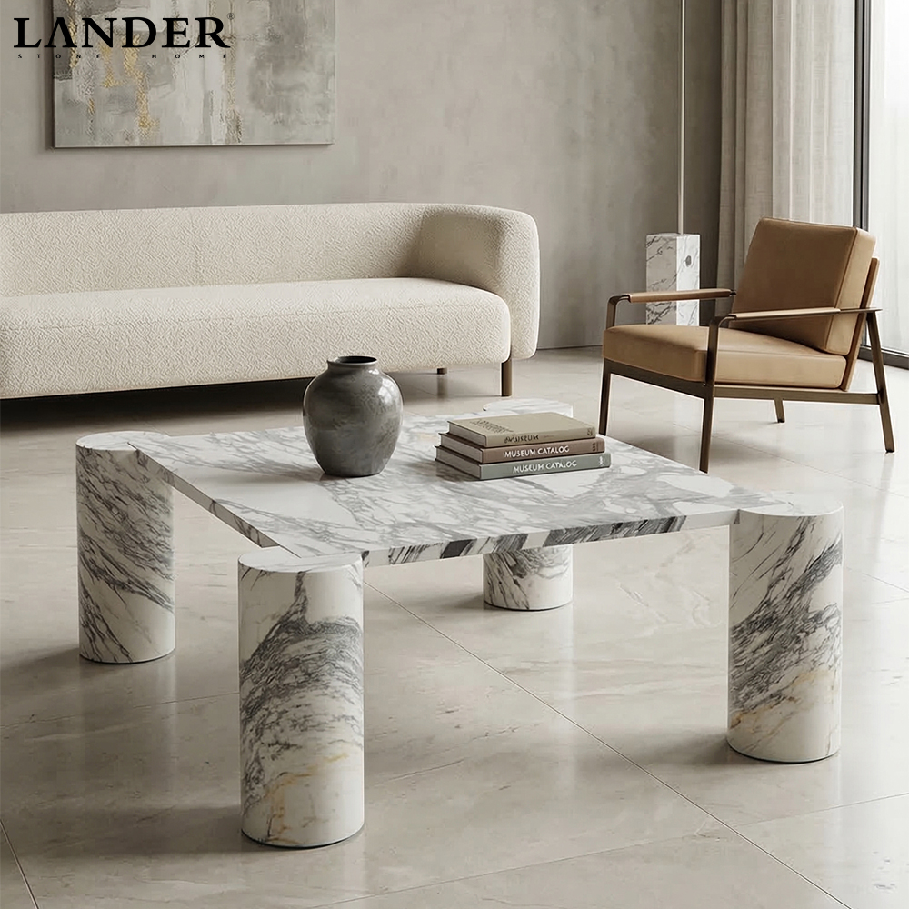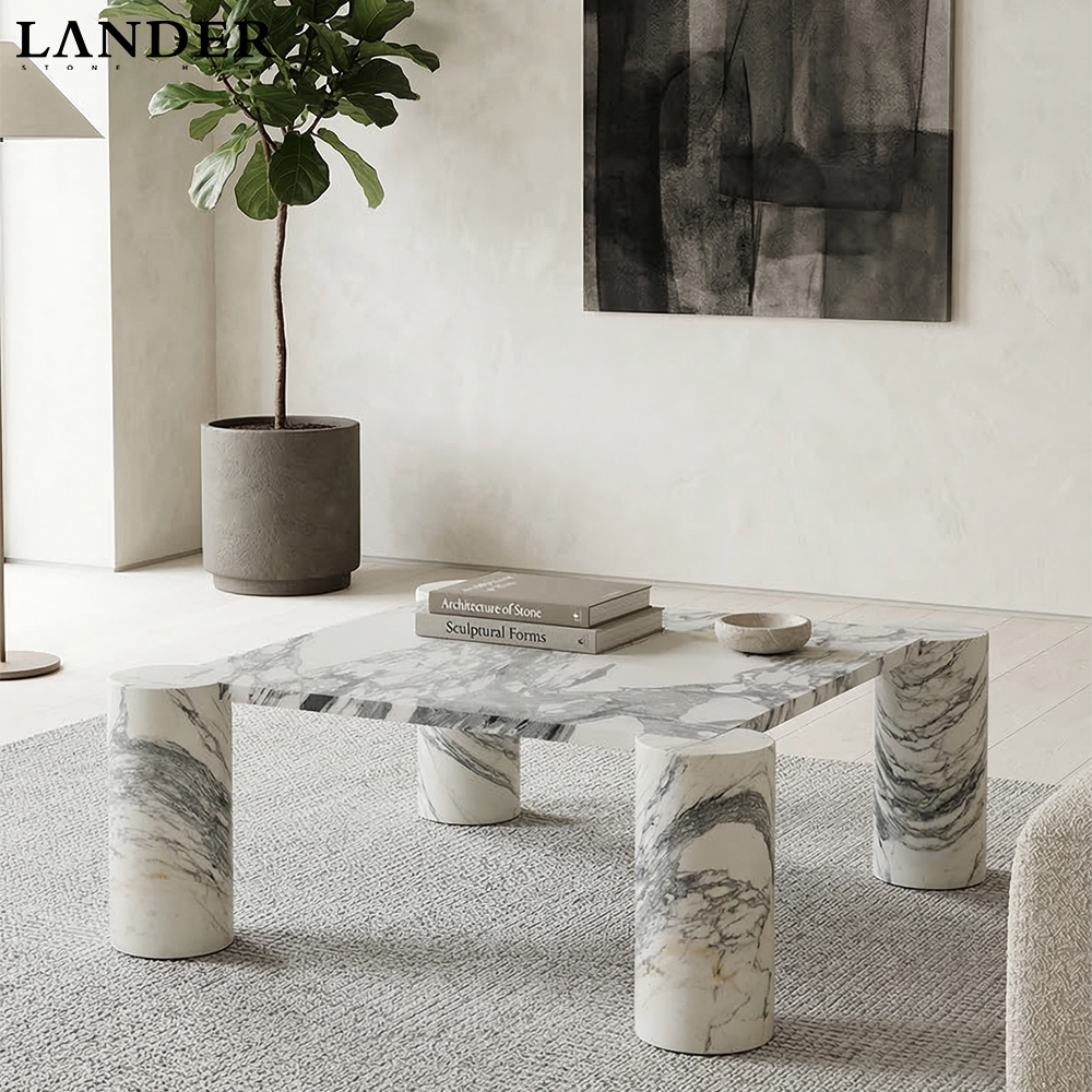 The Arabescato Square Marble Coffee Table with Column Legs pairs classic Italian Arabescato stone—marked by elegant grey veining on a luminous white ground—with a bold, square top and sculptural column legs. Hand-polished to a refined sheen, the sturdy marble surface offers heat resistance and long-lasting durability, while the architectural silhouette brings timeless sophistication to modern or traditional interiors. Each table’s natural veining is unique, creating a refined, gallery-worthy centerpiece for living rooms and lounge spaces.