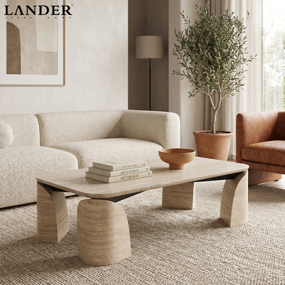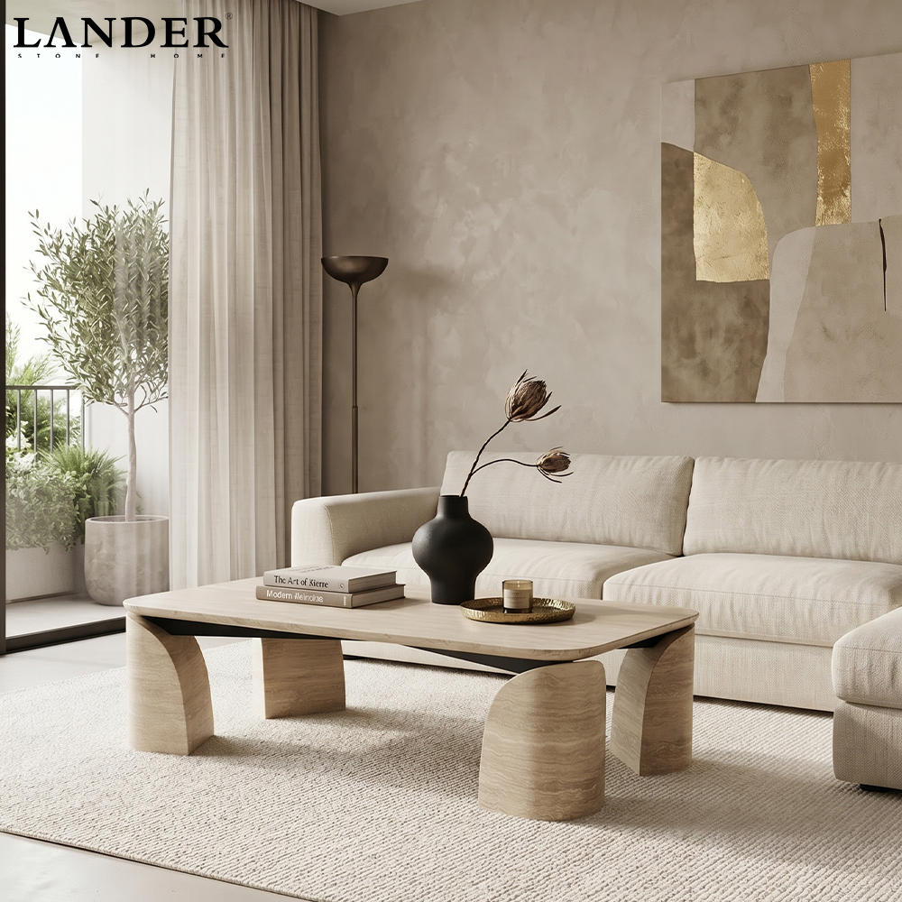 The Beige Travertine Rounded Rectangle Marble Coffee Table showcases soft edges and warm earthy tones, blending natural beauty with modern design. Its smooth, honed surface and organic stone patterns create a timeless centerpiece for contemporary and classic living spaces.