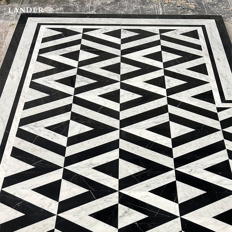 Bianco Carrara and Nero Marquina Marble Parquet Flooring
