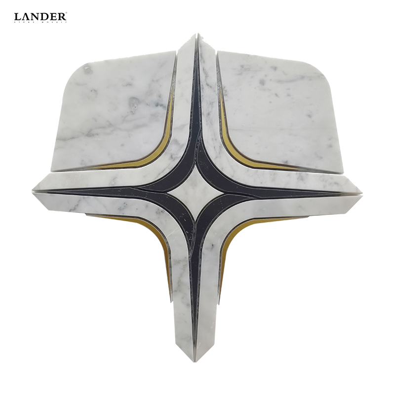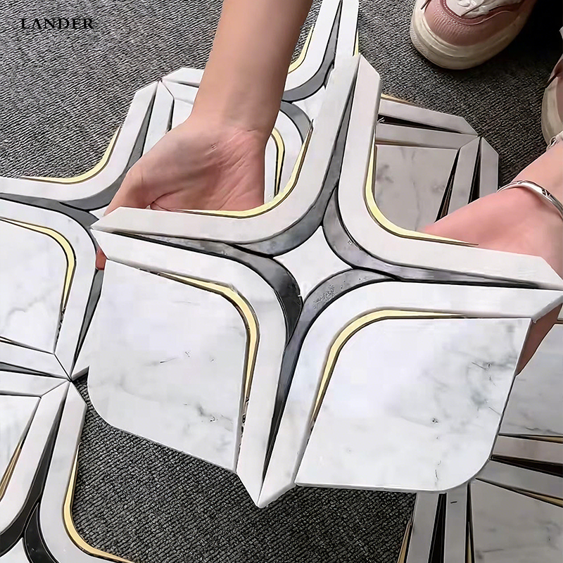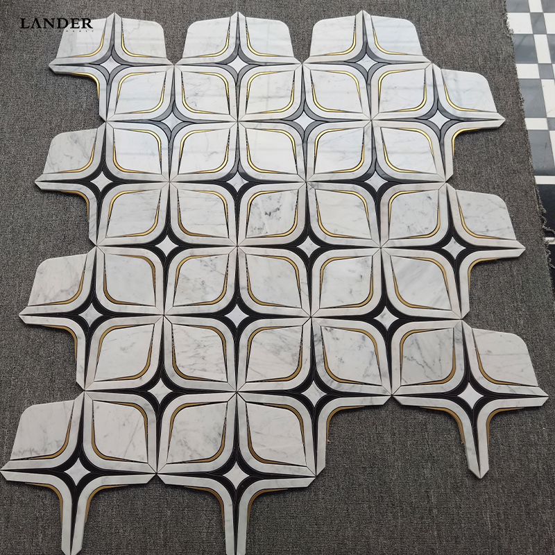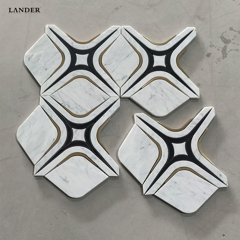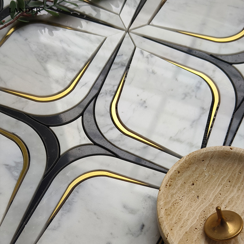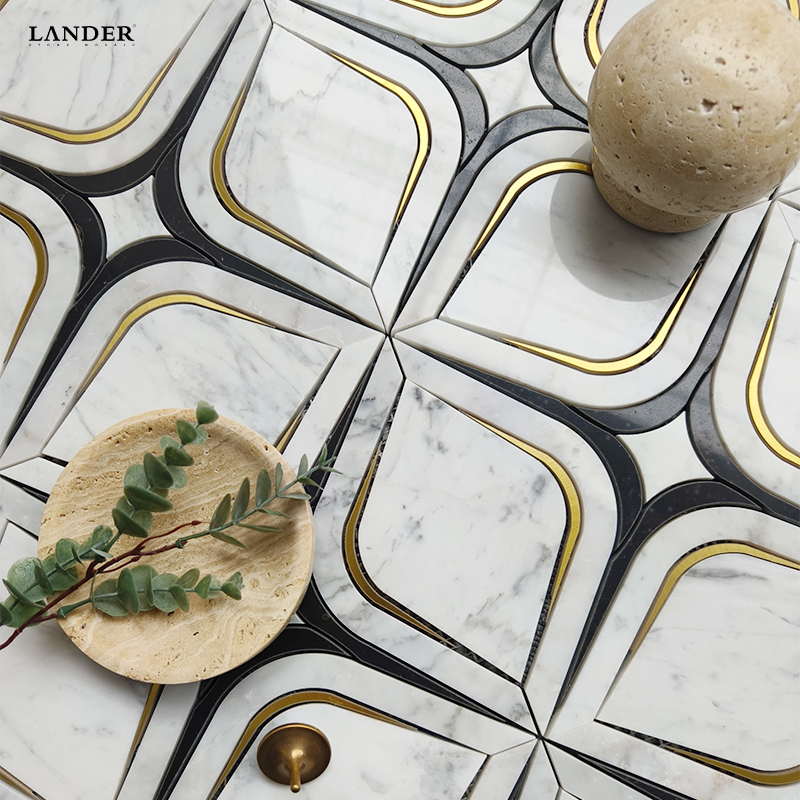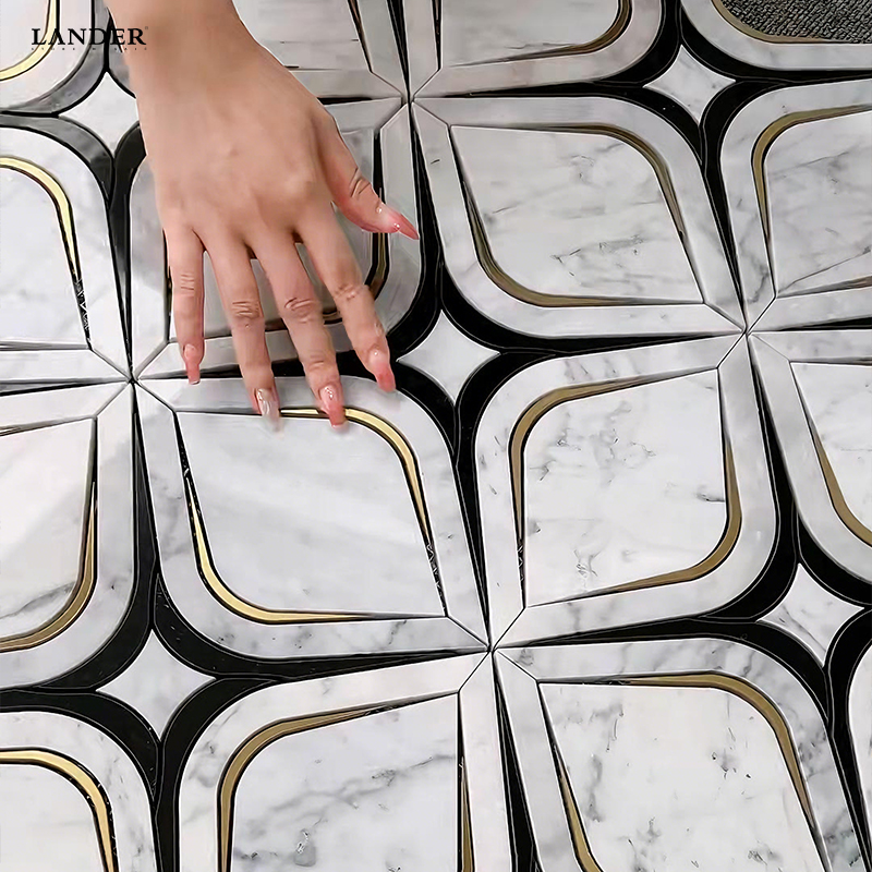 The Bianco Carrara and Nero Marquina Metal Waterjet Marble Mosaic Tile presents a striking, contemporary geometric pattern that serves as an immediate luxurious focal point. This intricate Rhombic Design seamlessly interlocks the pristine white of Bianco Carrara Marble with the dramatic, deep black of Nero Marquina Marble, creating a powerful, high-contrast monochrome aesthetic. The design is elegantly elevated by polished metal accents that sweep through the pattern’s curves, adding a layer of high-end reflectivity and glamour. Precision waterjet cutting ensures the intricate, curved shapes and tight joints are executed flawlessly. Mesh-mounted for straightforward installation, this premium mosaic is perfect for creating impactful feature walls, sophisticated shower surrounds, or luxury backsplashes in modern, high-design interiors.