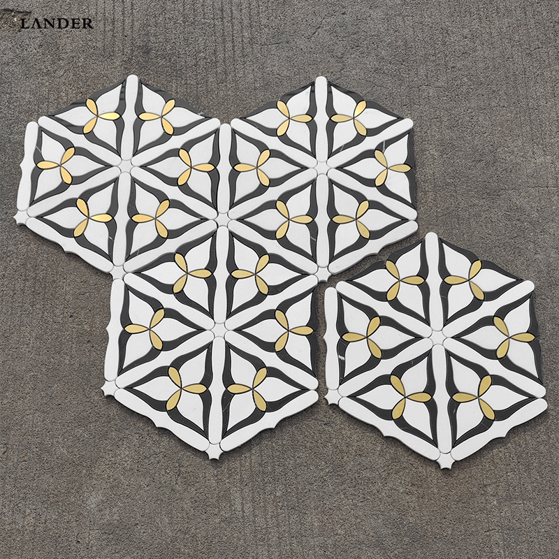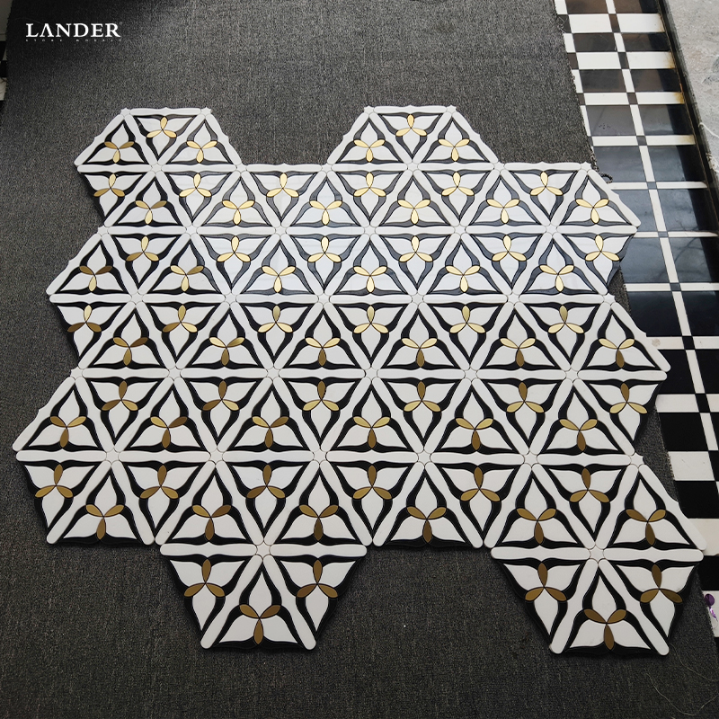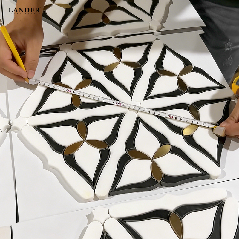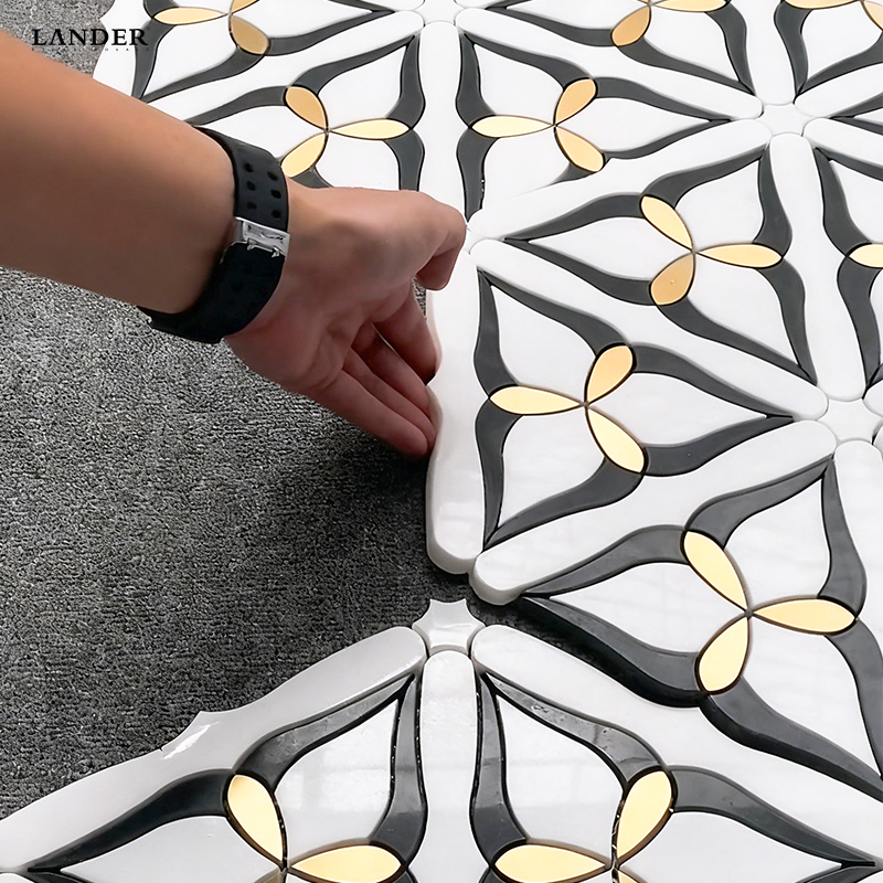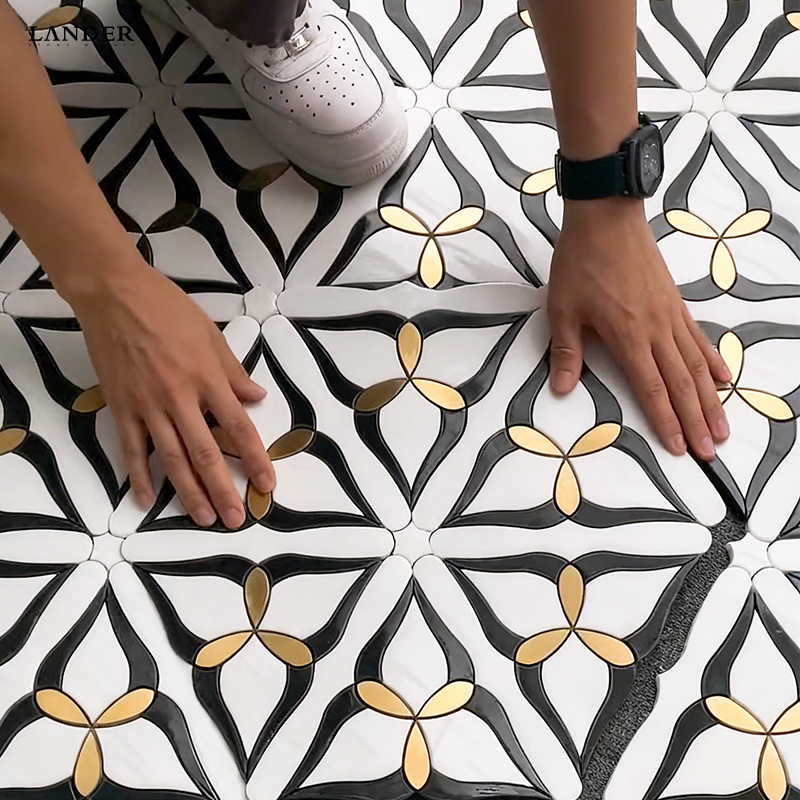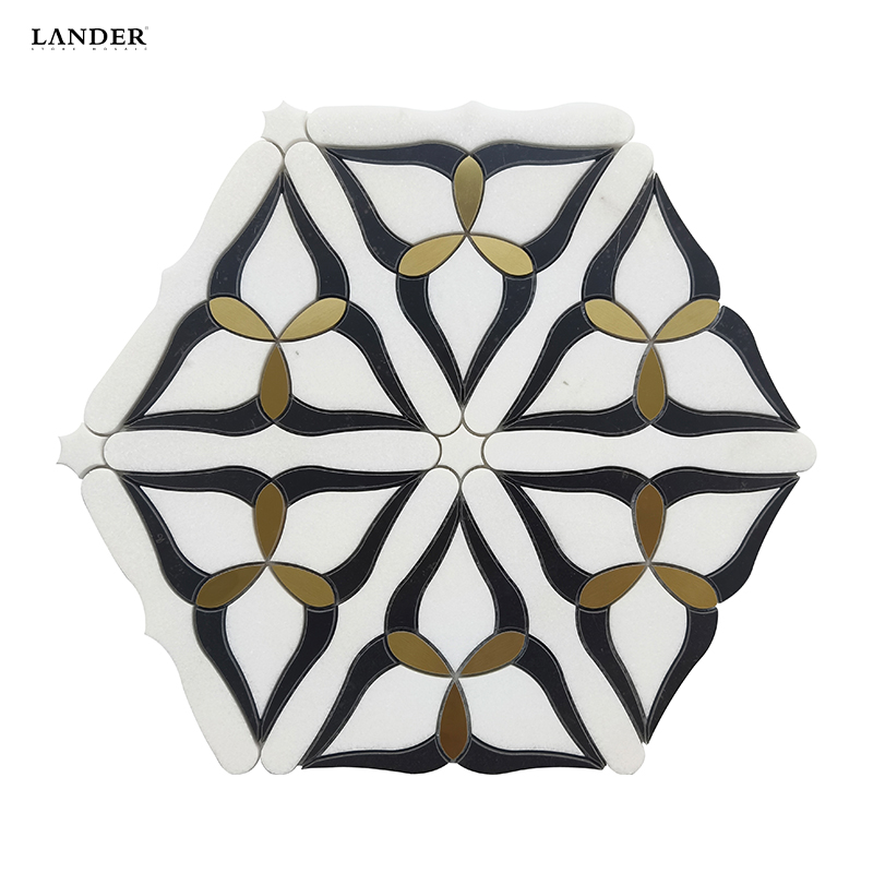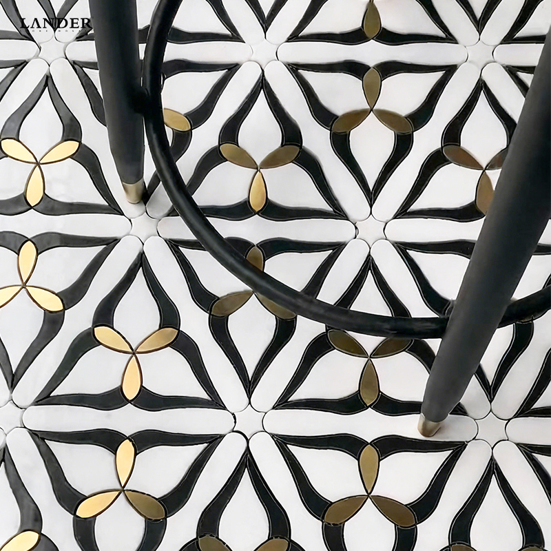 The Bianco Carrara and Nero Marquina Metal Waterjet Marble Mosaic Tile creates a stunning, intricate pattern inspired by a geometric snowflake or starburst. This luxurious design masterfully combines the classic elegance of pure white Bianco Carrara Marble with the dramatic, polished black of Nero Marquina Marble, establishing a striking, high-contrast monochrome palette. The elegant curves are further highlighted by accents of polished metal inlay, which introduce a shimmering, high-end reflection. Precision waterjet cutting ensures all elements of the complex, radial design fit together flawlessly. Mesh-mounted for ease of installation, this premium mosaic is ideal for creating dazzling feature walls, sophisticated shower floors, or luxury entryways that demand both timeless beauty and modern artistry.