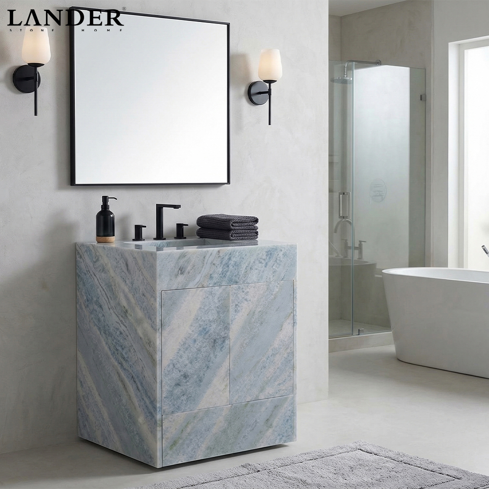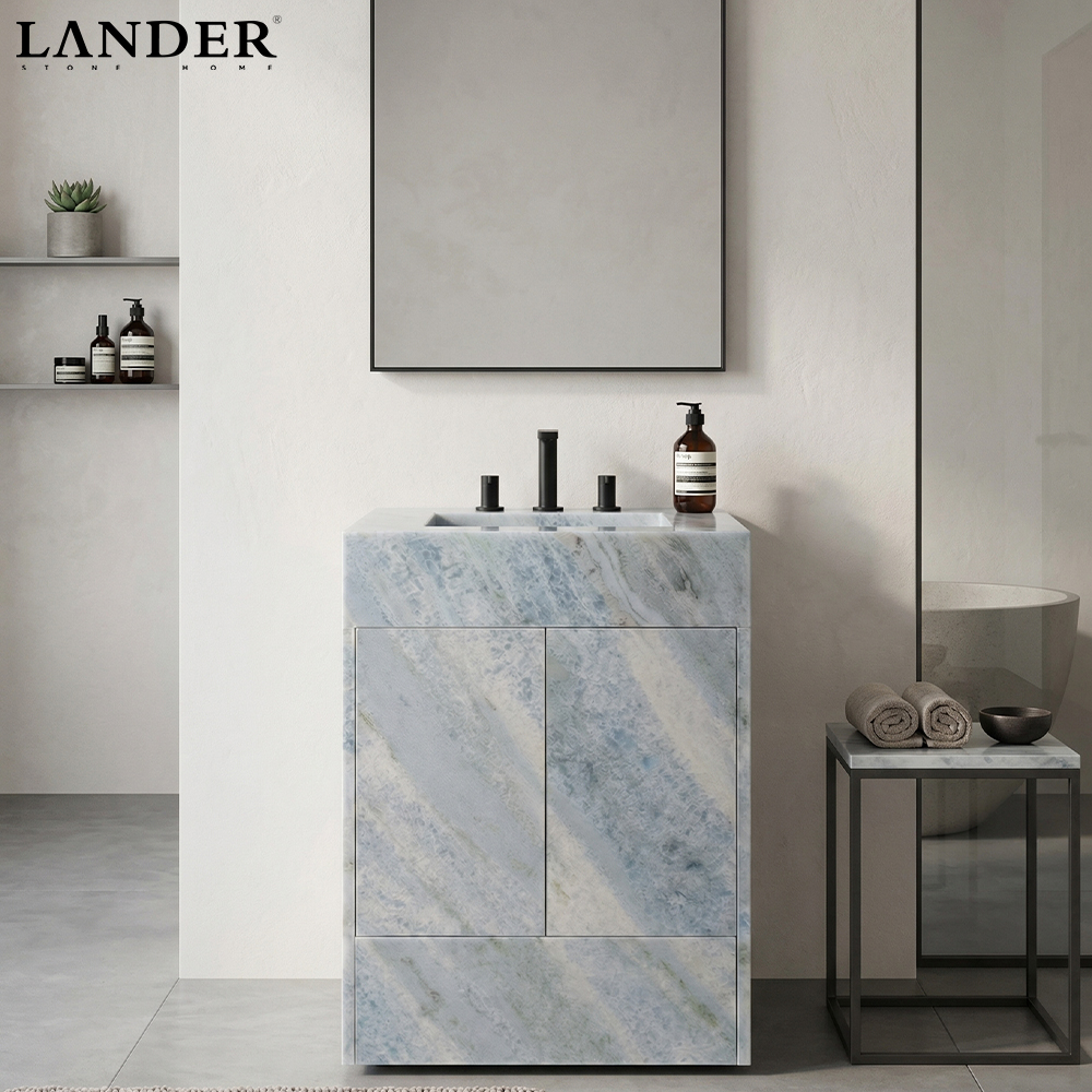 The Blue Crystal Marble Vanity Sink is a breathtaking masterpiece of serene luxury, capturing the ethereal beauty of a frozen alpine landscape. Carved from premium Blue Crystal Marble, this vanity features a unique palette of misty cerulean and soft icy tones, traversed by delicate, translucent veining that creates a sense of profound crystalline depth. The design presents a monolithic block silhouette with a perfectly integrated rectangular basin, offering a clean, architectural form that emphasizes the stone’s raw geological elegance. Expertly polished to a refined satin finish, this durable and water-resistant vanity serves as a calming focal point, ideally suited for high-end residential powder rooms, master ensuite sanctuaries, or boutique hospitality spa interiors.