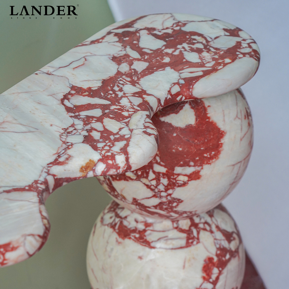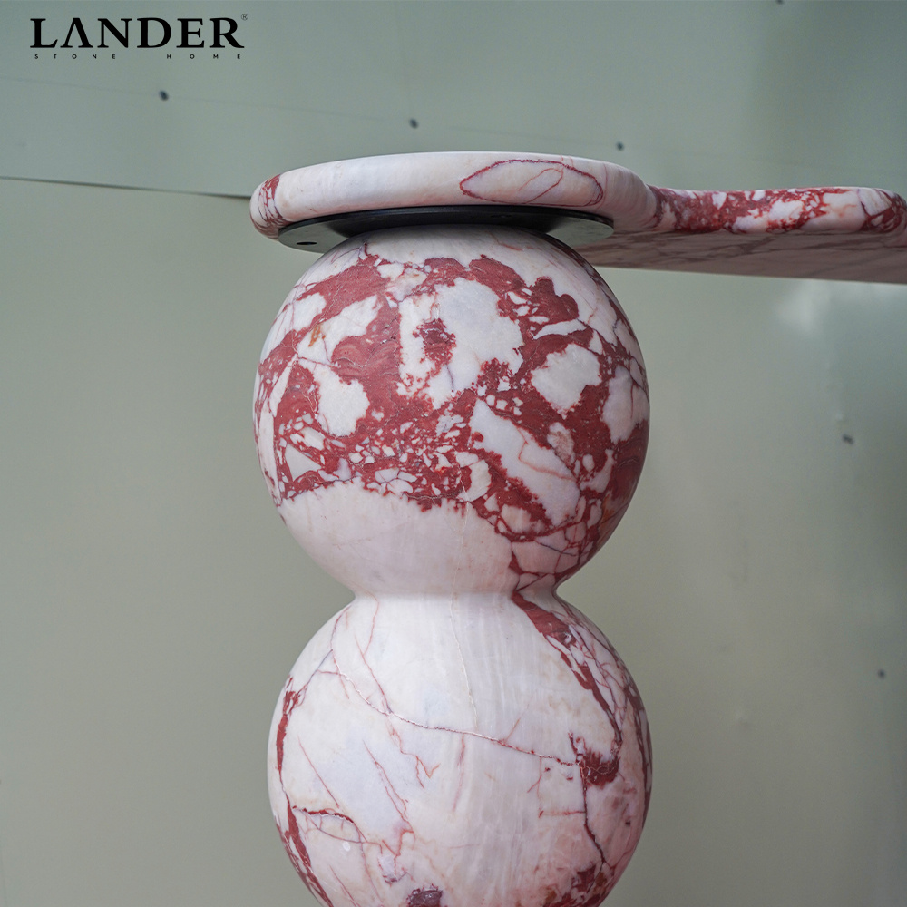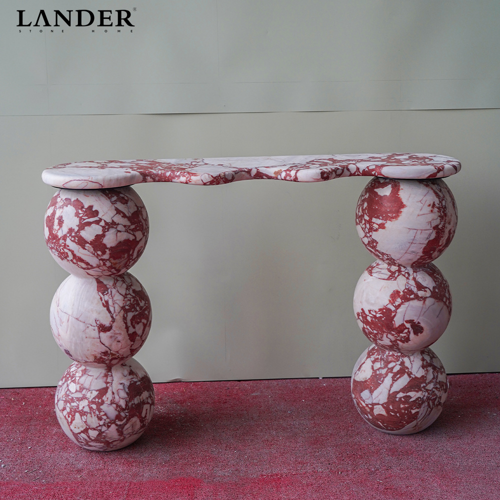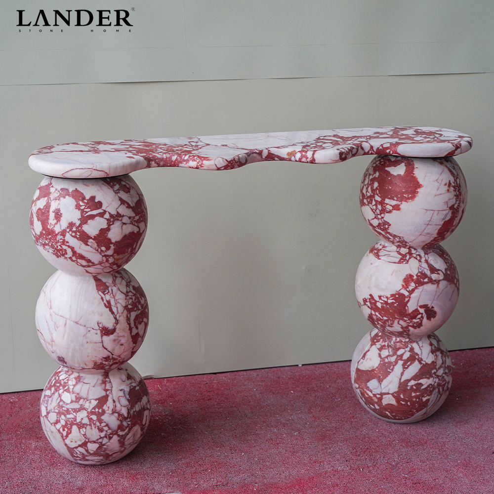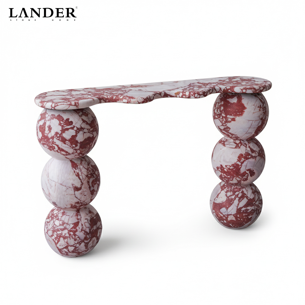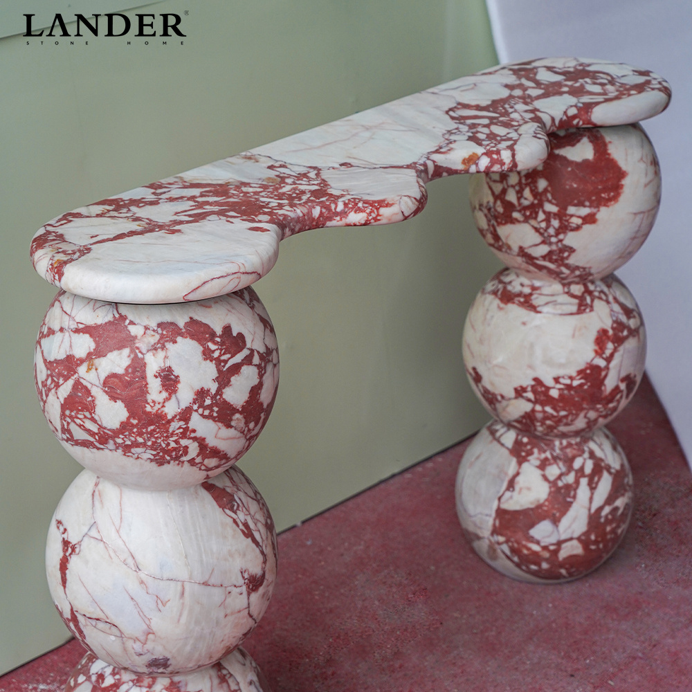The Bvlgari Red Marble Console Table features a striking red marble surface with elegant white veining, creating a bold yet sophisticated statement piece. Paired with sleek, minimalist metal legs, this console table exudes both luxury and modern design. Hand-polished to perfection, the rich marble top offers a durable and heat-resistant surface, while the vibrant hue and unique veining make each piece one of a kind. Perfect for contemporary spaces, this console table adds a touch of refinement and artistry to any entryway, living room, or hallway.