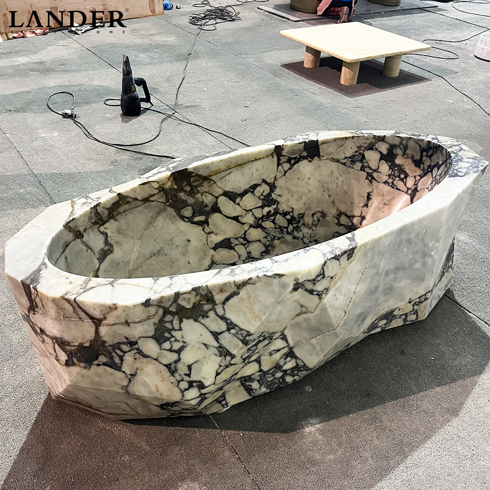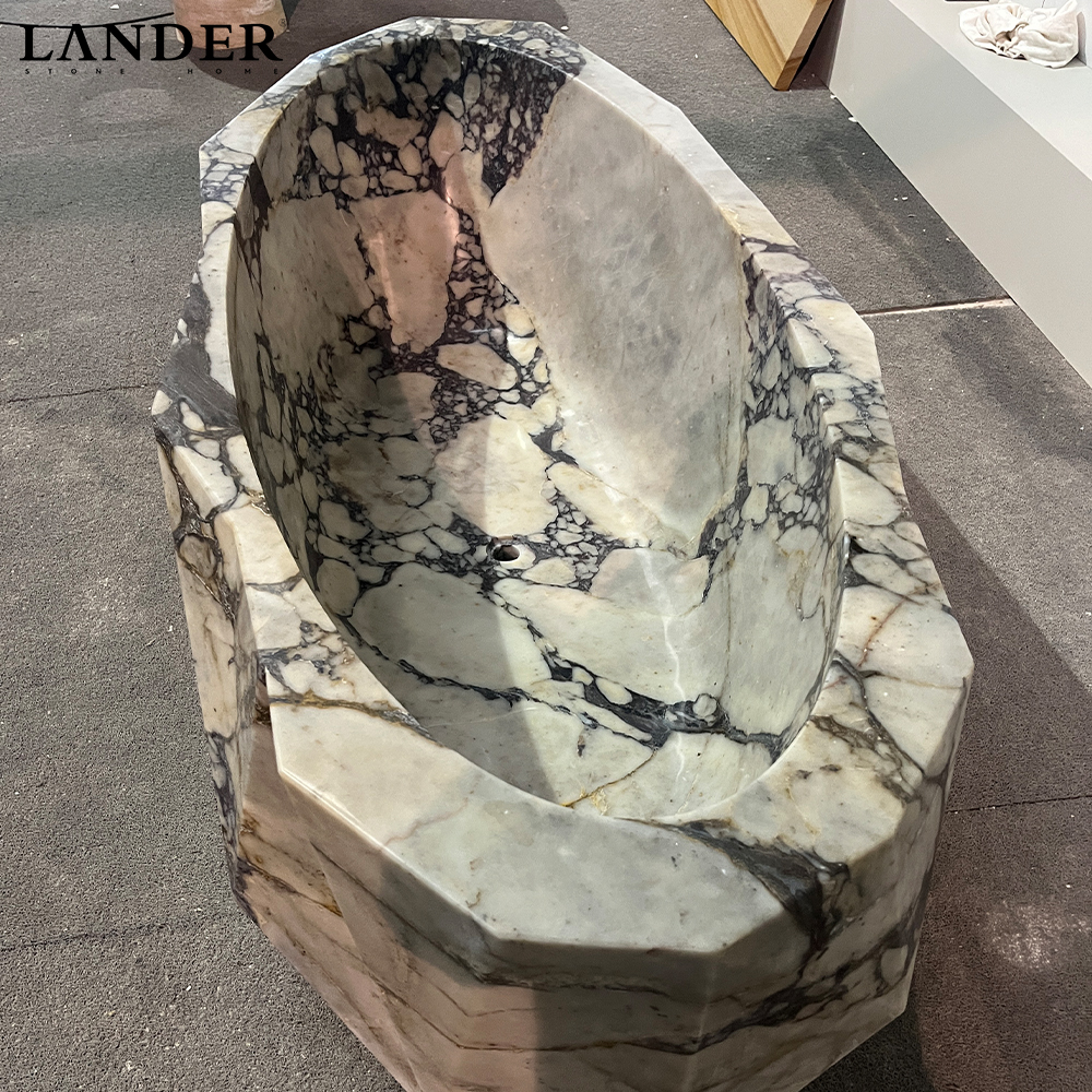 Rare Calacatta Viola Aesthetic: Showcases the iconic Italian brecciated marble, celebrated for its vivid wine-colored veining and regal presence, ensuring each bathtub is an exclusive, one-of-a-kind natural treasure.