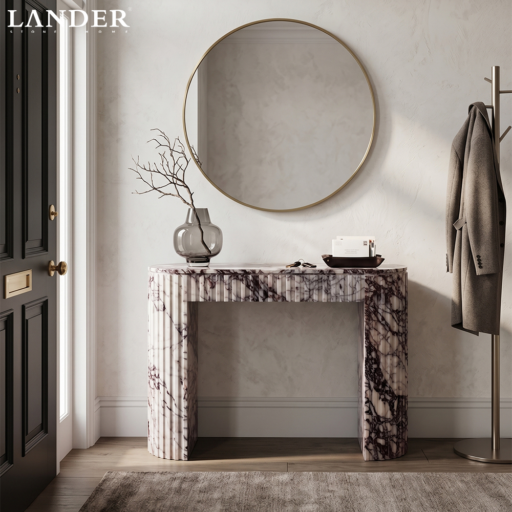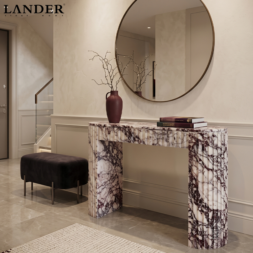 Crafted from luxurious Calacatta Viola marble, this console table features a striking convex edge design that adds sculptural elegance. Its bold veining and refined silhouette make it a sophisticated centerpiece for modern or classic interiors.
