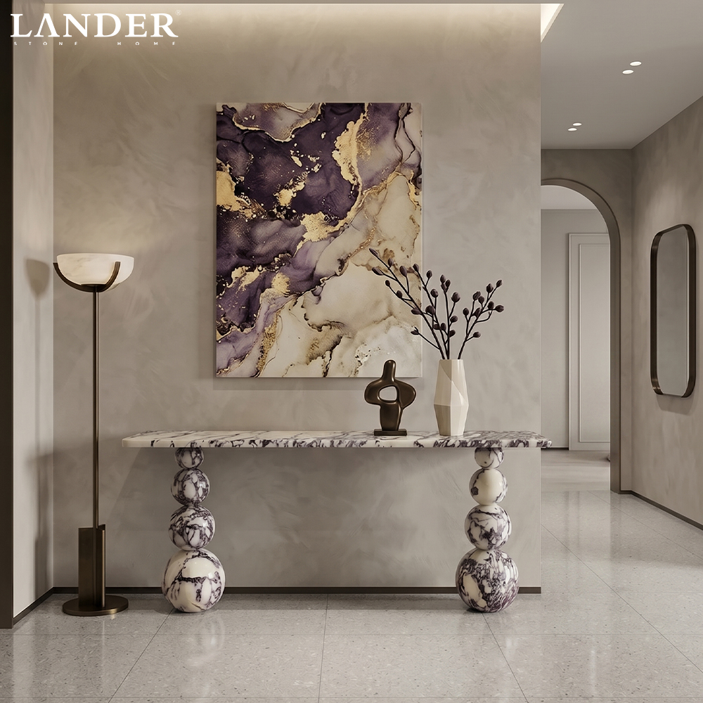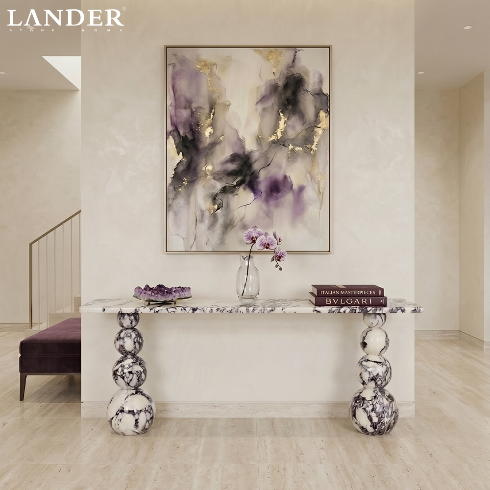Crafted from luxurious Calacatta Viola marble, this console table features a striking gourd leg design that adds sculptural elegance. Its bold veining and unique silhouette create a sophisticated statement, perfect for entryways, living rooms, or stylish interiors.