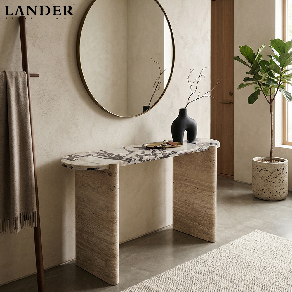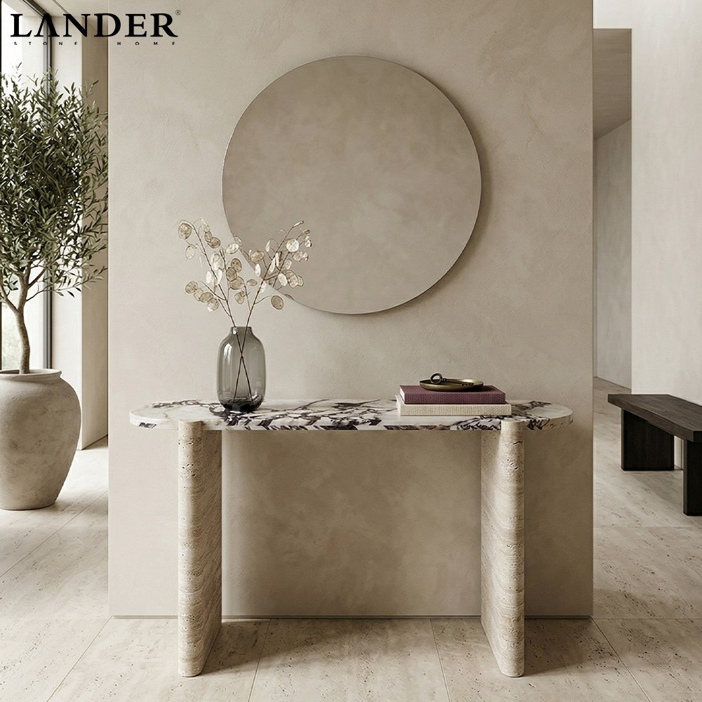 The Calacatta Viola Marble Console Table with Travertine Leg combines bold veining with natural warmth. Its striking white and violet marble top contrasts beautifully with the textured travertine base, creating an elegant focal point ideal for modern, artistic interiors.
