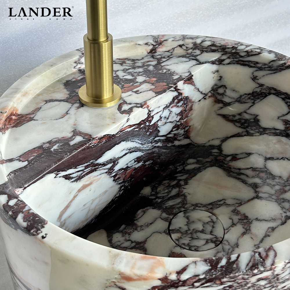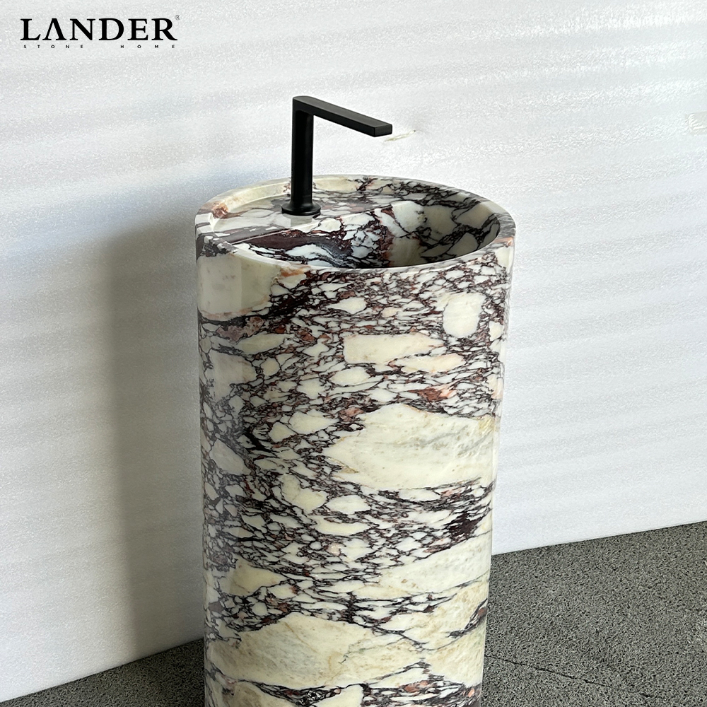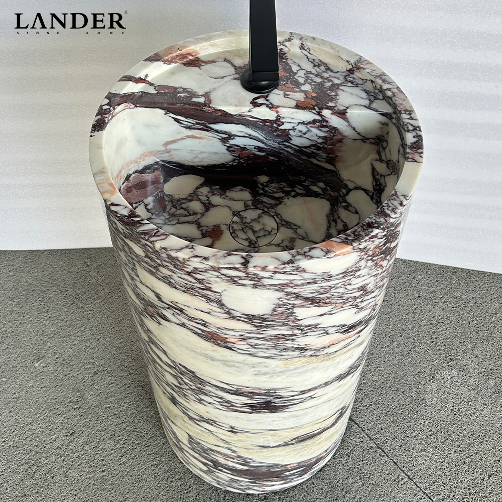 The Calacatta Viola Marble Sink Column Basin is a striking blend of luxury and functionality. The sink features the distinctive beauty of Calacatta Viola marble, with its bold veining and rich mix of purple, white, and gray tones, creating a statement piece for any bathroom. The column basin design offers a modern, minimalist aesthetic while providing ample space for everyday use. Its polished finish ensures durability, easy maintenance, and a high-end, sleek appearance. Ideal for contemporary bathrooms, this sink adds an elegant touch to any space, effortlessly complementing both modern and traditional interior styles