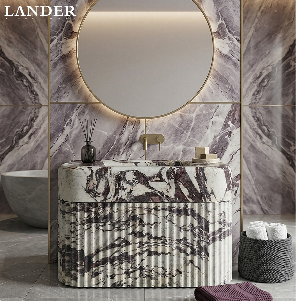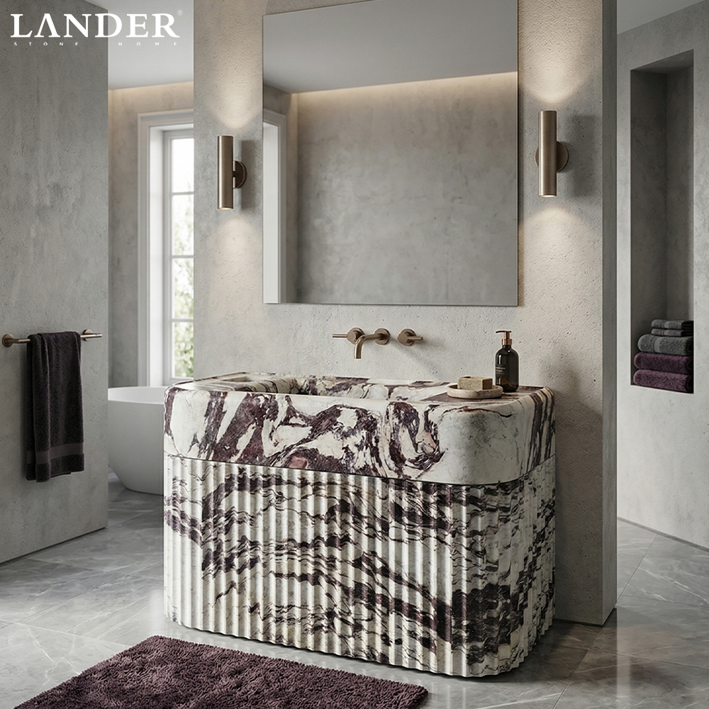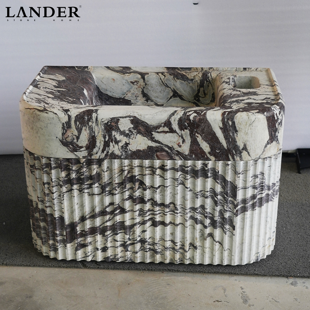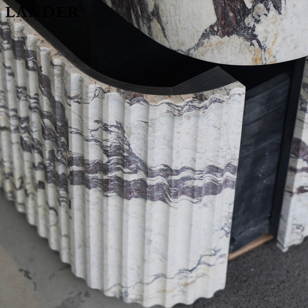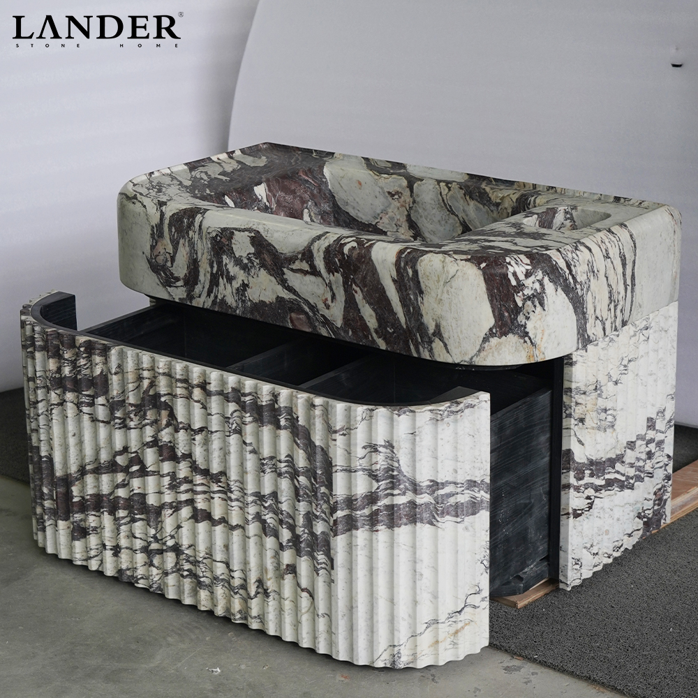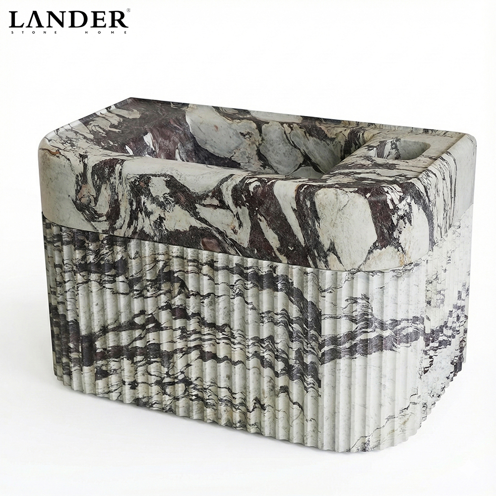 Architectural Fluted Texture: The lower half is meticulously milled with a ribbed “accordion” design, adding tactile depth and a modern sculptural rhythm to the solid stone form.
