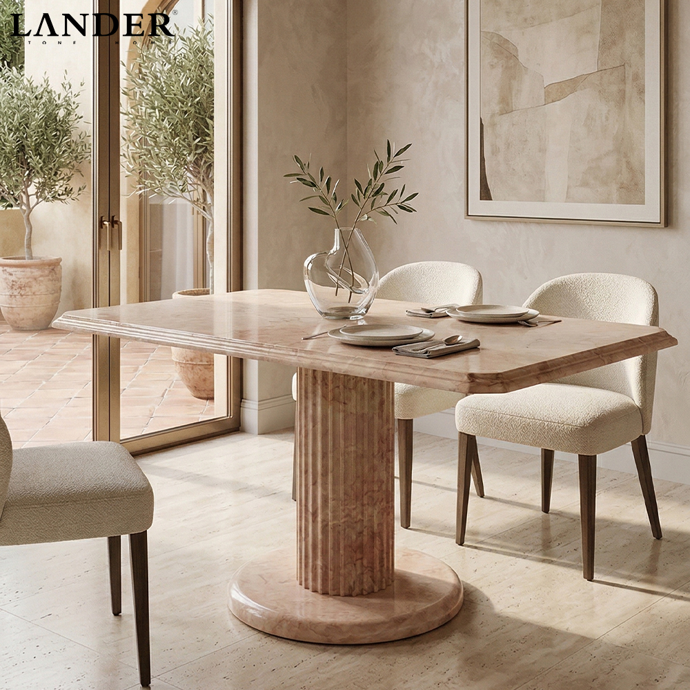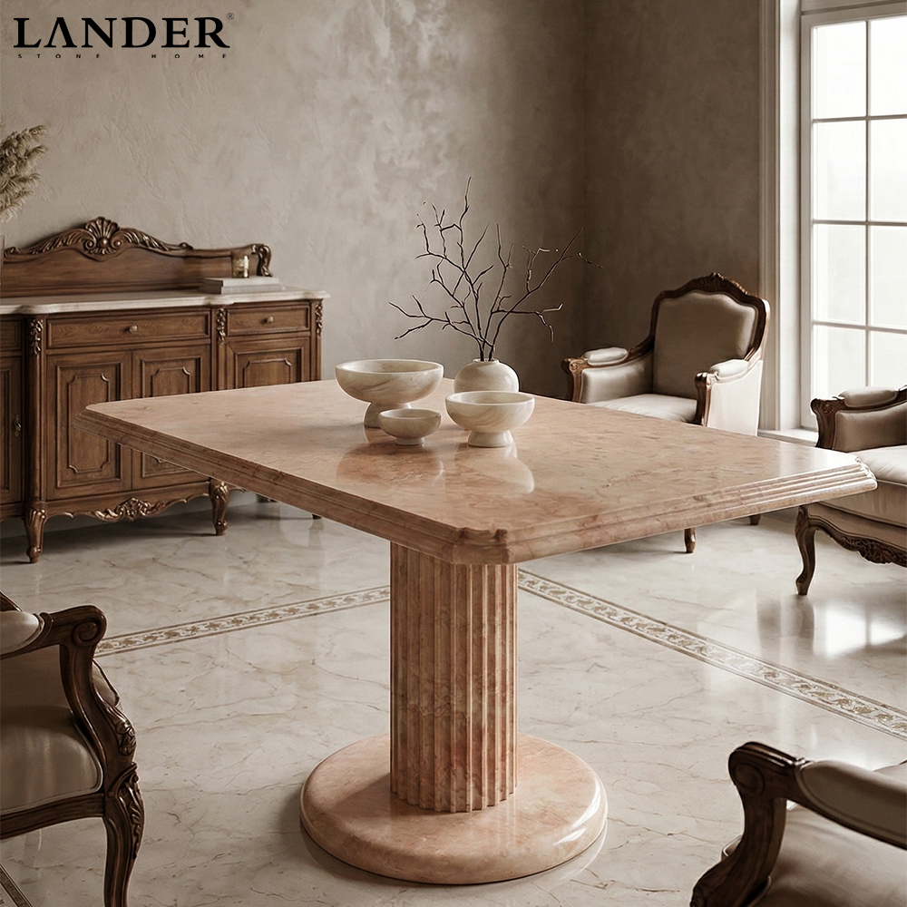 The Cream Rose Marble Dining Table is a masterpiece of classical elegance, featuring a soft, blushing palette of delicate pink and warm cream tones with subtle, blossoming mineral textures.