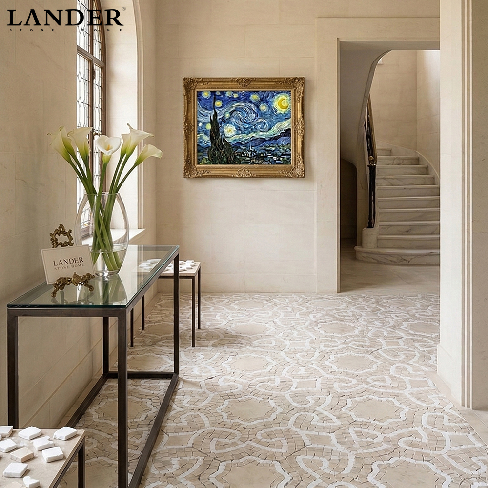 The Crema Marfil Customized Mosaic Portrait Mural Pattern is a bespoke masterpiece of stonework, utilizing the warm, buttery tones and delicate toasted veining of premium Crema Marfil marble to create a breathtakingly detailed work of art.