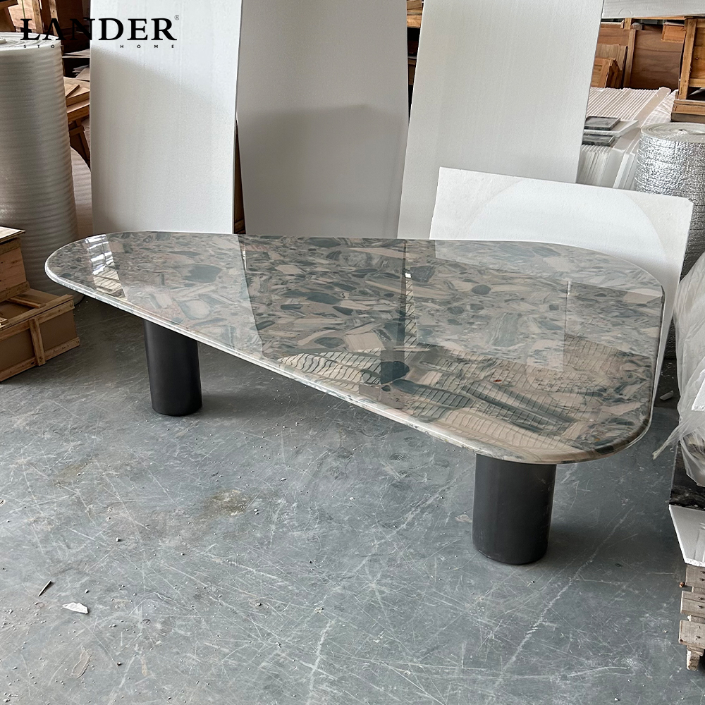 The Dior Blue Luxury Marble Dining Table is a high-fashion statement piece that brings the captivating depths of the ocean and the cosmos into your dining space. Crafted from rare, premium Dior Blue Marble, the expansive tabletop features a breathtaking tapestry of deep navy, charcoal, and icy blue swirls, punctuated by dramatic crystalline veining that creates a sense of fluid movement. This exquisite slab is expertly polished to a mirror-like finish, highlighting the stone’s complex mineral layers and natural brilliance. Perfectly suited for avant-garde residential dining rooms or prestigious executive spaces, this table serves as a sophisticated anchor that balances bold, contemporary artistry with the enduring luxury of natural stone.