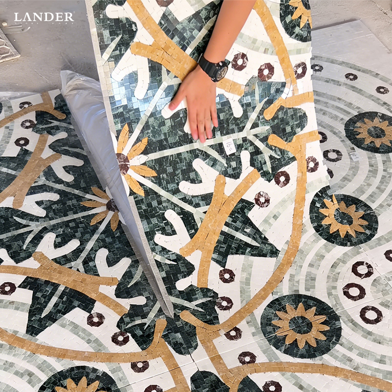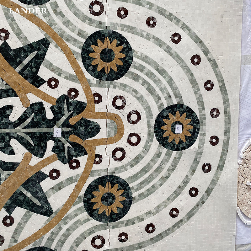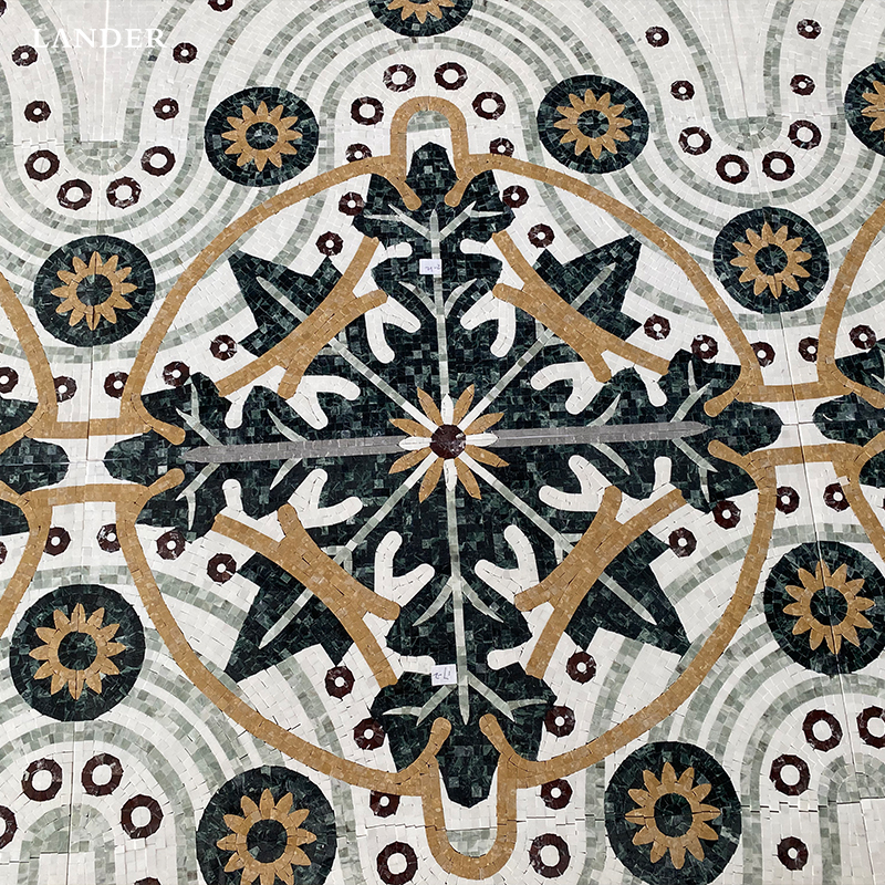 The Emperador Dark, Empire Gold, and Green Marble Medallion is an opulent masterpiece of mosaic artistry, featuring an intricate heraldic-inspired crest surrounded by rhythmic floral motifs. This medallion expertly harmonizes the deep, chocolate tones of Emperador Dark with the regal brilliance of Empire Gold and the lush, forest-green accents of premium marble.