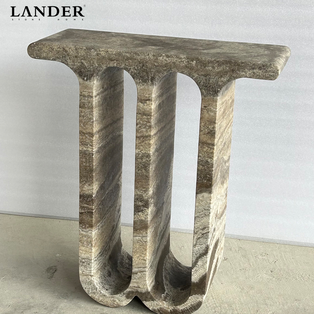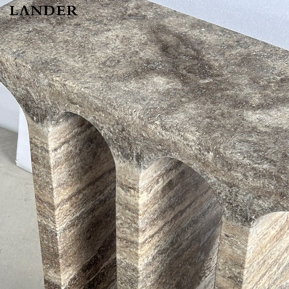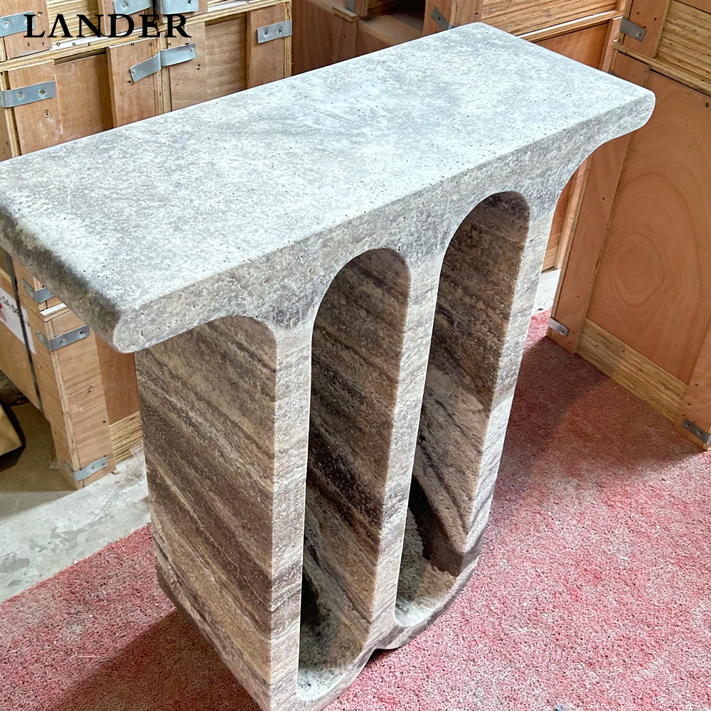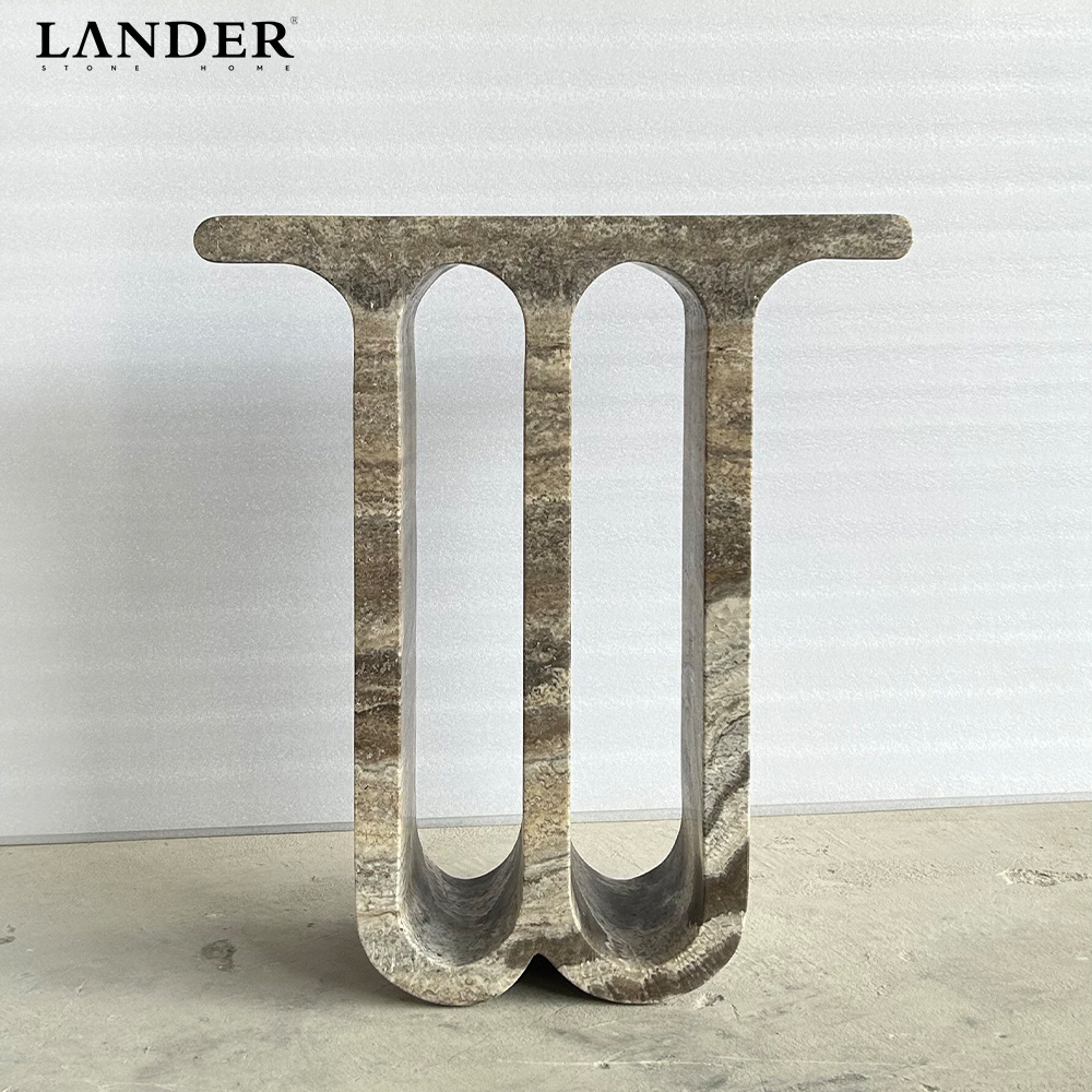 The Gray Travertine Marble Console Table (Hollow Design) combines raw mineral texture with an airy, architectural silhouette. Carved from genuine gray travertine and hand-honed to a smooth touch, its openwork base forms sculptural arches that create striking negative space while retaining the solidity of stone. A slim rectangular top offers a refined, heat-resistant surface for art, lighting, or daily essentials, and the natural pores and veining ensure each piece is uniquely one of a kind—perfect for entryways, living rooms, or gallery-style spaces.