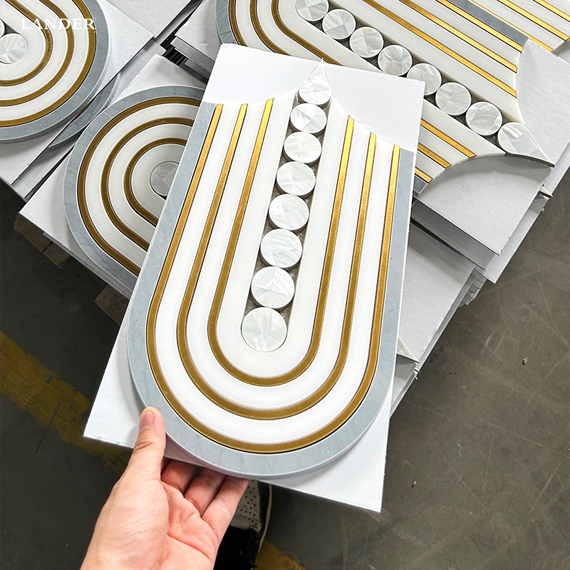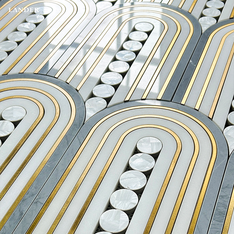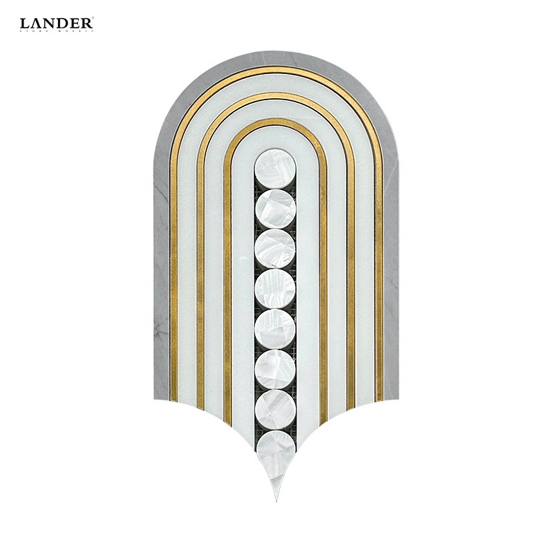 The Guangxi White and Copper Waterjet Marble Mosaic Tile is a stunning Art Deco-inspired medallion designed to create an instant architectural focal point. This piece uses the pristine, bright surface of Guangxi White Marble as its base, contrasted with sophisticated concentric arcs of polished Copper (or brass-toned metal) and a striking central column of circular accents. Precision waterjet cutting ensures the flawless fit of these complex, curved layers and sharp lines. Mesh-mounted for easy handling, this premium mosaic is perfect for high-end vertical installations, including niche backings, vanity surrounds, or adding luxury definition above fireplaces in contemporary or vintage-inspired interiors.