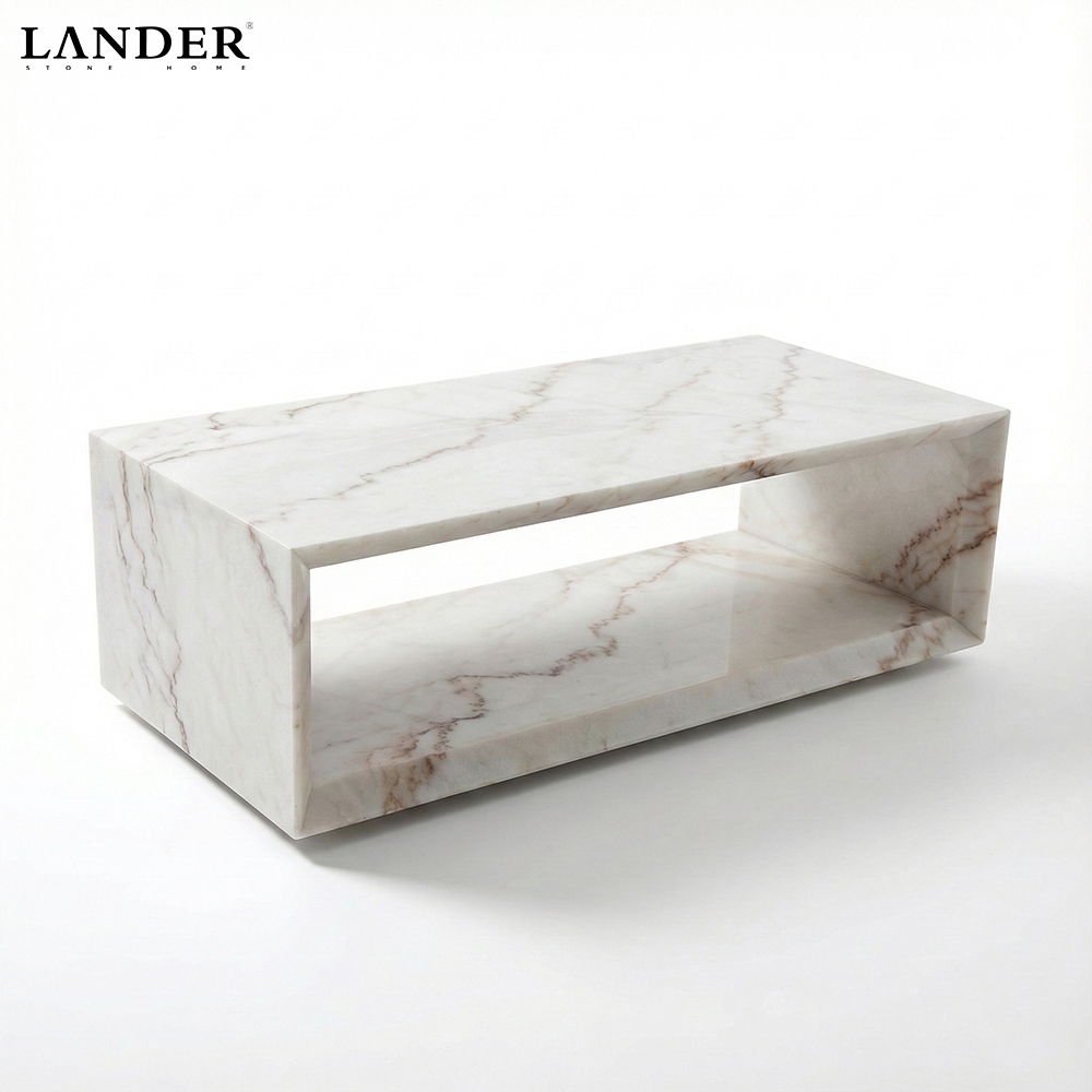 The Guangxi White Marble Coffee Table is a sleek, modern statement piece that elegantly balances the solidity of stone with a sense of visual lightness. Crafted from pristine Guangxi White Marble, the table features a subtle, uniform white base with gentle veining, which is highly prized for its clean and bright aesthetic. The design is a sophisticated rectangular form with a distinctive Hollowed-out center, creating an airy open shelf or negative space that makes the substantial marble structure appear lightweight. This clever architectural design offers both a practical display area and a refined minimalist silhouette, making it the ideal luxury centerpiece for modern, light-filled residential or commercial spaces.