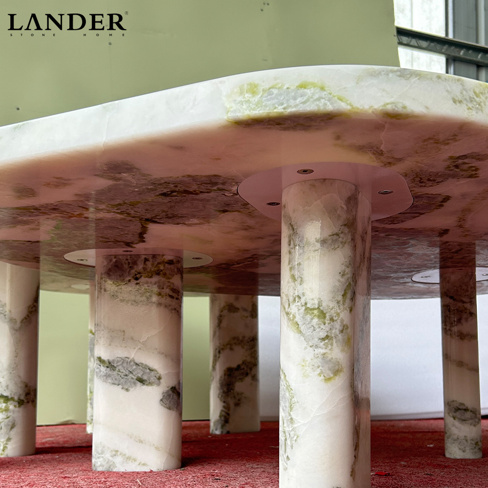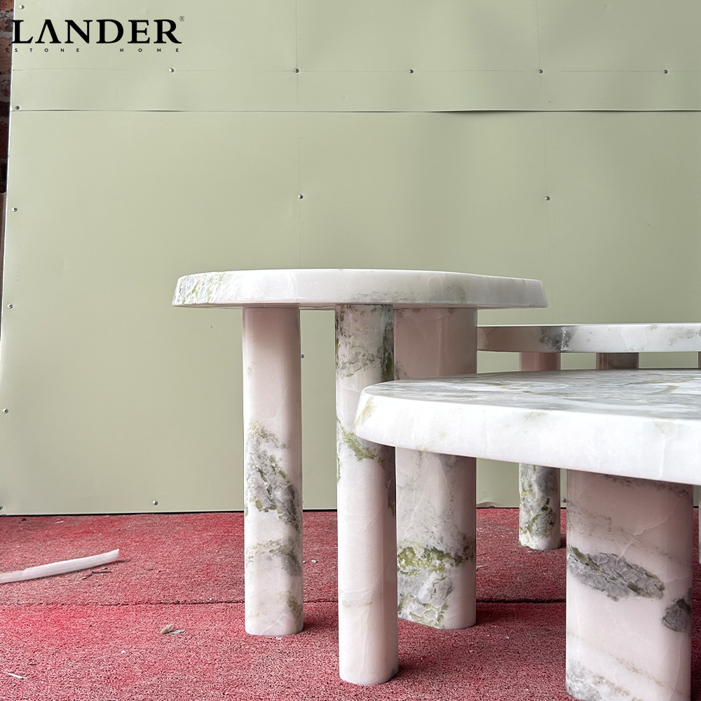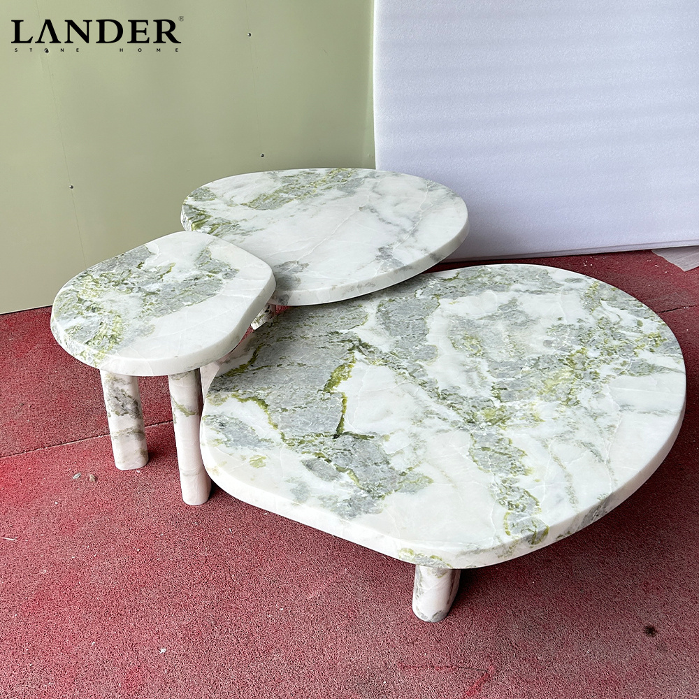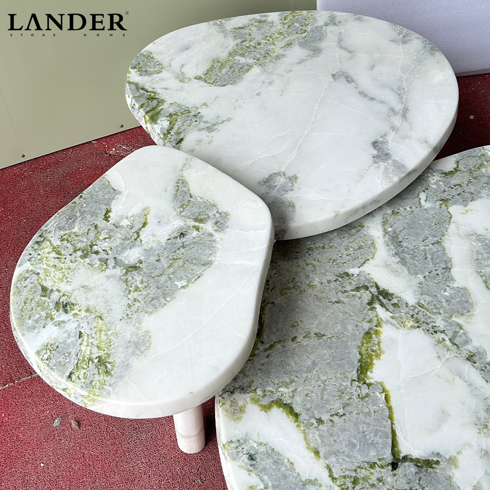 The Ice Jade Marble Coffee Table Set brings cool, luminous elegance to the living room with genuine Ice Jade stone showcasing soft green tones and delicate white veining. Offered in complementary sizes for nesting or separating, each table is hand-honed to a smooth, tactile finish and anchored by solid stone bases for sculptural stability. Naturally heat-resistant and built for everyday use, the set delivers flexible surface area and a one-of-a-kind, gallery-worthy accent for modern or classic interiors.