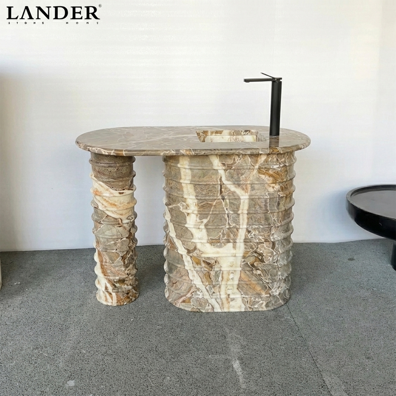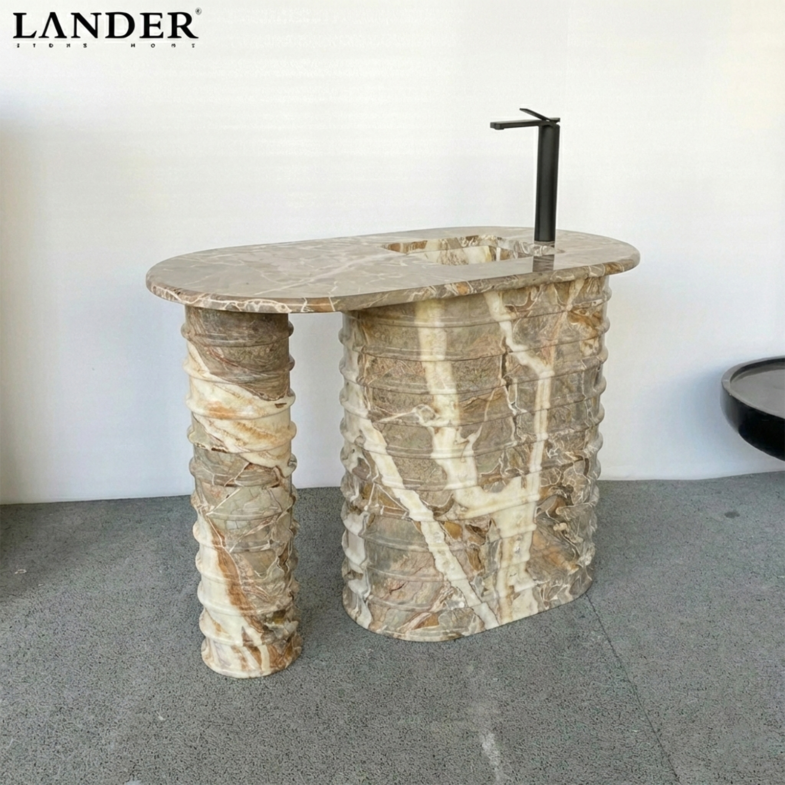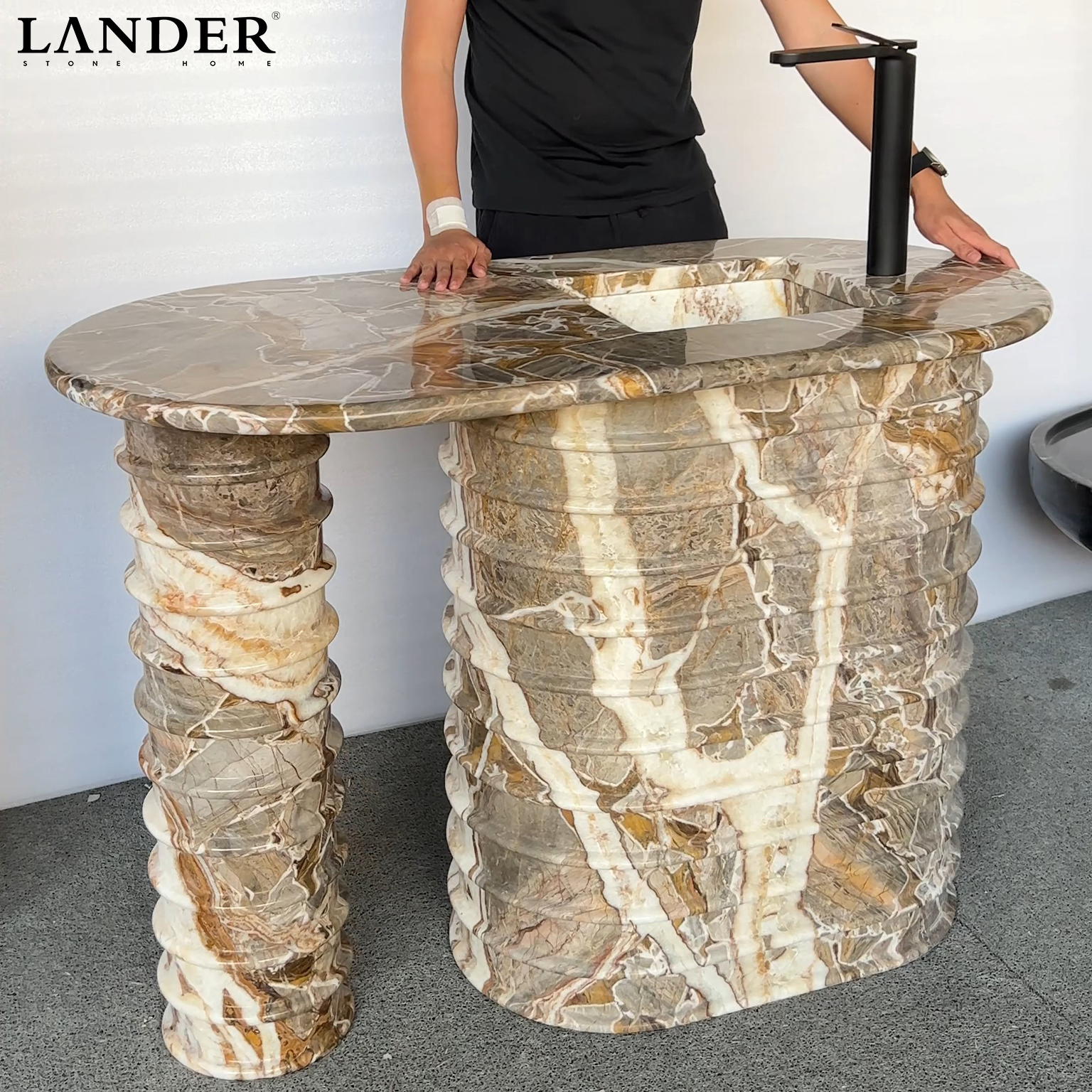 The Impressions of Rome Marble Sink is a monumental tribute to classical Italian architecture, meticulously carved from a single block of earth-toned, highly figured marble. This extraordinary vanity features a distinctive fluted, accordion-style texture across its dual-pedestal base, supporting a seamless oval countertop with an integrated rectangular basin.