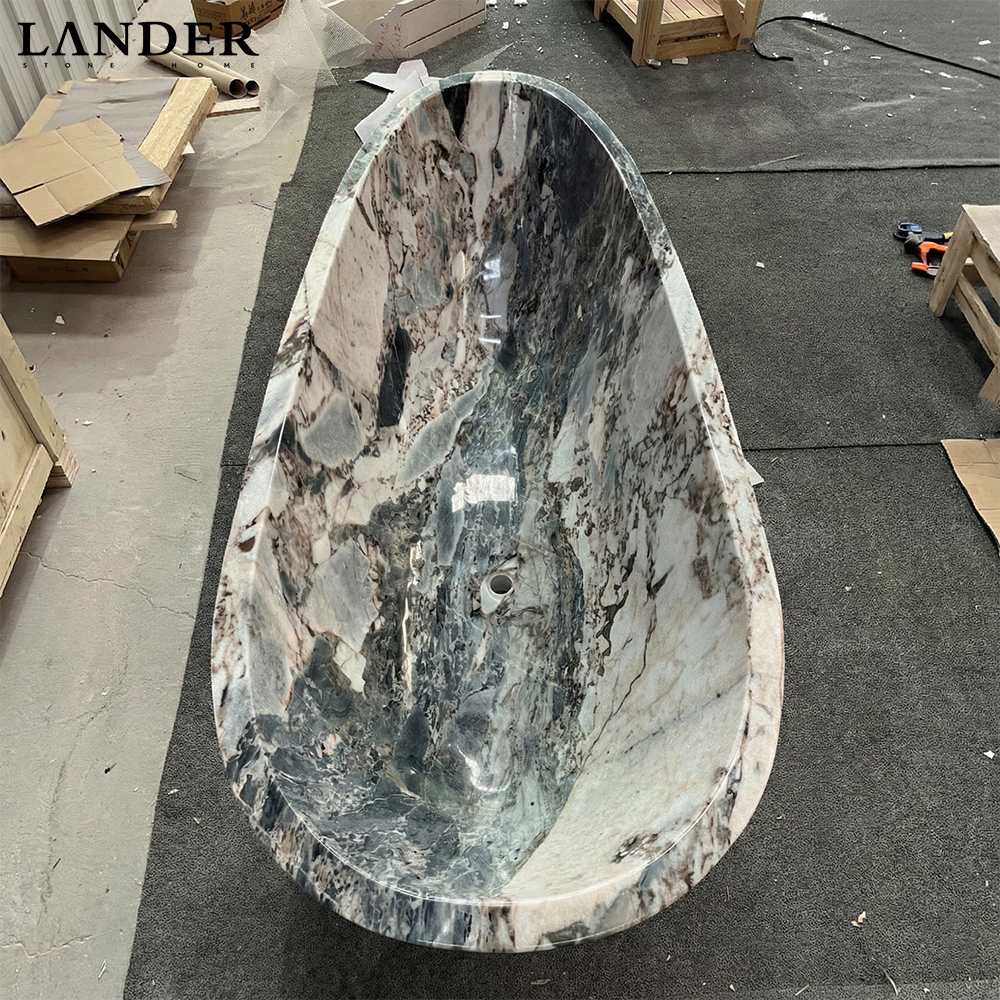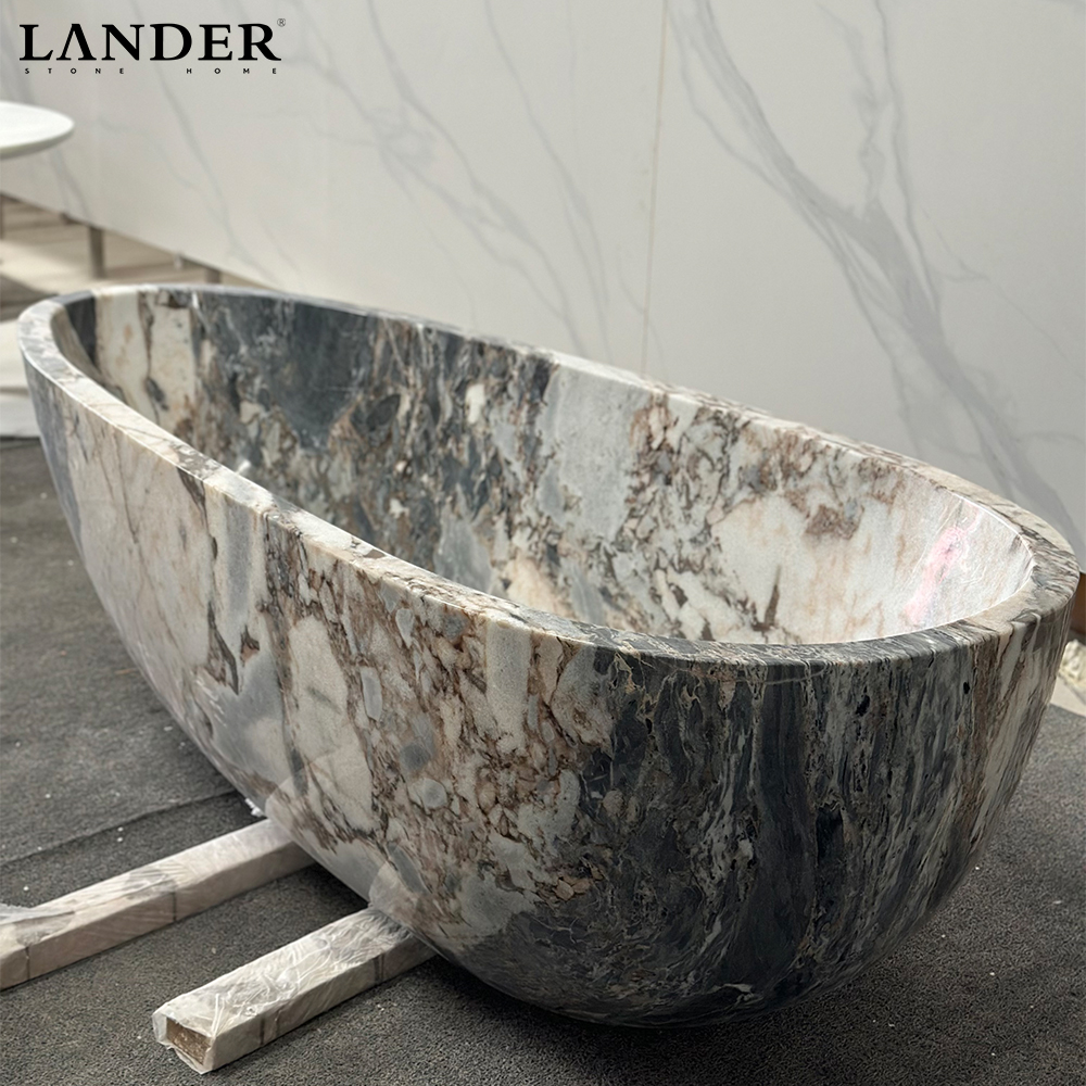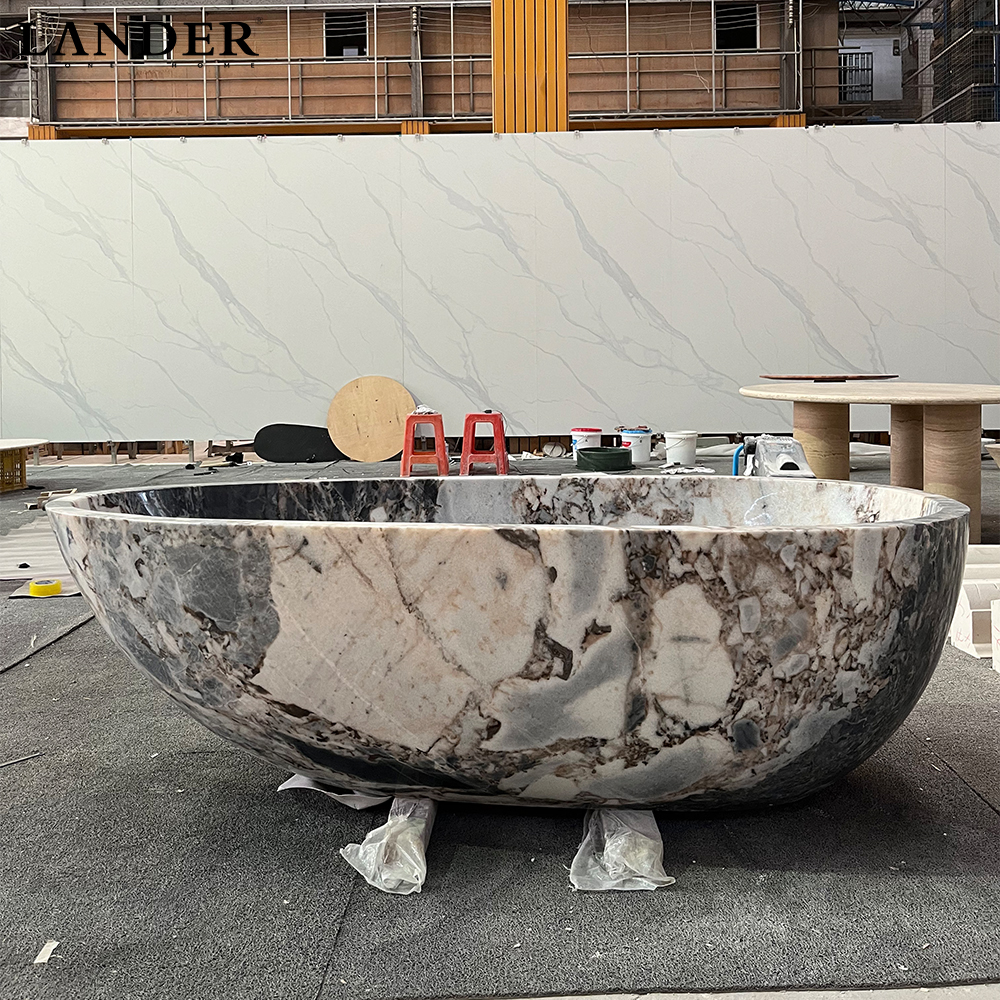 Extraordinary Brecciated Aesthetic: Showcases rare, high-contrast marble with dramatic fragmentary veining, ensuring that each bathtub is a one-of-a-kind natural sculpture that cannot be replicated.