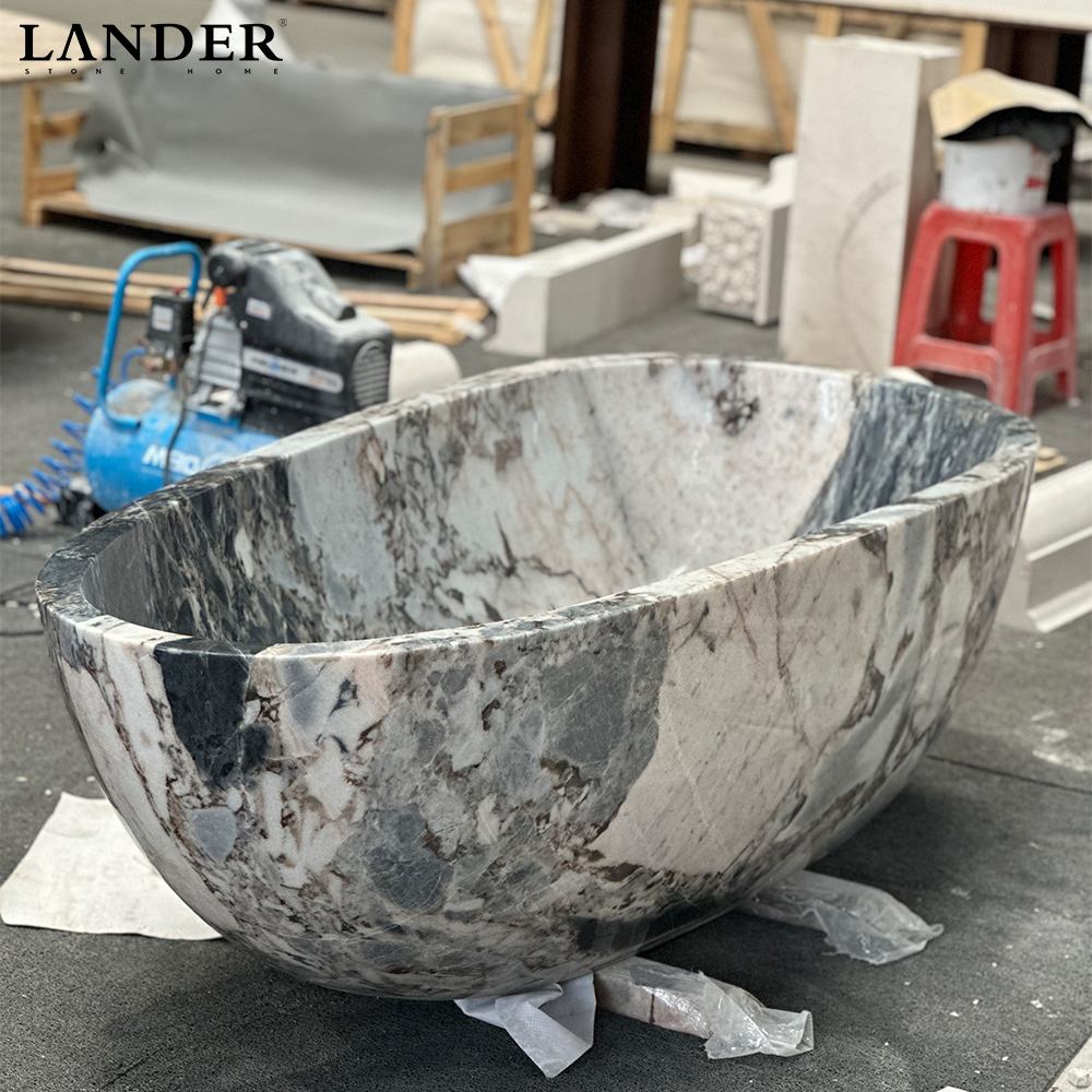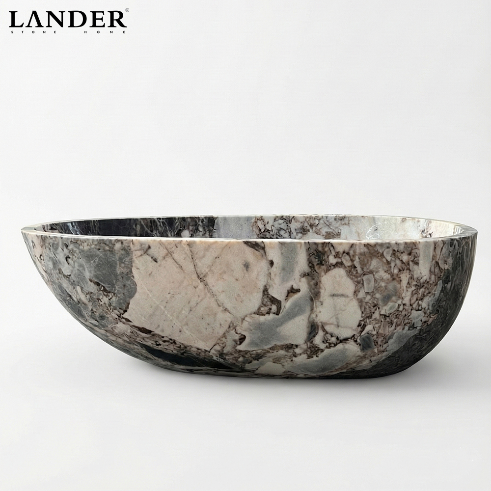 The Modellato Marble Bathtub is a singular statement of raw geological power and refined sculptural artistry, meticulously designed for the world’s most prestigious villas. Carved from a premium, highly figured marble block, this bathtub features an extraordinary brecciated pattern, where ivory and dove-grey fragments are suspended in a dramatic web of charcoal and deep violet veining. The exterior is defined by a bold, hand-faceted “Modellato” silhouette, creating a multi-angled architectural form that plays with light and shadow like a gallery masterpiece. The interior is polished to a flawless, ergonomic curve, offering a sublime soaking experience with the exceptional heat retention unique to solid natural stone. It is the ultimate centerpiece for grand master ensuites and luxury estate sanctuaries that demand an uncompromising blend of nature’s wild beauty and elite modern craftsmanship.