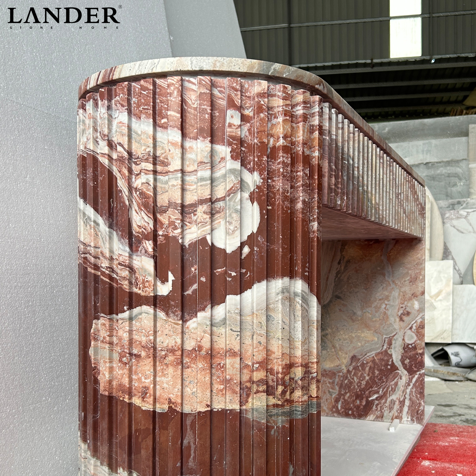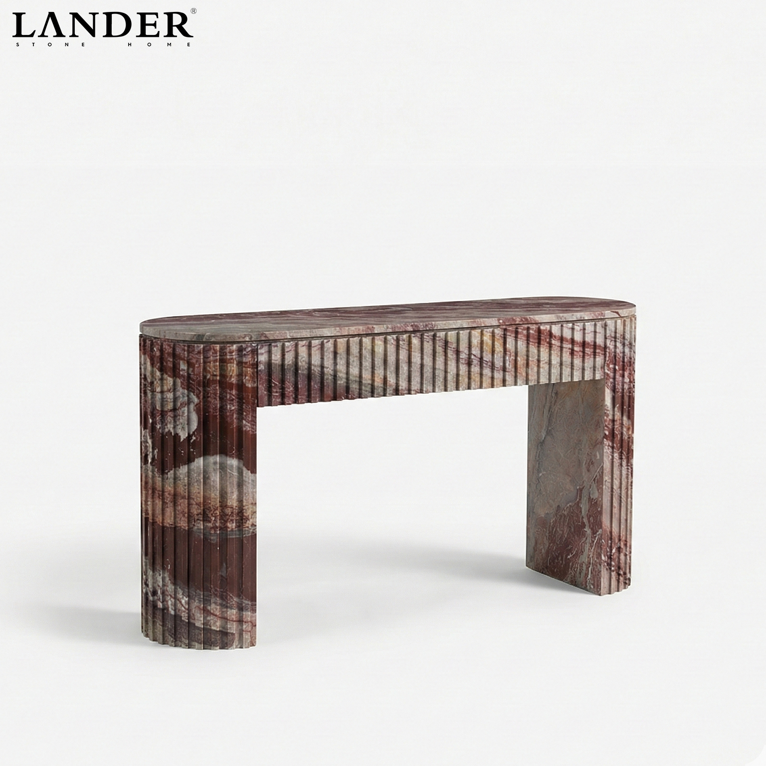 The Monica Red Marble Console Table is a dramatic fusion of classical texture and contemporary silhouette. Crafted from premium Monica Red marble, it features a rich, multi-tonal burgundy surface with earthy veining and crystalline depth. The design is elevated by a fully fluted (grooved) apron and legs, creating a rhythmic, columnar effect that plays with light and shadow. This monolithic statement piece is ideal for luxury entryways, high-end gallery halls, and sophisticated living rooms that demand a bold, architectural centerpiece.