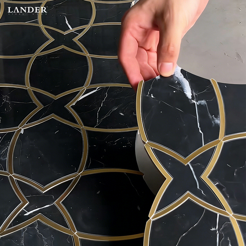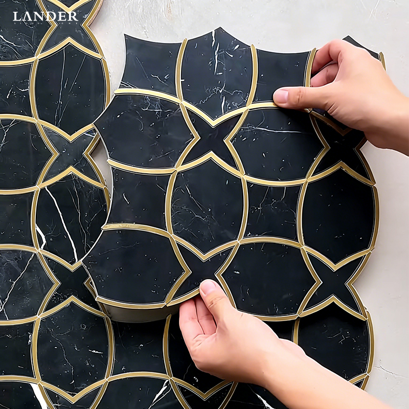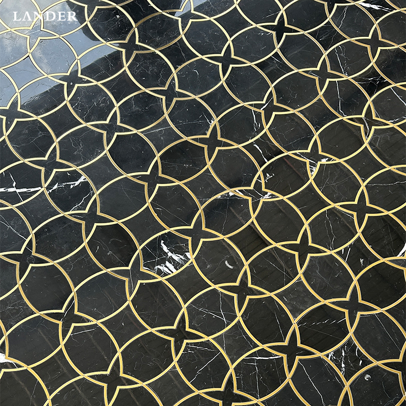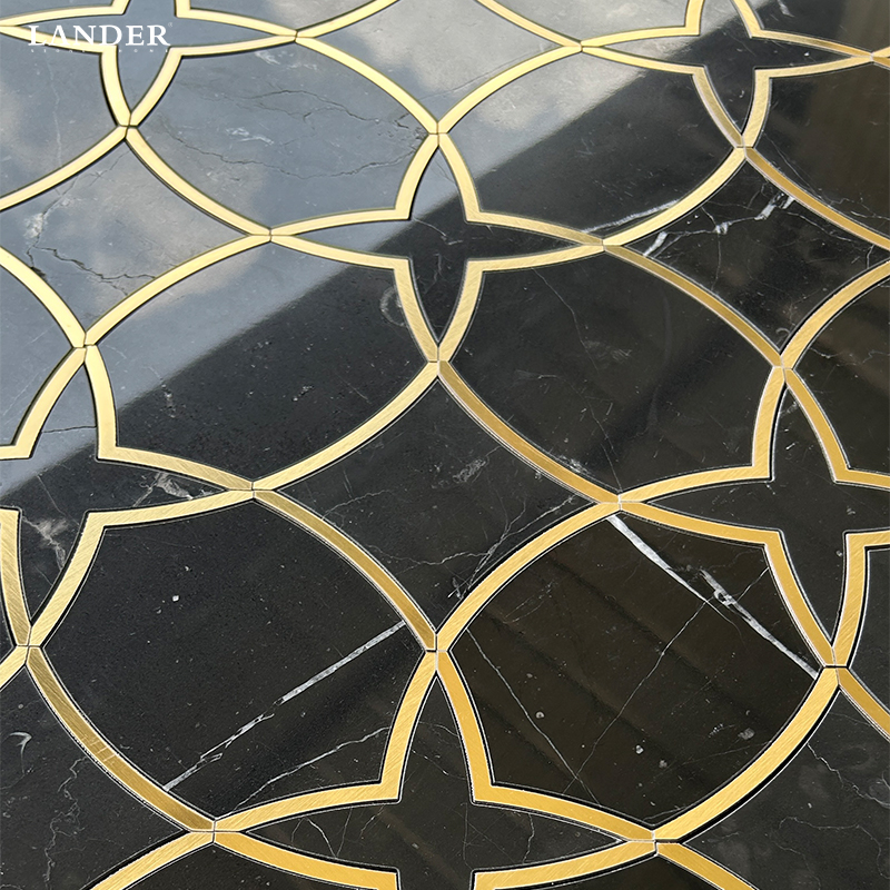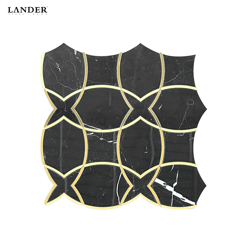 The Nero Marquina and Metal Waterjet Marble Mosaic Tile is a dramatic expression of modern luxury, where the intensity of natural stone meets the refined glow of metallic artistry.