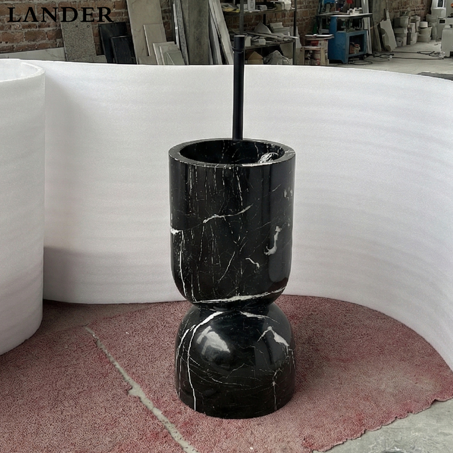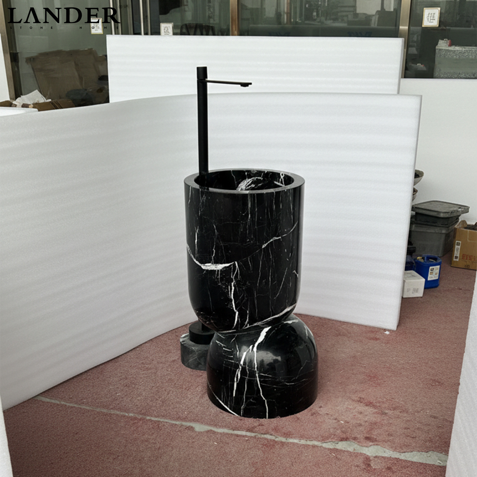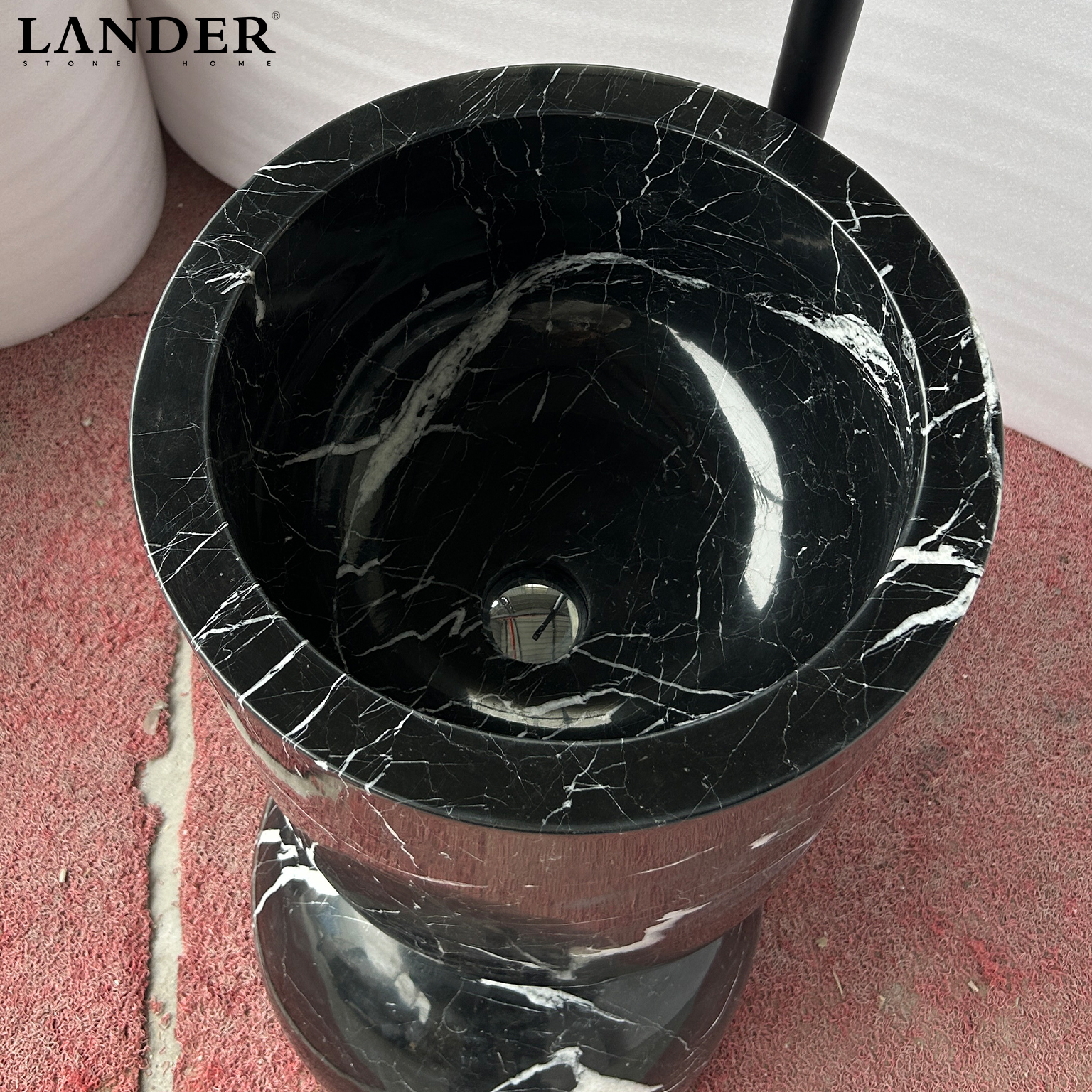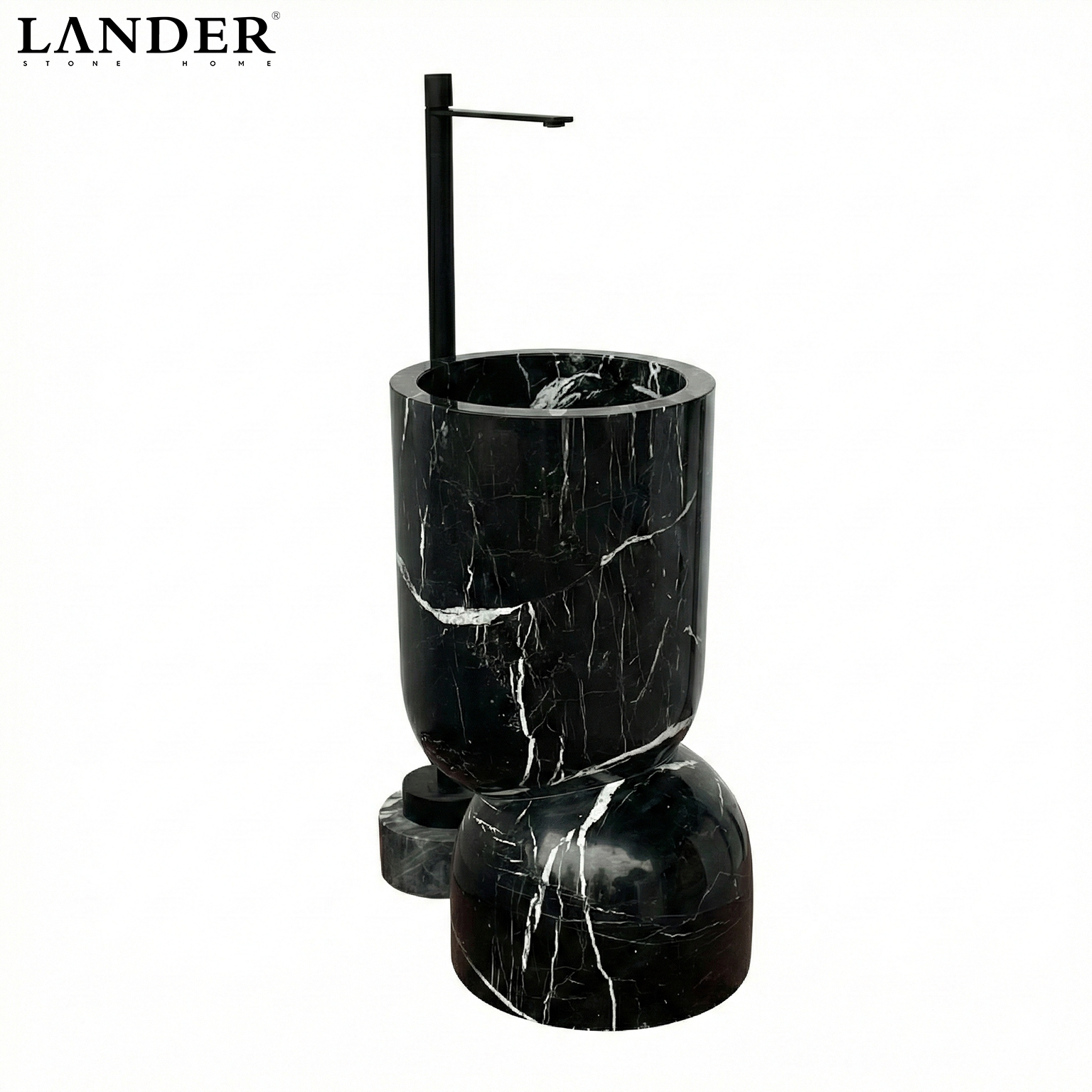 The Nero Marquina Marble Sink Column Basin is a daring reinterpretation of classical geometry and modern sculpture. Expertly carved from iconic Nero Marquina marble, it features a deep obsidian base electrified by stark, lightning-white veining.