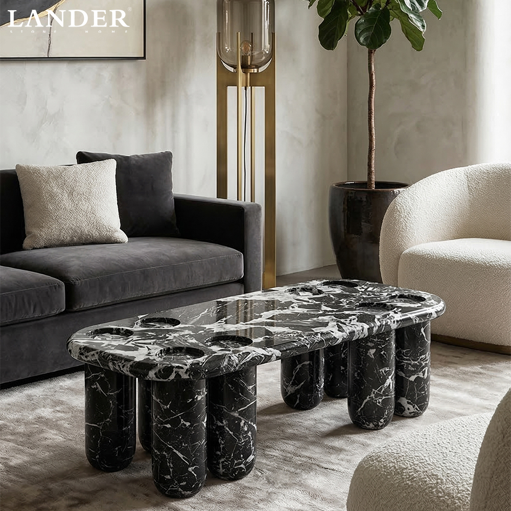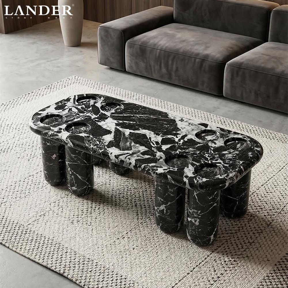 The Noir Grand Antique Marble Coffee Table is a playful yet highly sophisticated piece, perfectly balancing substantial natural materials with whimsical design. Crafted entirely from premium Noir Grand Antique Marble, the table features a polished black surface with bold, dramatic white veining that ensures every piece is unique. The long, rectangular top rests on multiple sculpted, rounded legs, creating a substantial yet softened silhouette. Further adding interest are the circular depressions carved into the surface, which serve as integrated coasters or display spots. This statement coffee table offers high-contrast visual drama and peerless quality, making it the ideal focal point for contemporary, high-fashion, or Art Deco-inspired living rooms.