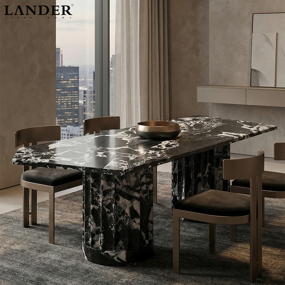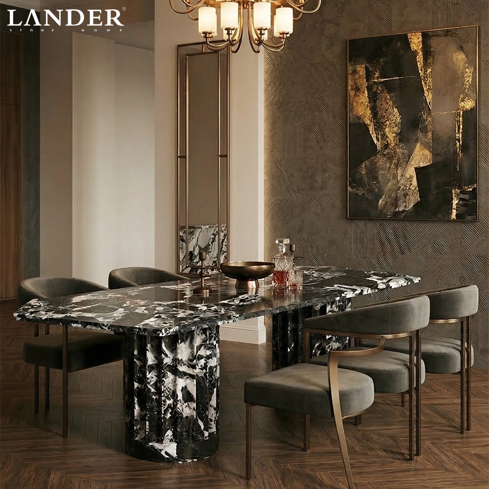 • High-Gloss Luxury Finish: Expertly polished to a mirror-like shine, the surface enhances the stone’s complex crystalline textures while providing a durable, heat-resistant, and easy-to-clean dining area.