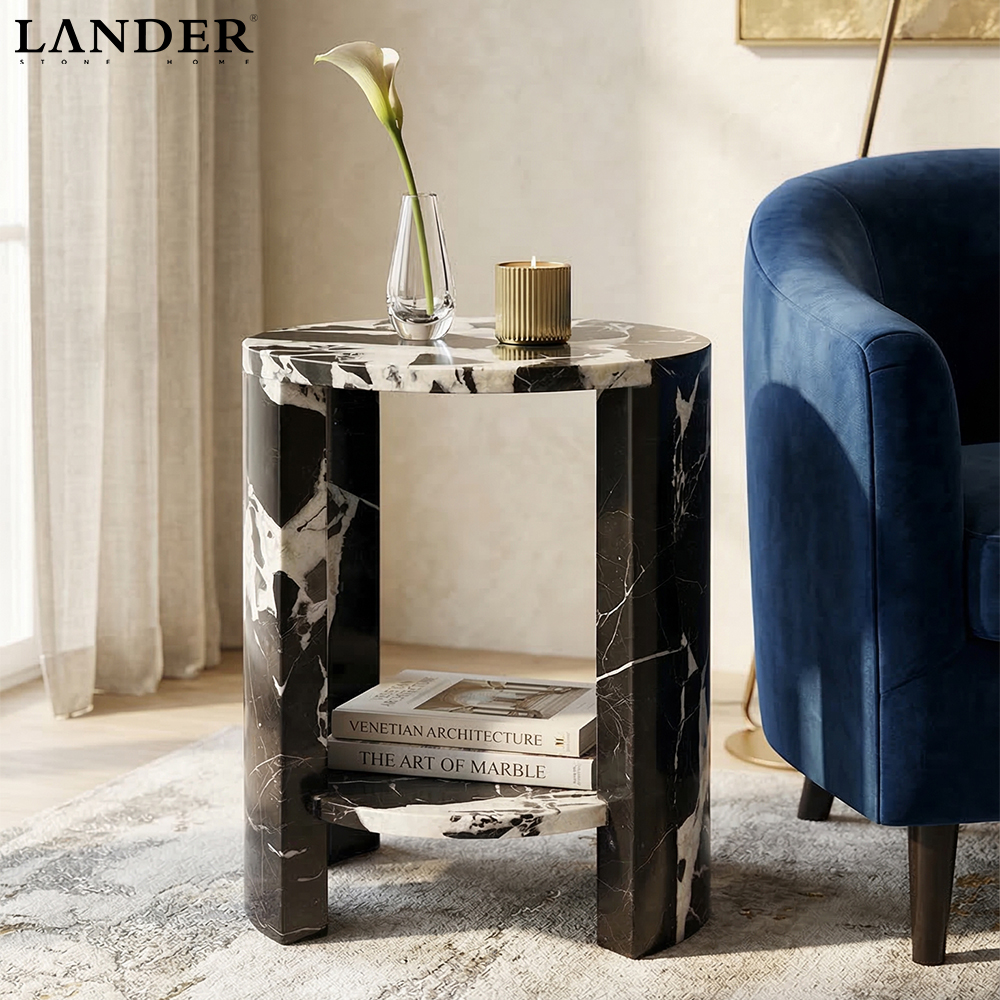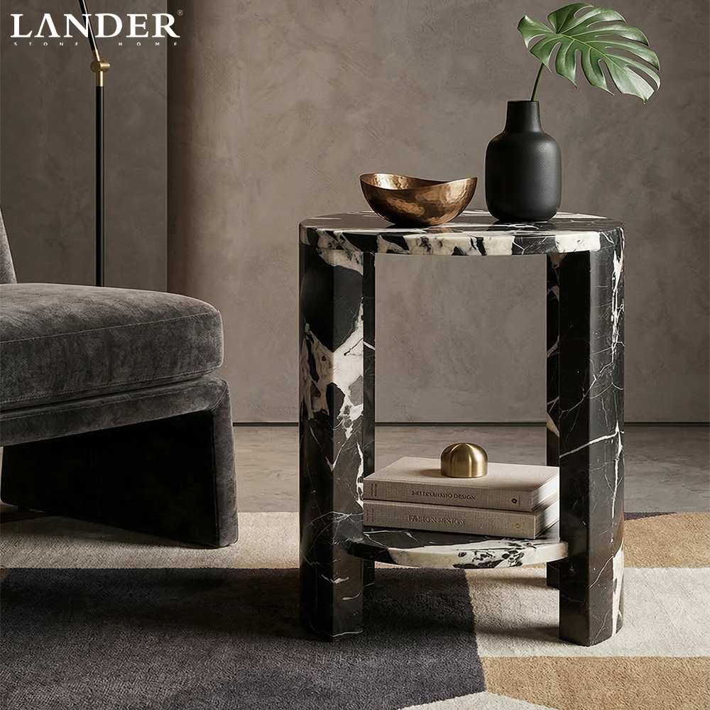 The Noir Grand Antique Marble Side Table celebrates bold contrast and timeless craftsmanship with genuine Grand Antique marble, renowned for its dramatic black-and-white veining. Hand-polished to a refined sheen, its sculptural round silhouette brings modern-luxe presence to any room while offering a sturdy, long-lasting surface. Each piece is naturally unique, making it a striking statement for contemporary or classic interiors alike.