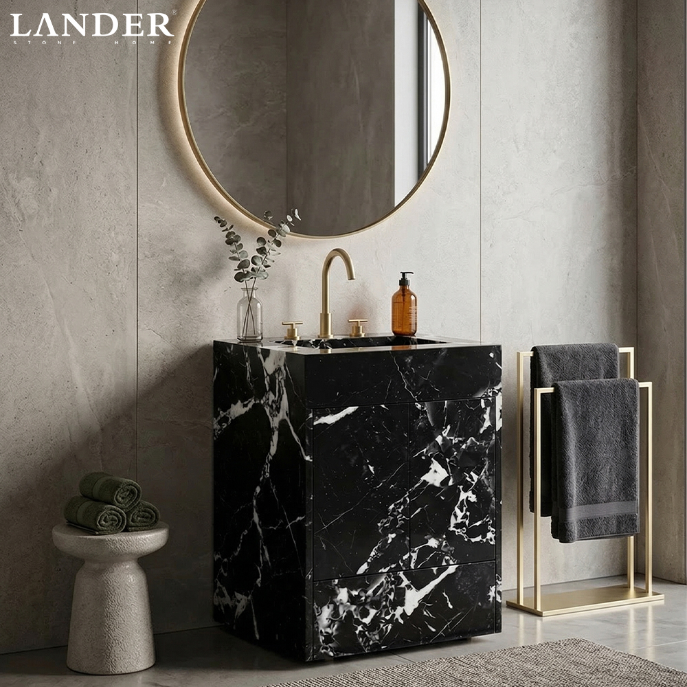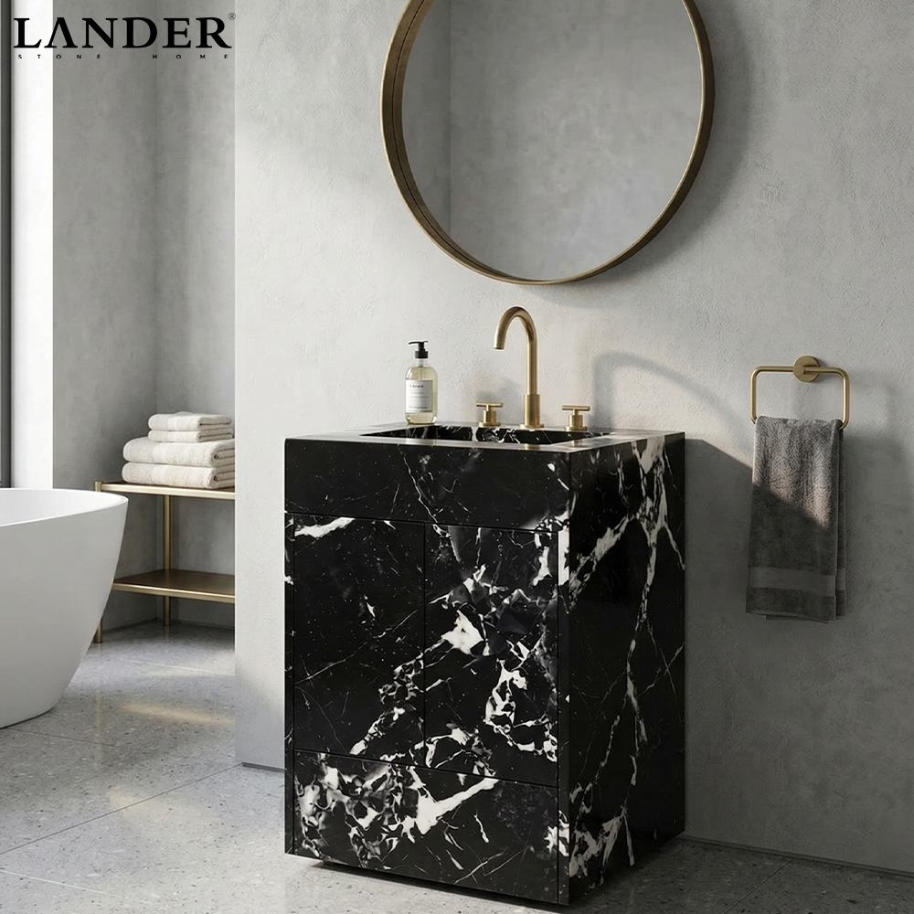 The Noir Grand Antique Marble Vanity Sink is a bold masterpiece of sculptural functionalism, showcasing one of the world’s most prestigious and visually dramatic natural stones. Carved from authentic Noir Grand Antique marble, this vanity is defined by its high-contrast “shattered” aesthetic, where deep obsidian black segments are struck by vivid, lightning-like white veins. The design features a monolithic block silhouette with an integrated rectangular basin, presenting a seamless and powerful architectural volume that anchors the bathroom with a sense of “Quiet Luxury.” Expertly polished to a mirror-like finish, the stone’s dense crystalline structure offers exceptional durability and a non-porous surface when properly sealed. It is the definitive centerpiece for high-end powder rooms, executive suites, and luxury residential spa interiors seeking a timeless yet avant-garde statement.