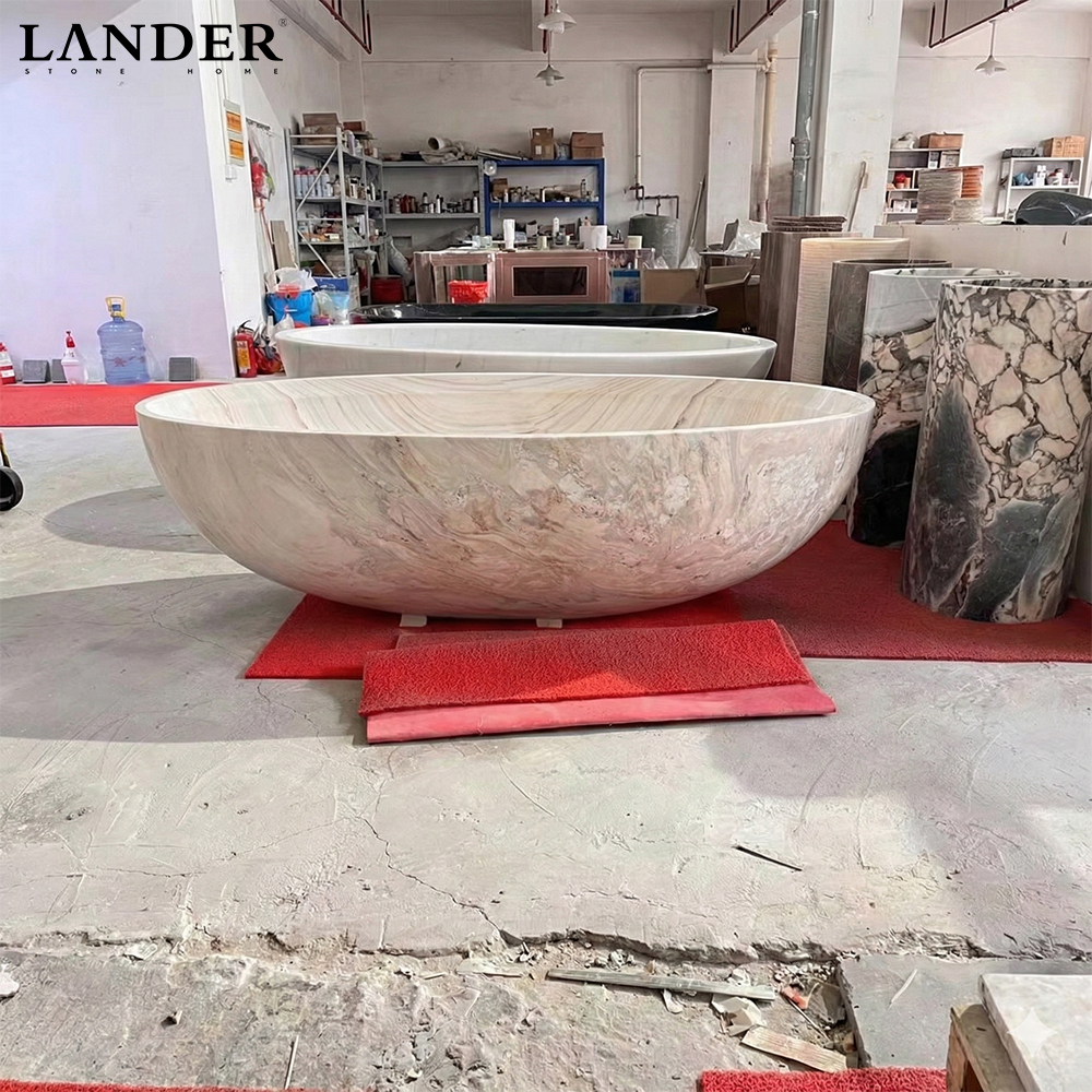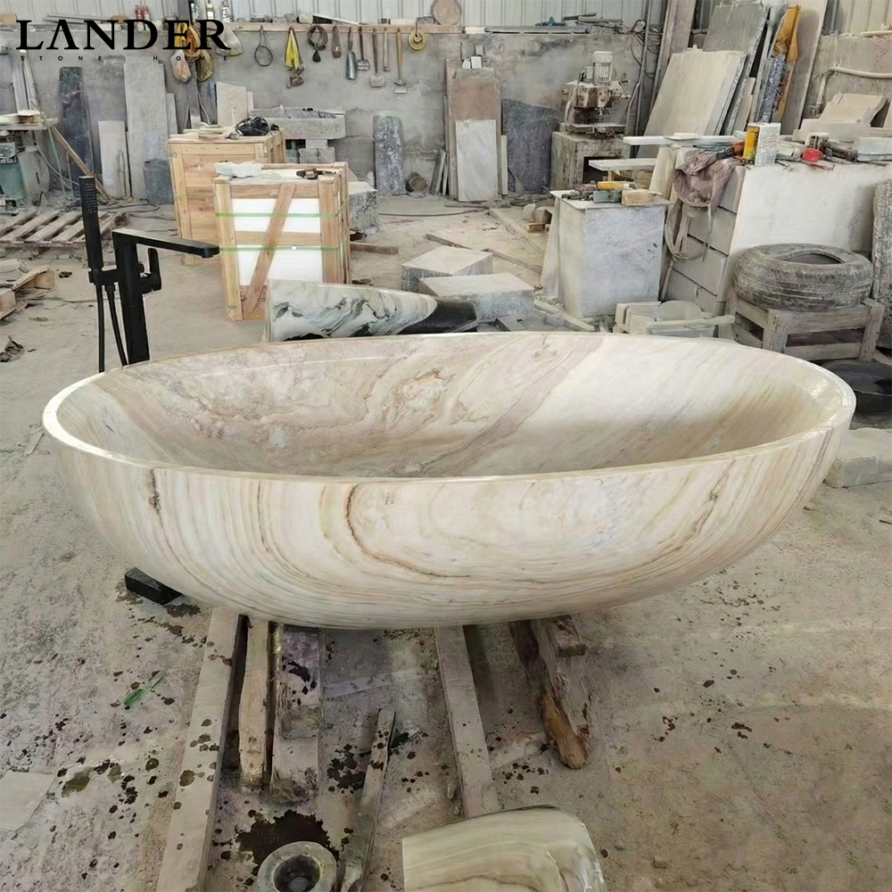 The Palissandro White Marble Bathtub is a breathtaking masterpiece of natural design, celebrated for its unique “wooden-vein” aesthetic that brings a warm, organic soul to the modern villa. Expertly carved from a single, massive block of premium Palissandro White marble, this bathtub features a soft, cream-white base characterized by elegant, linear veining in shades of sandy beige and muted hazel. The design showcases a minimalist oval silhouette with a deep, ergonomic basin and a smooth, hand-finished rim, offering a sublime soaking experience that mirrors the serenity of a private spa. Its solid stone construction provides exceptional natural insulation, maintaining water temperature far longer than traditional materials. This monolithic bathtub serves as a sophisticated focal point, perfect for high-end master suites, luxury wellness retreats, and architectural projects that seek to blend natural textures with elite craftsmanship.