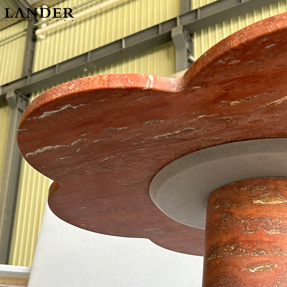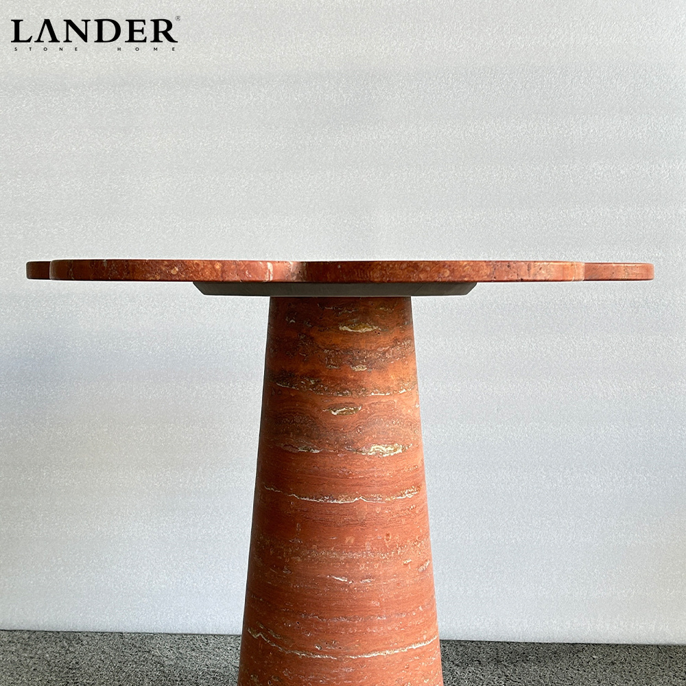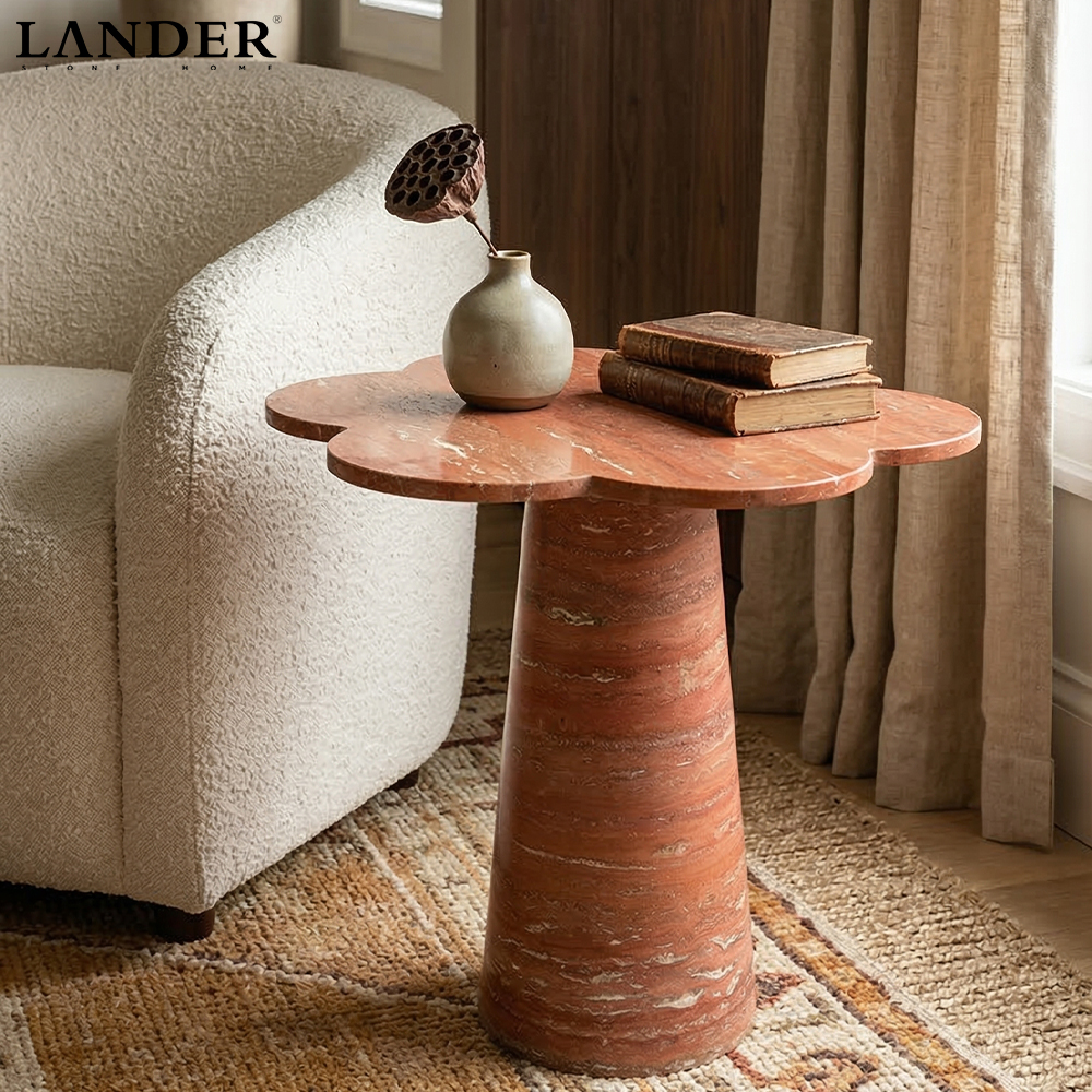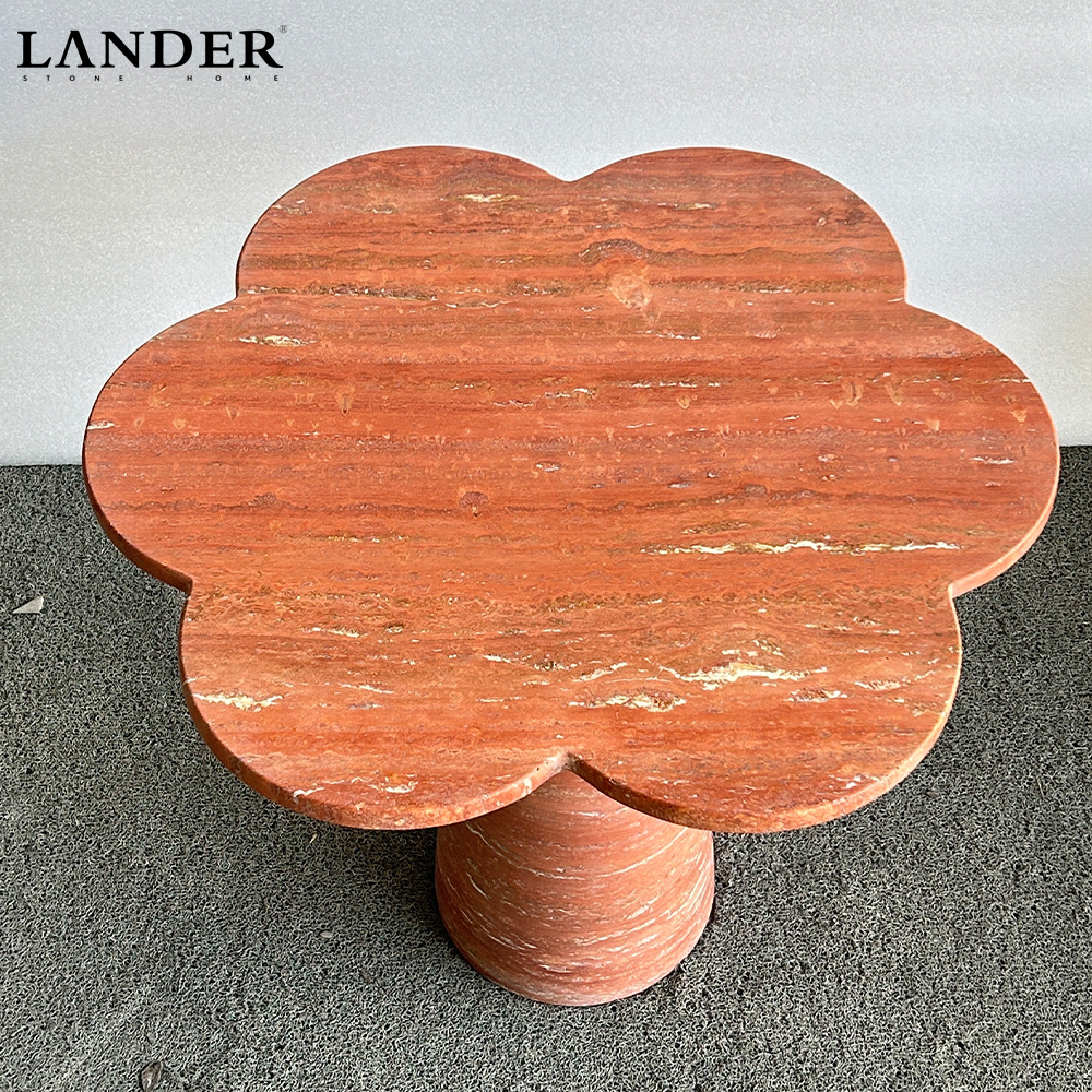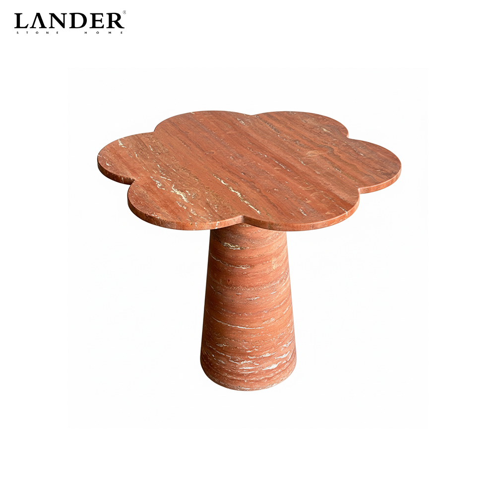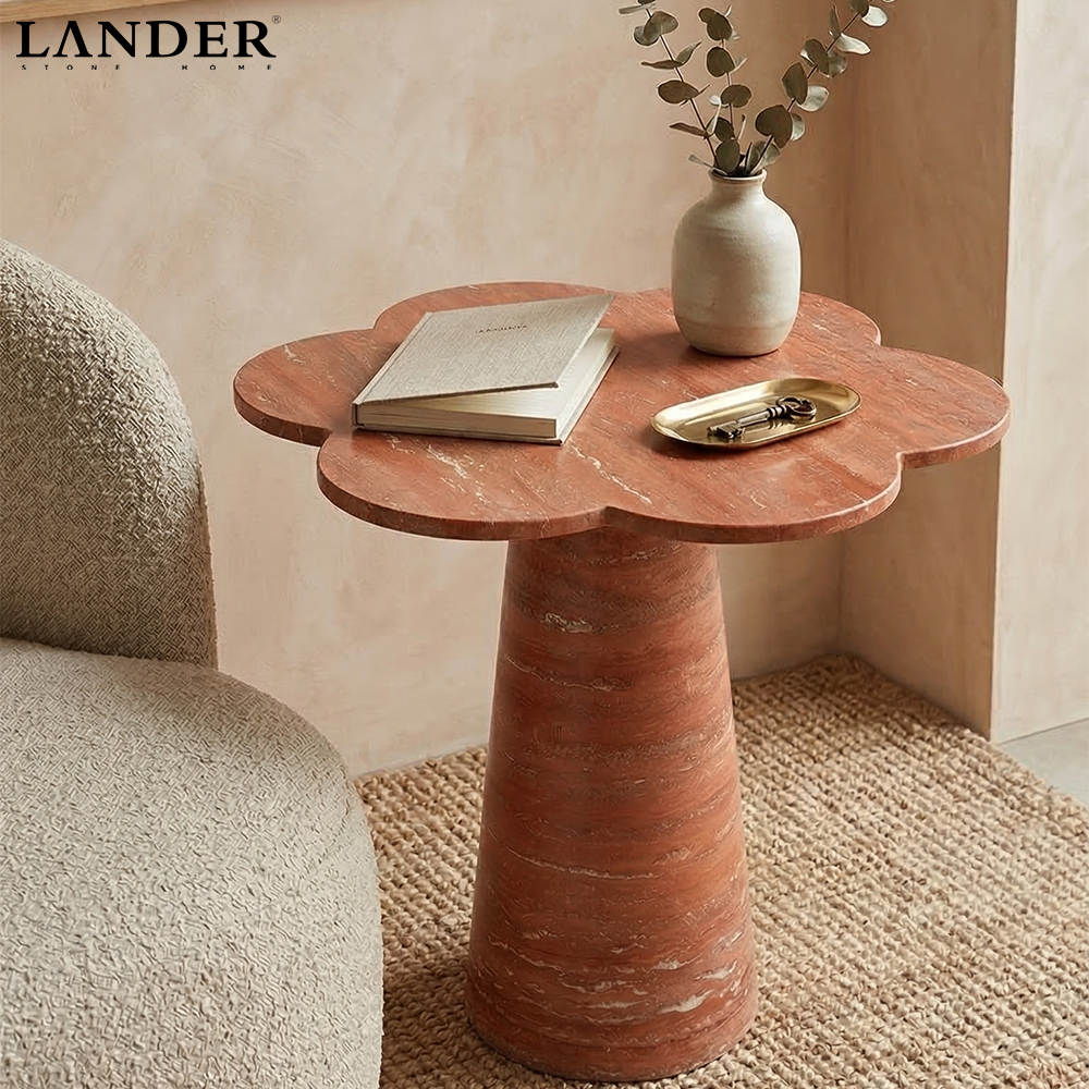 The Red Travertine Flower Design Marble Side Table blooms with sculptural charm, featuring a petal-shaped top carved from genuine red travertine with warm terracotta tones and natural pores. Hand-honed for a smooth touch, its tapered pedestal base provides sturdy support while showcasing the stone’s unique variations. Ideal as a living-room accent or bedside companion, it adds a playful yet refined statement to contemporary or classic interiors