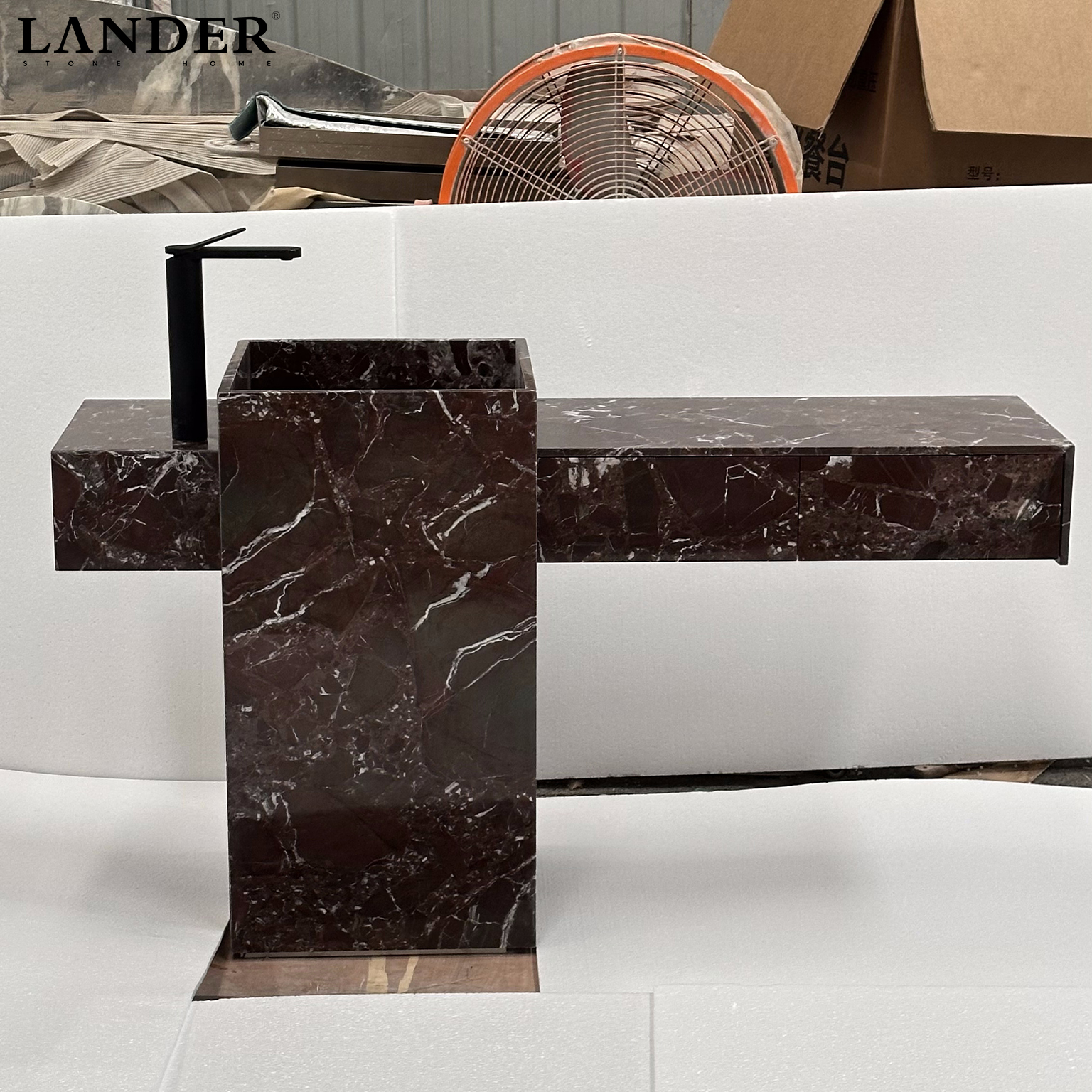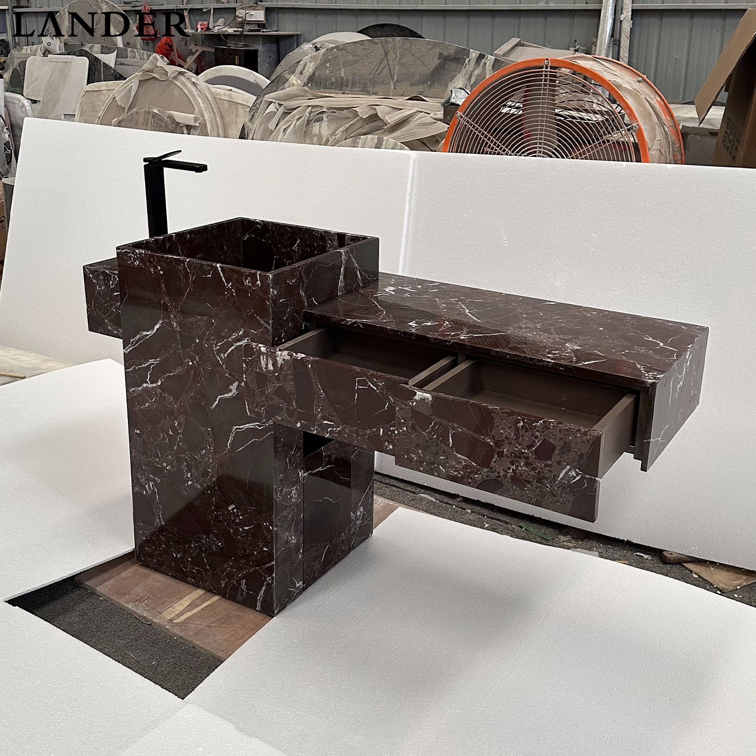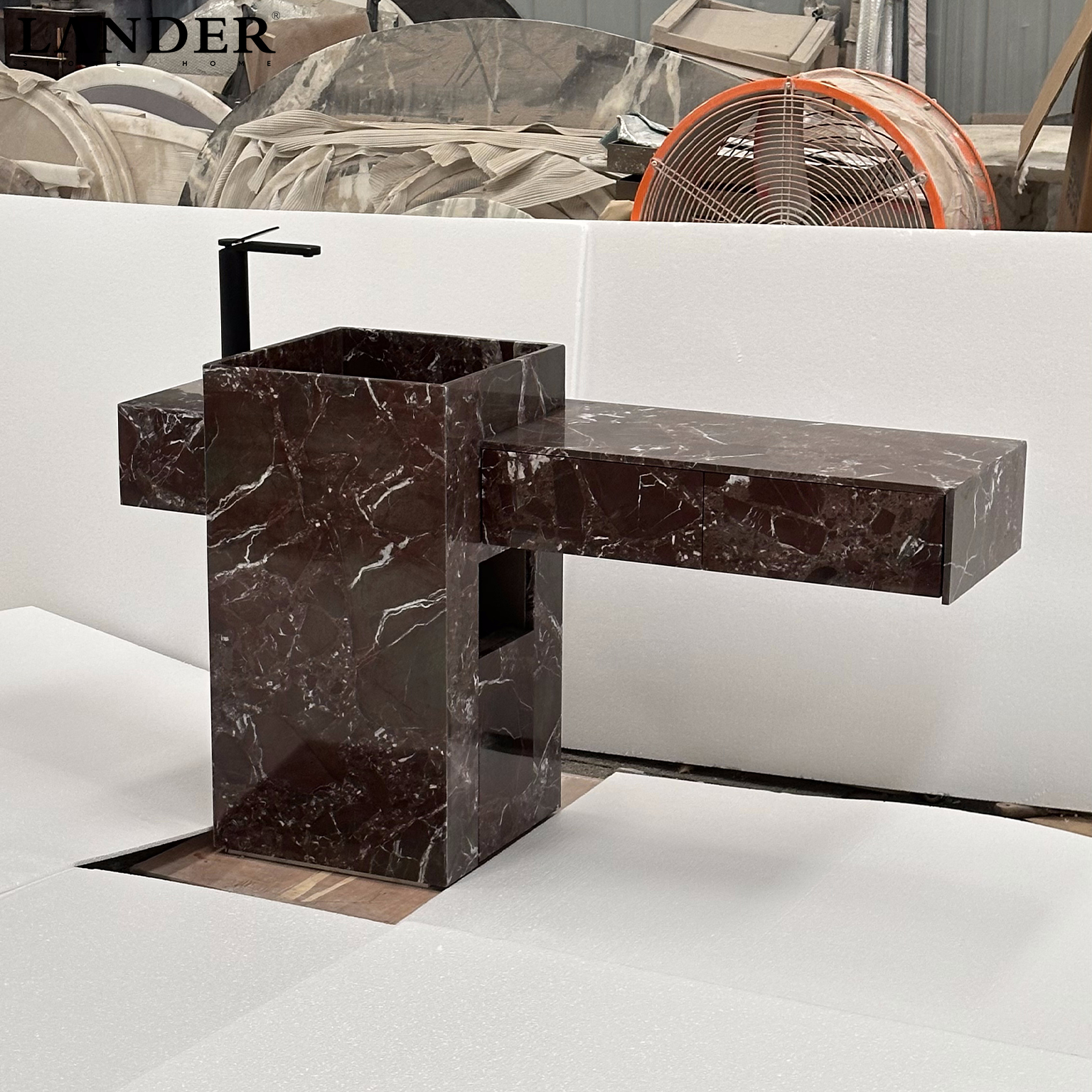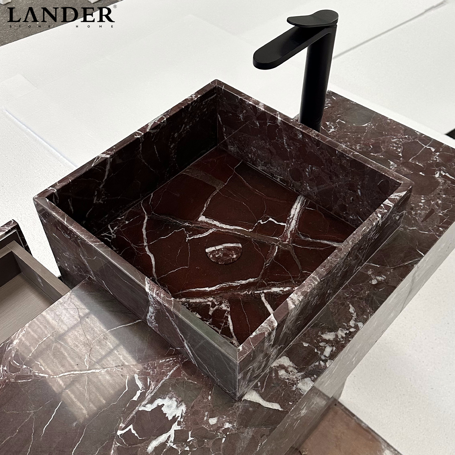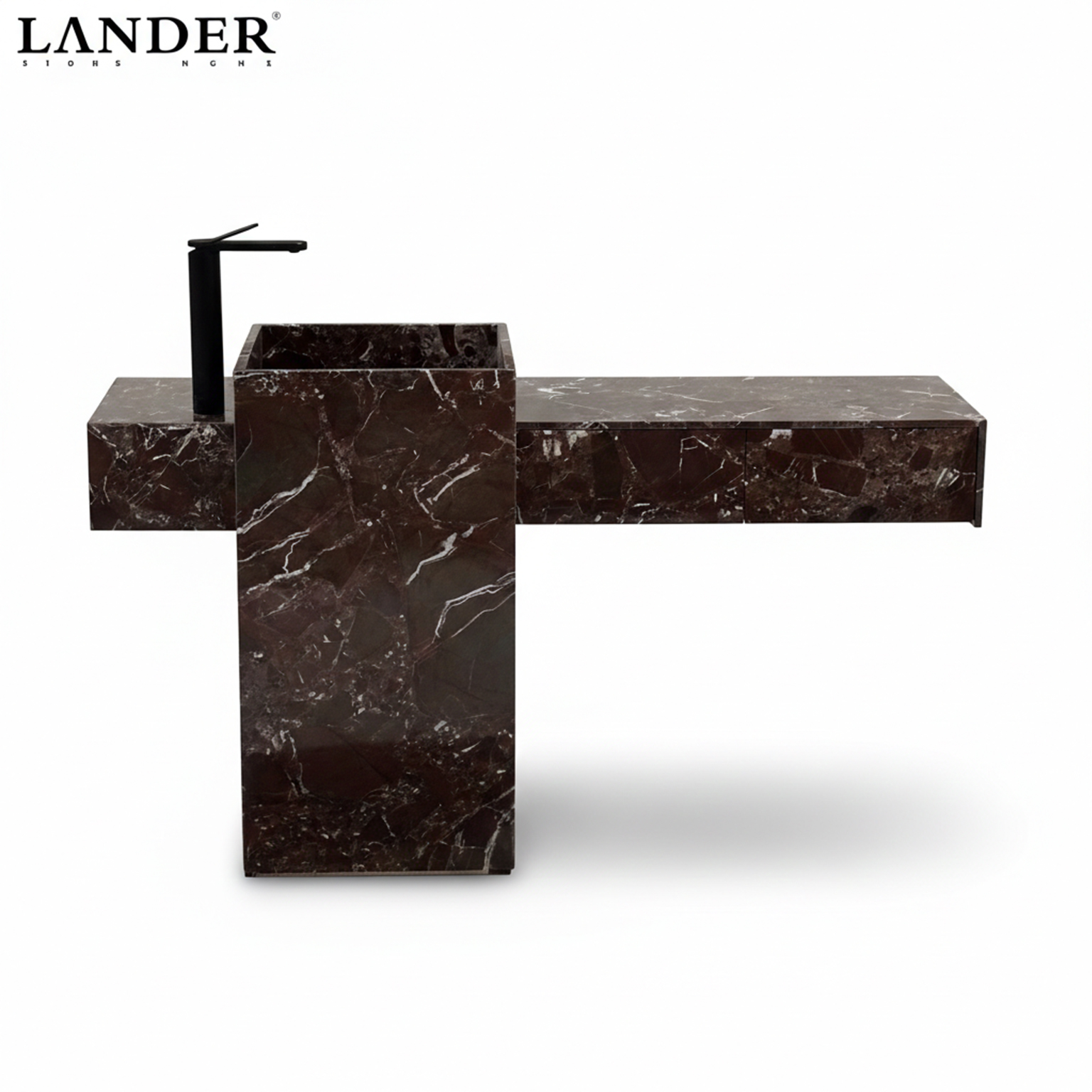 The Rosa Levanto Marble Sink is a breathtaking masterpiece of architectural contrast and natural drama. Carved from the world-renowned Rosa Levanto marble, it features a deep, sophisticated cherry-red to chocolate-brown base, electrified by a vibrant network of striking white crystalline veins. The design showcases an innovative asymmetrical cantilevered silhouette, where a monolithic basin block intersects a slender, integrated vanity wing.