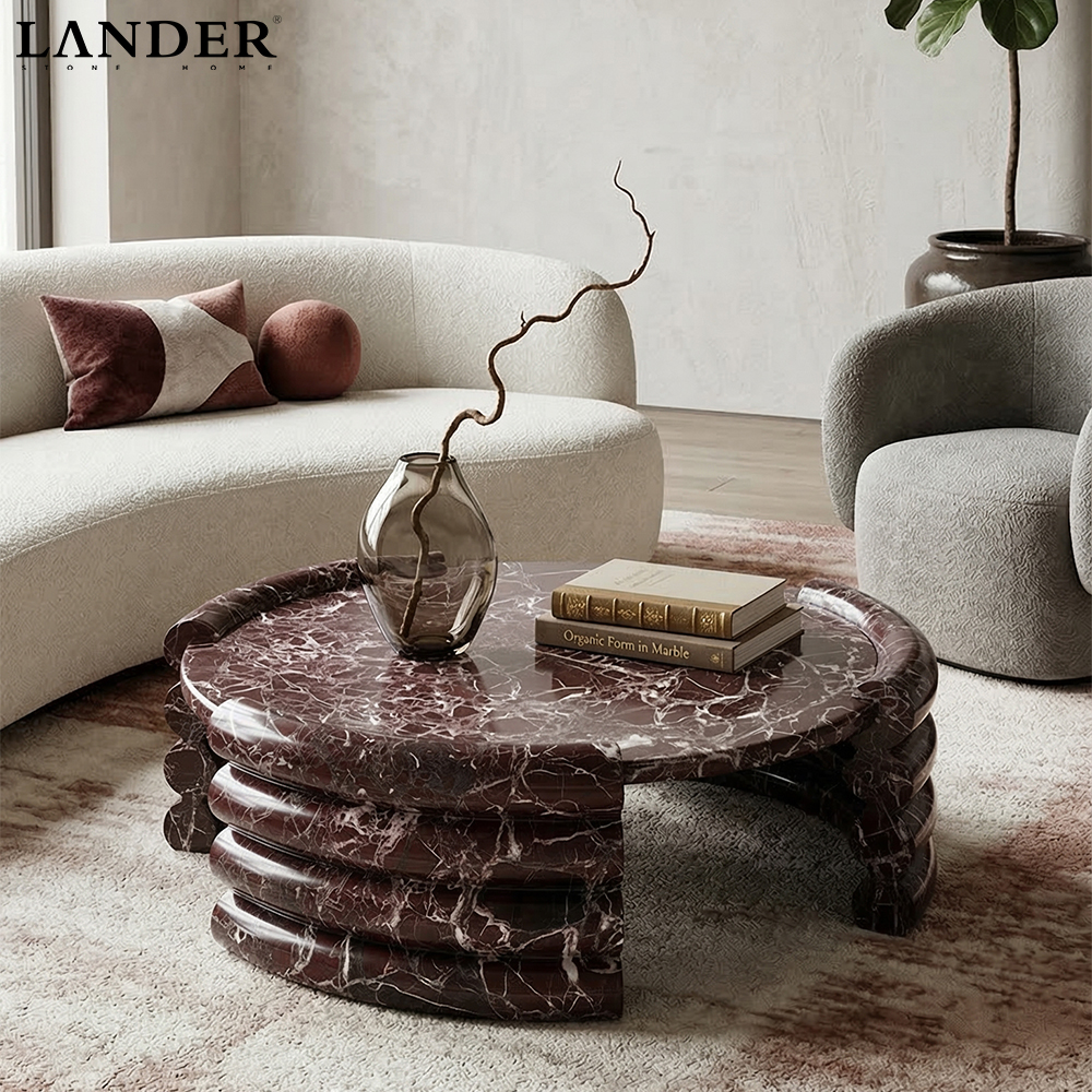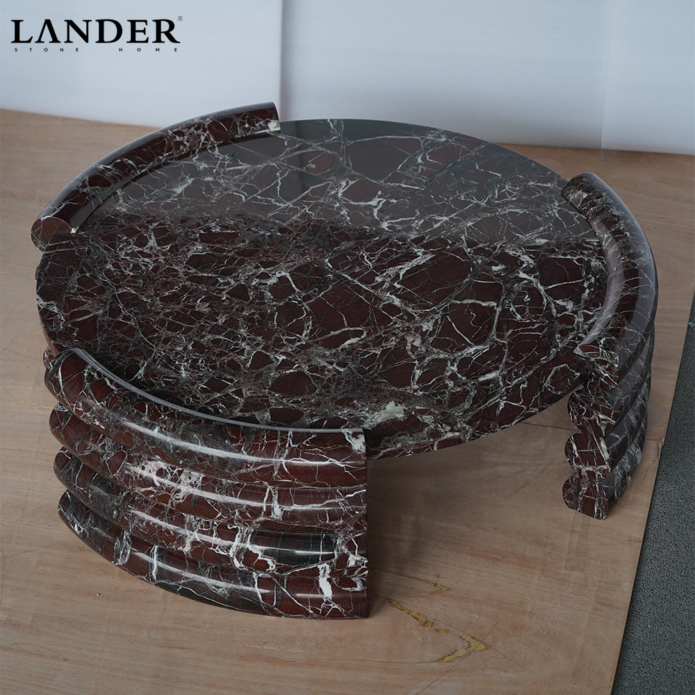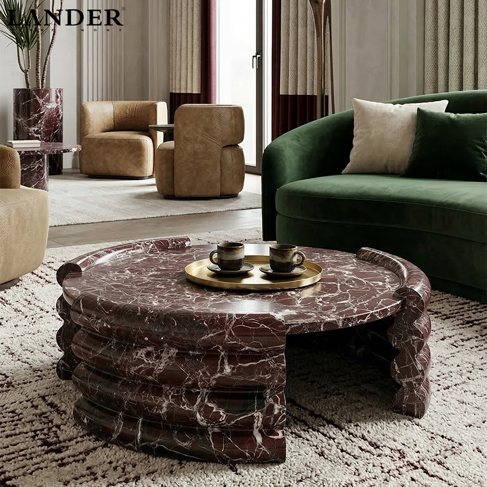 The Rosa Levanto Round Marble Coffee Table showcases rich wine-red hues and crisp white veining, crafted from genuine Rosa Levanto stone and honed to a smooth, tactile finish. Its balanced circular silhouette offers a low, sculptural presence that anchors living spaces with understated luxury. Naturally dense and heat-resistant, the solid marble top provides durable everyday function, while each table’s unique patterning ensures a one-of-a-kind centerpiece for modern, eclectic, or classic interiors.
