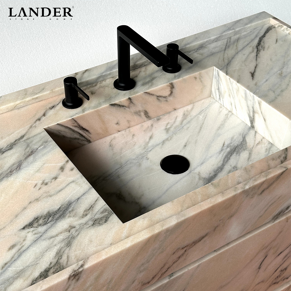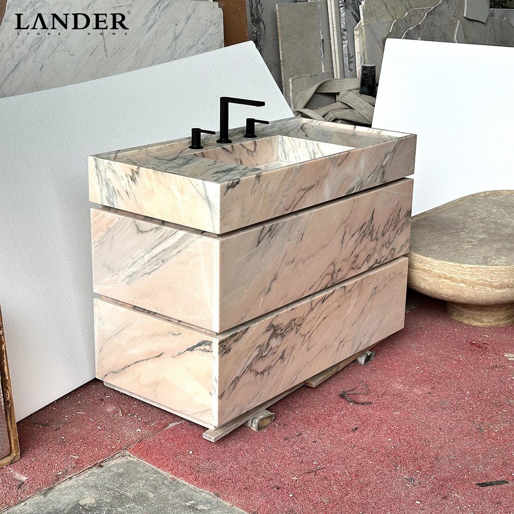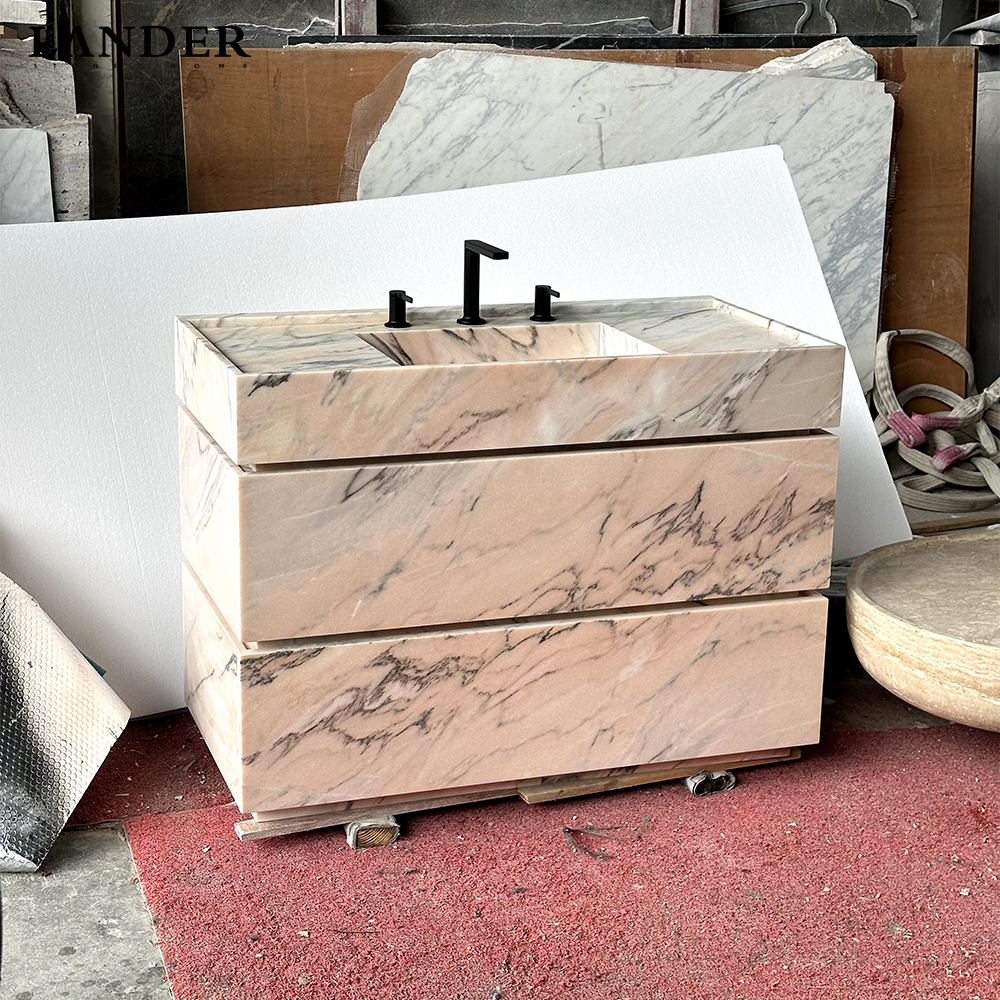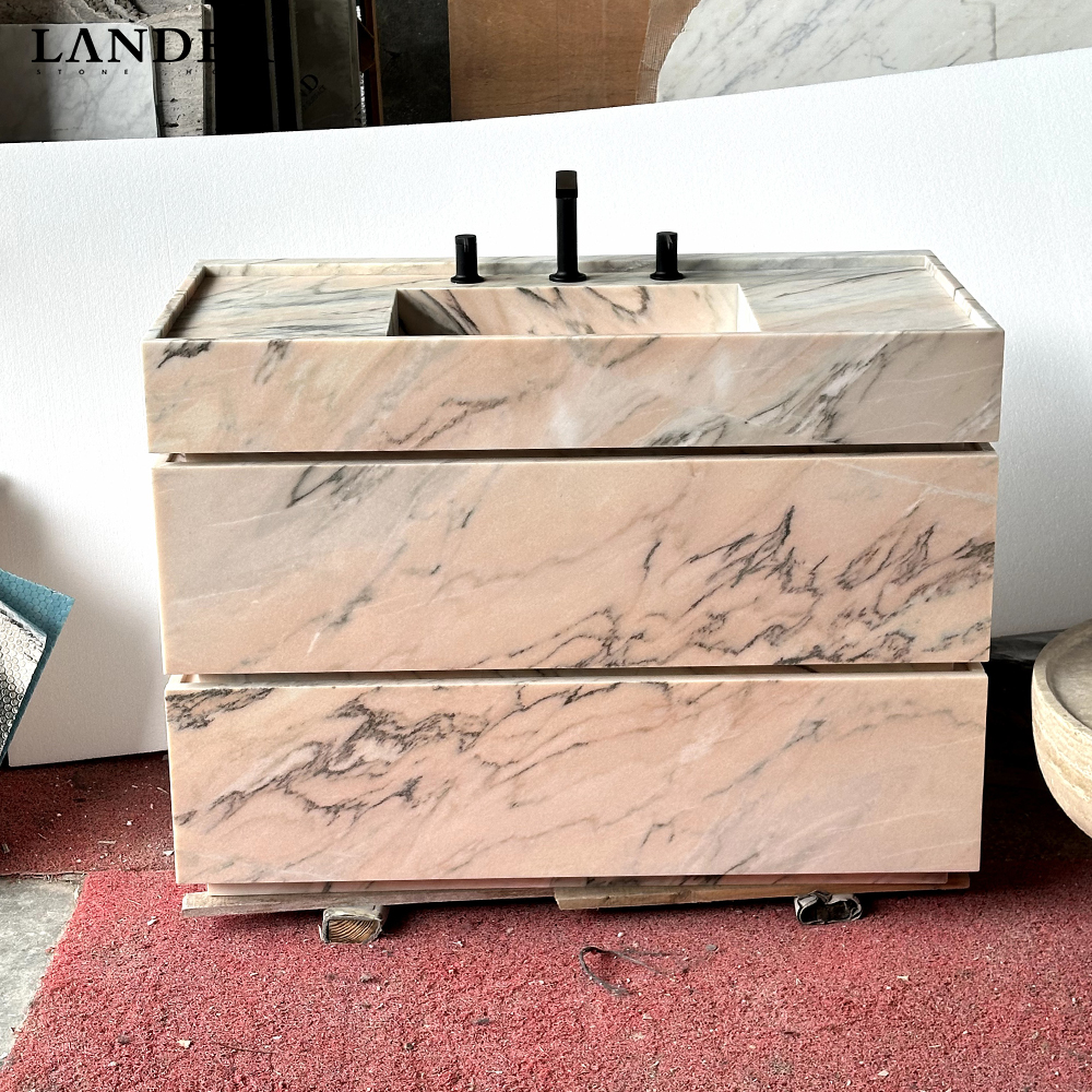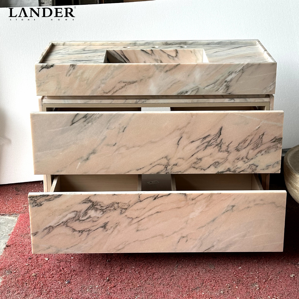 The Rosa Portugallo Marble Vanity with Two Drawers combines the delicate beauty of Rosa Portugallo marble with the functionality of practical storage. The marble surface, featuring soft pink and beige tones with subtle veining, offers a refined, luxurious look that enhances any bathroom or dressing area. Its polished finish not only adds to its elegance but also ensures durability and ease of cleaning. The two spacious drawers provide convenient storage for toiletries and personal items, making it a perfect blend of style and practicality. This vanity’s timeless design complements both modern and traditional interiors, bringing a touch of sophistication to any space.