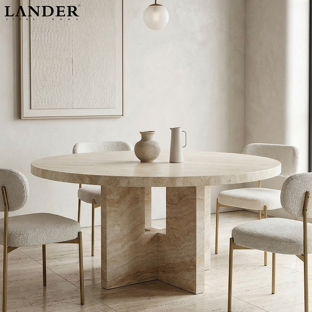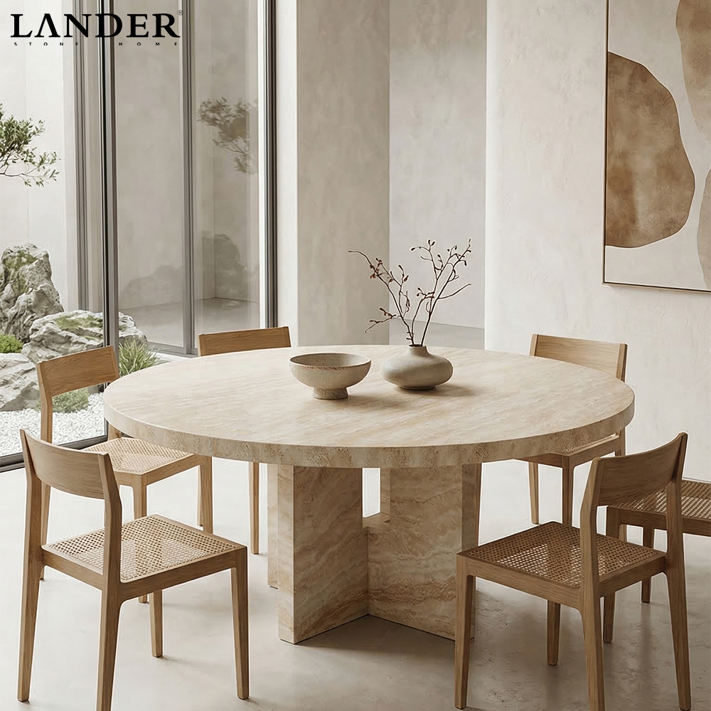 Natural Travertine Artistry: Crafted from select Beige Travertine, offering a rich, earthy texture and unique sediment banding that makes every table a one-of-a-kind natural piece.