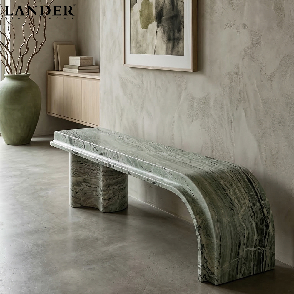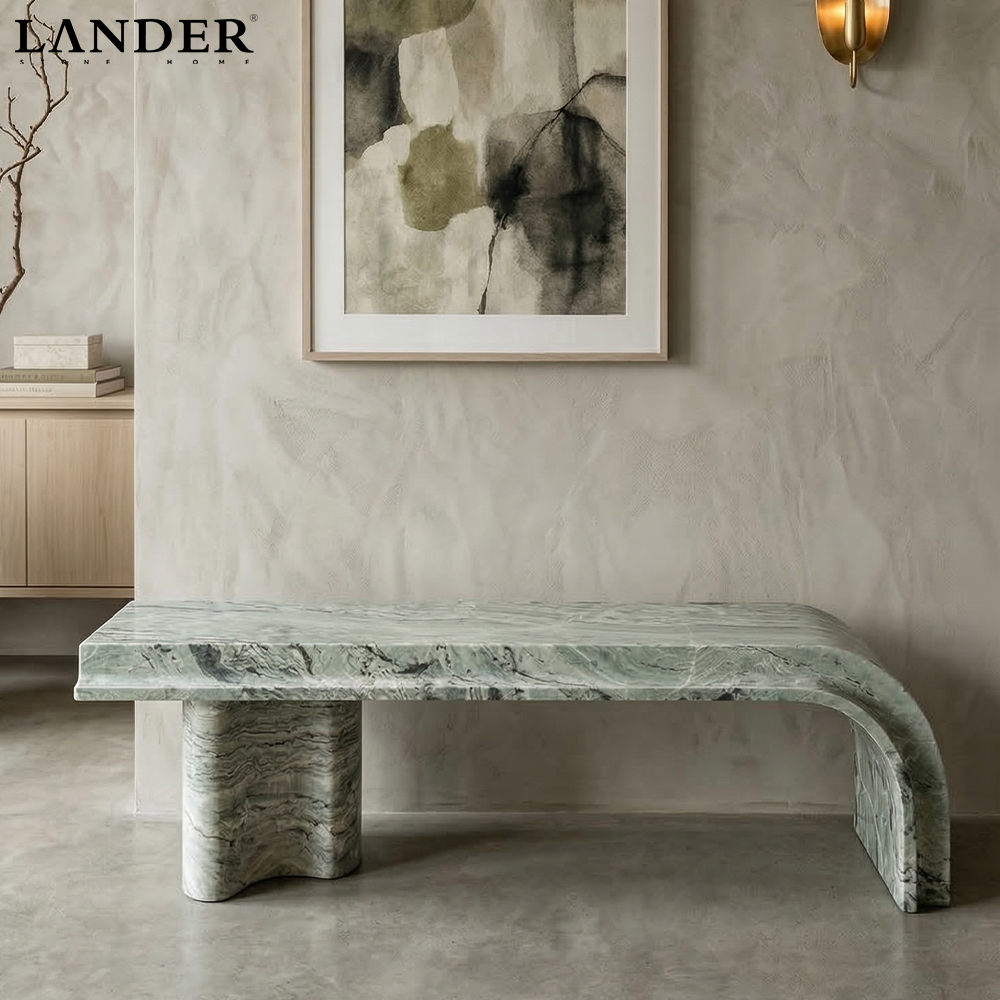 The Shangrila Green Marble Bench is a breathtaking fusion of avant-garde design and natural serenity. Carved from premium Shangrila Green marble, it showcases a mesmerizing tapestry of sage and emerald waves that mimic a lush, misty landscape.