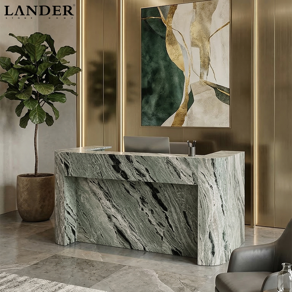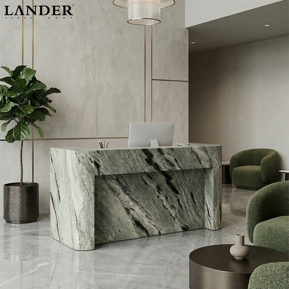Exotic Shangrila Green Marble: Features a rare and mesmerizing palette of multi-tonal greens and dynamic veining, ensuring your reception area boasts a unique, natural masterpiece.