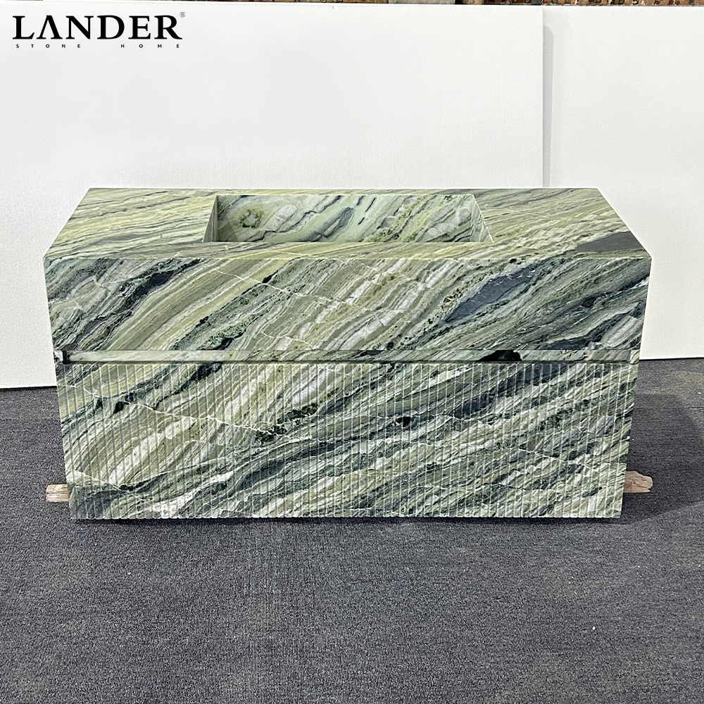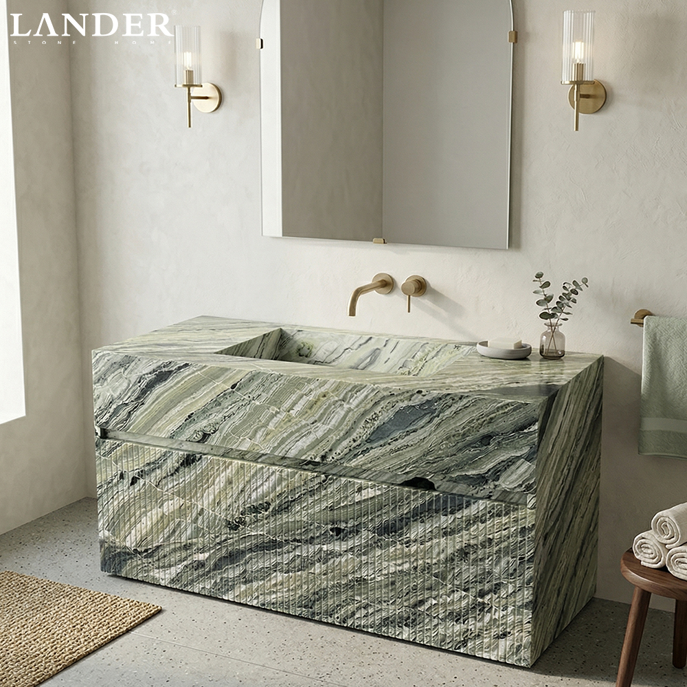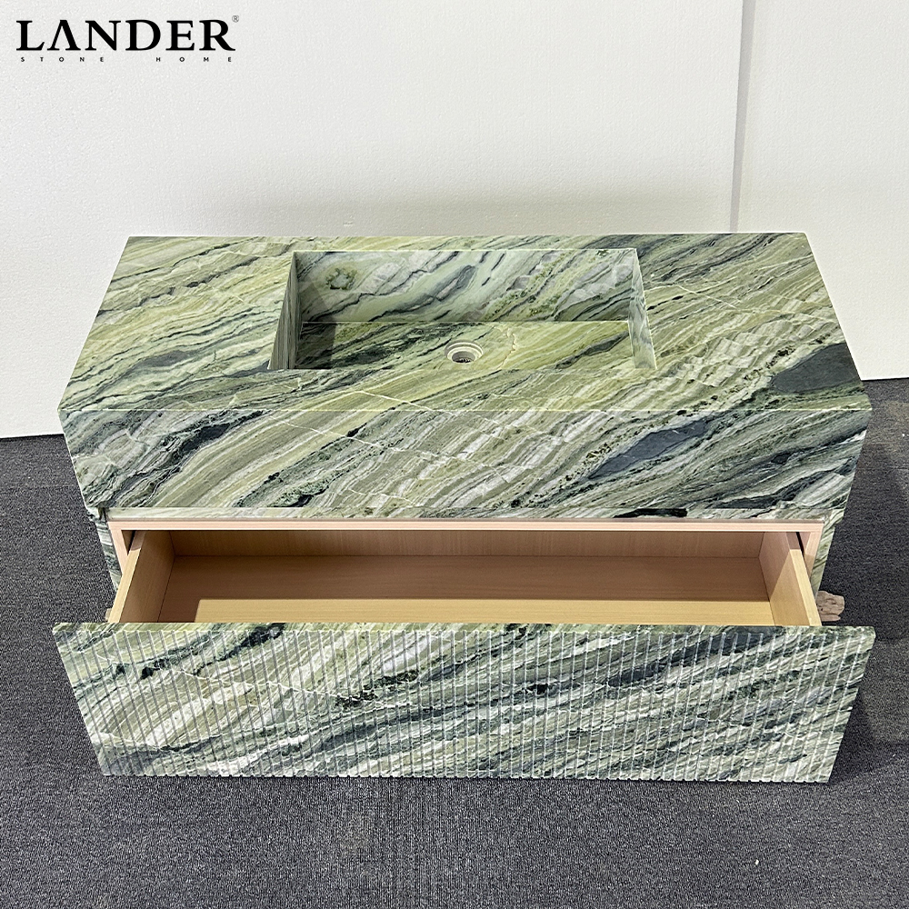 The Shangrila Green Marble Sink Vanity with Drawer is a monumental fusion of untamed natural beauty and modern functional design, expertly carved from a solid block of premium Shangrila Green marble.
