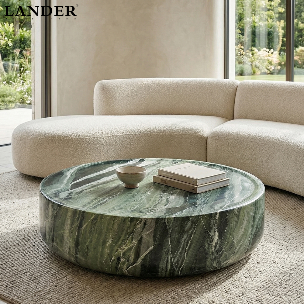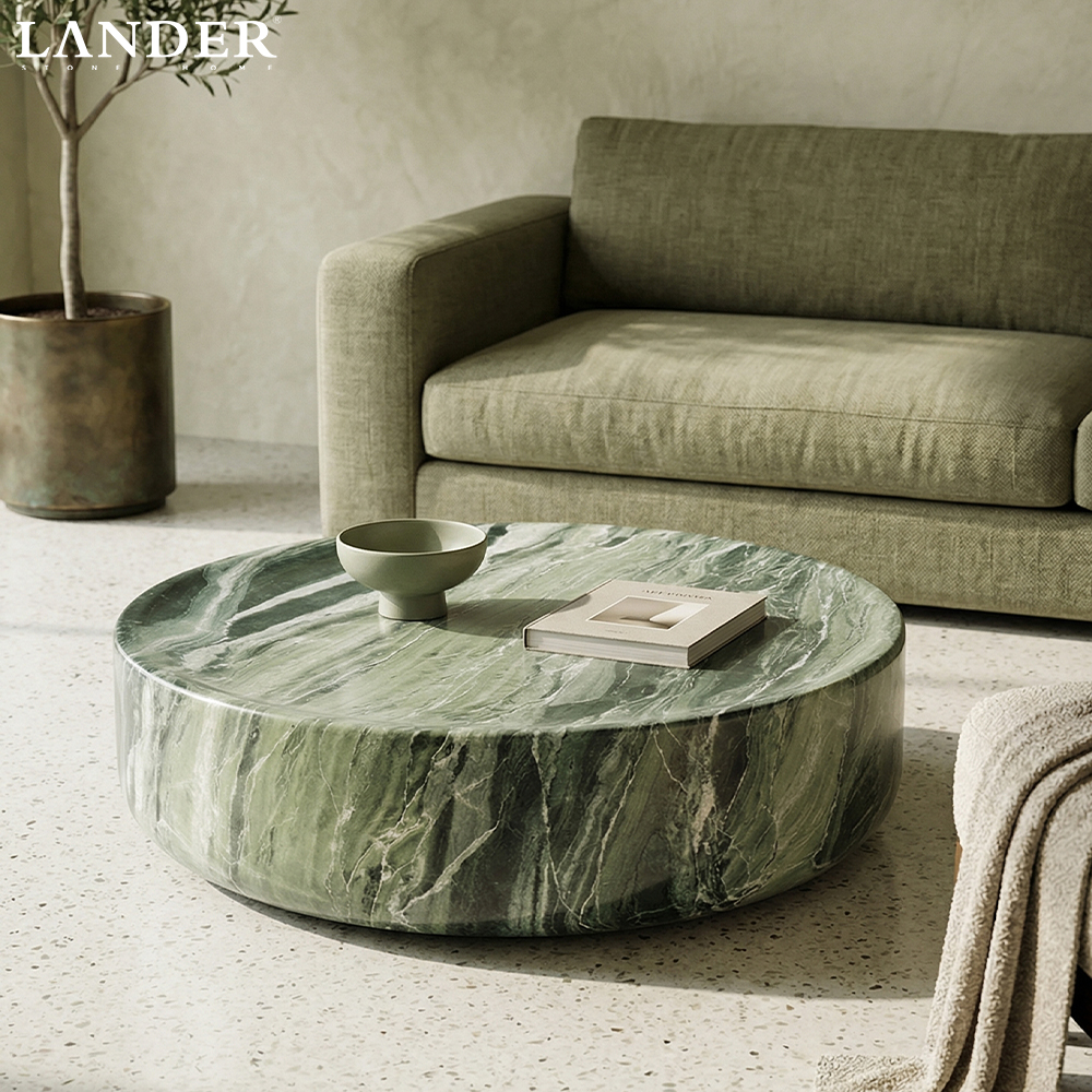 The Shangrila Green Round Low Marble Coffee Table is a bold, monolithic centerpiece that brings the serene drama of nature into your home. This stunning, substantial table is crafted entirely from premium Shangrila Green Marble, known for its intense palette of deep emerald and olive hues defined by striking, sweeping bands of lighter veining. The design features a simple, low-profile cylindrical (drum) shape that is polished smooth, maximizing the visual impact of the stone’s movement and color across the entire surface. Perfect as a primary coffee table or a high-end sculptural pedestal, this piece offers enduring luxury and is designed to be the defining focal point of any contemporary living space or lounge.
