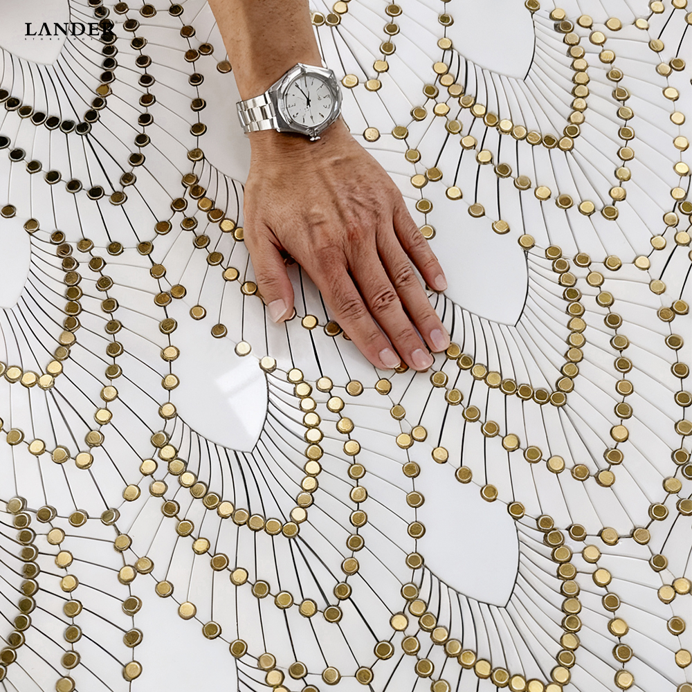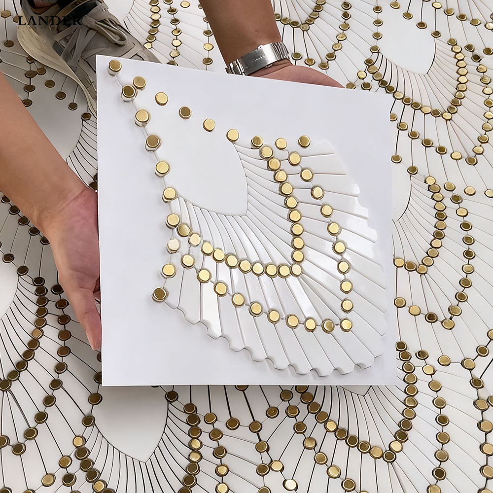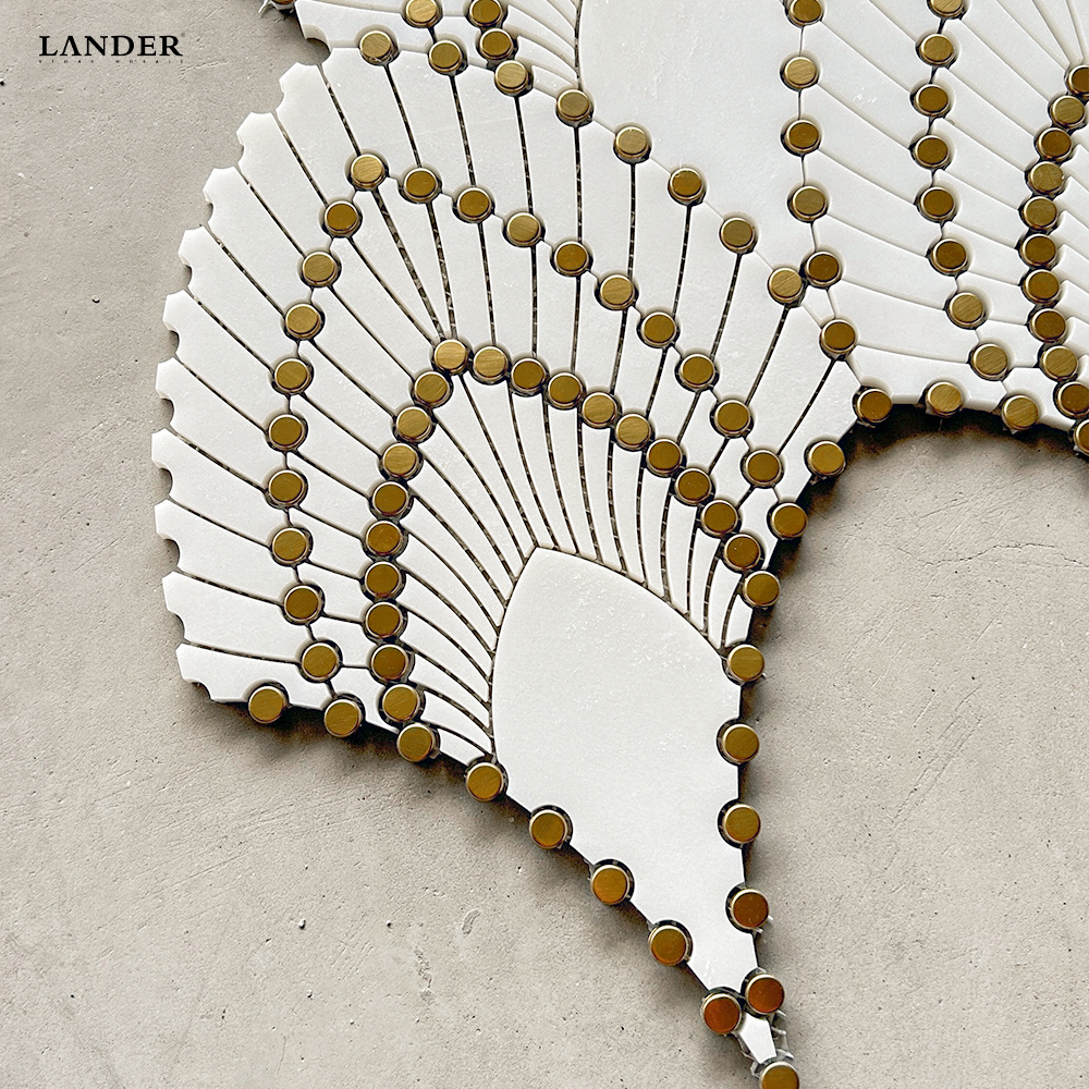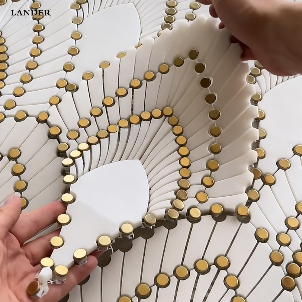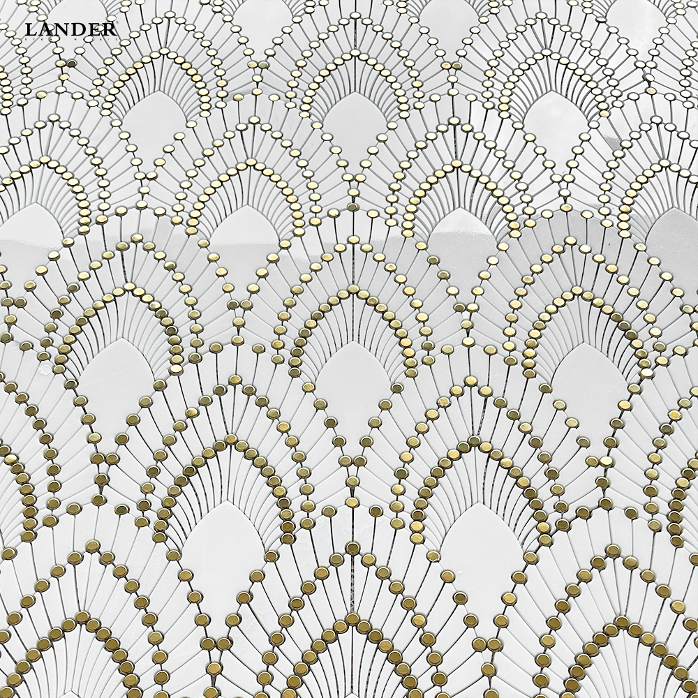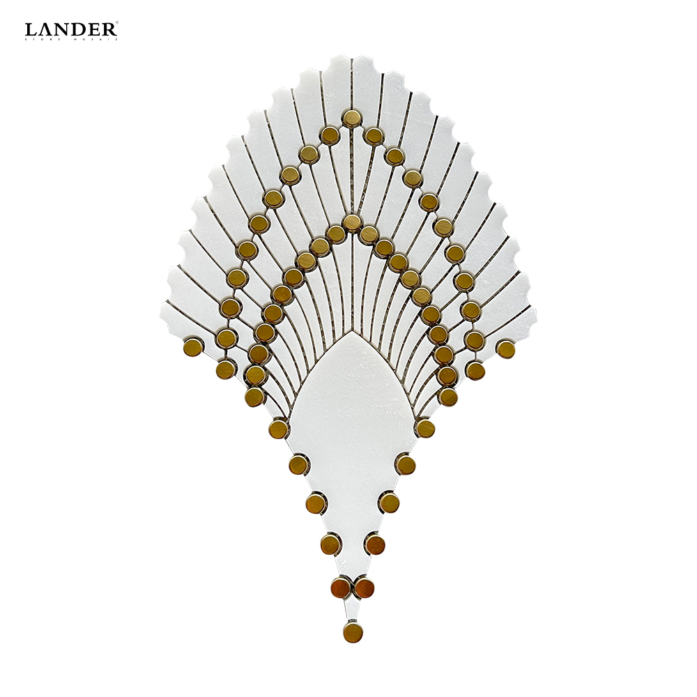 Art Deco Focal Point: The distinctive Fan-shaped (Feather) Waterjet Design is complemented by polished metal accents, creating a high-end, sophisticated pattern that commands attention.