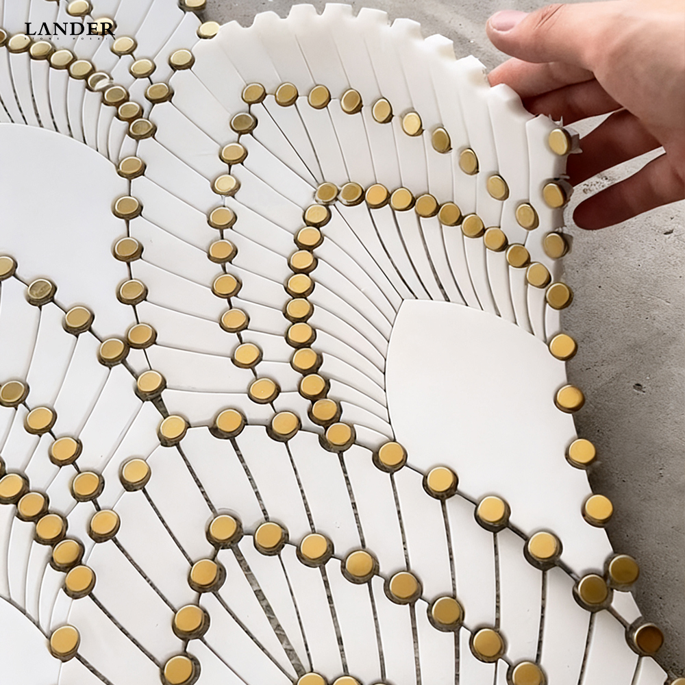 The Sivec Marble and Metal Waterjet Mosaic Tile is an exquisite, fan-shaped design that evokes Art Deco elegance and natural beauty, featuring the prestigious Sivec White Marble known for its exceptional purity and subtle, uniform grain. This pattern is meticulously cut by precision waterjet, creating feather-like ribs and a delicate, flowing silhouette. The luxurious white marble is beautifully accentuated by polished metal marble dots, adding a touch of golden reflectivity and rich contrast. Mounted on a mesh backing for simplified installation, this tile delivers timeless luxury, durability, and a breathtaking focal point, making it ideal for high-impact backsplashes, vanity walls, or niche details in high-end residential and boutique hotel interiors.