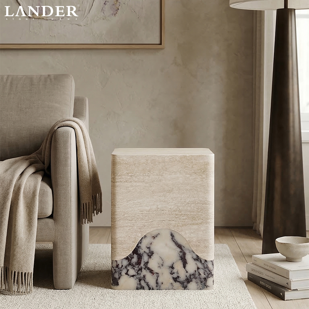 Travertine and Calacatta Voila Marble Side Table