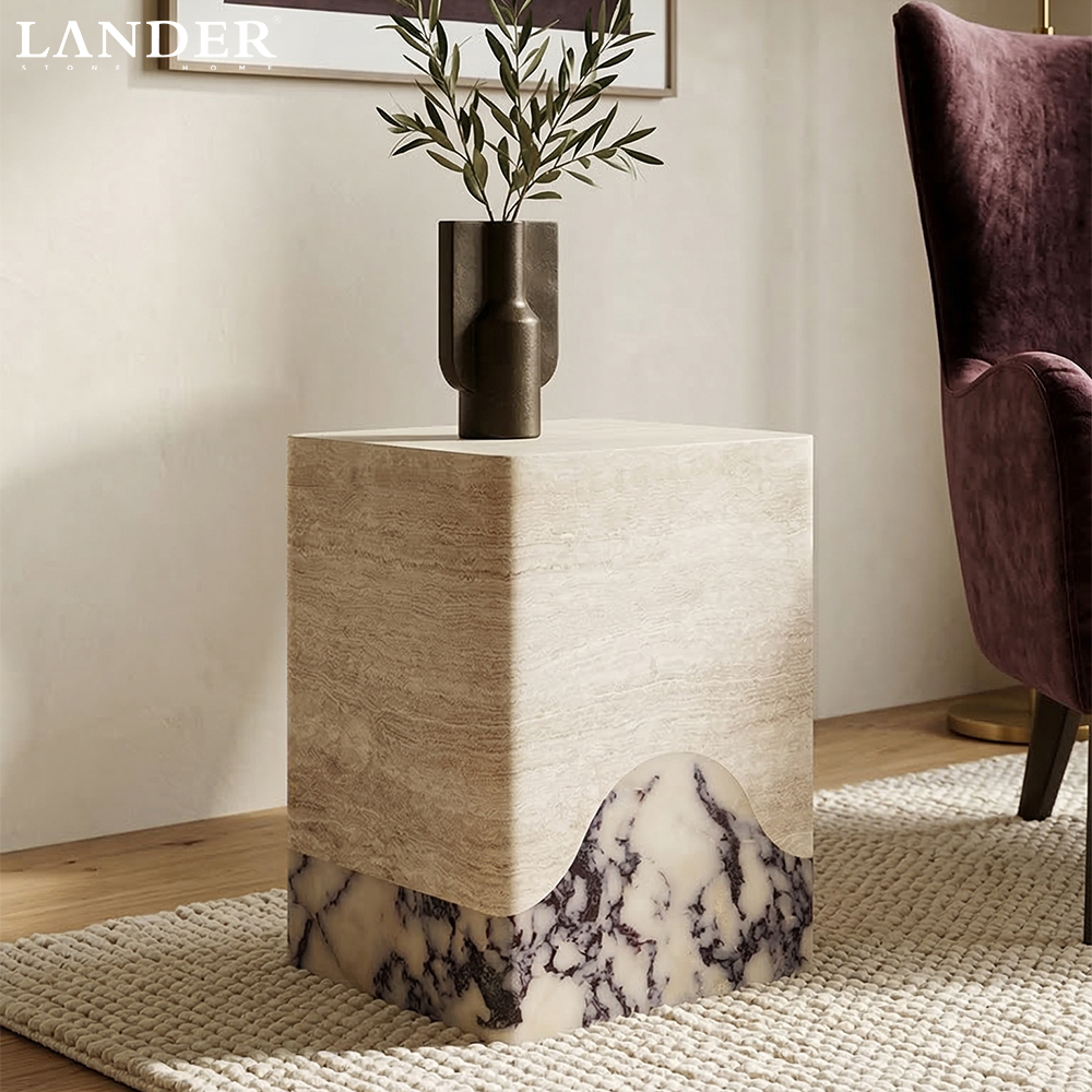 The Travertine and Calacatta Voila Marble Side Table is a striking, architectural piece that masterfully unites two highly sought-after natural stones. This sculptural design features a warm, monolithic upper section crafted from textured Travertine, which dramatically meets the lower plinth of Calacatta Voila Marble in a bold, sweeping curve. The juxtaposition of the Travertine’s earthy tones and linear texture with the Viola’s pristine white base and aggressive purple veining creates an unforgettable visual statement. Perfect as a bedside table, a luxurious accent piece, or a pedestal for showcasing art, this table brings unparalleled contrast, high-end texture, and timeless Italian luxury to any sophisticated interior.